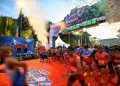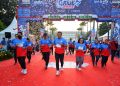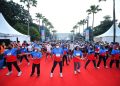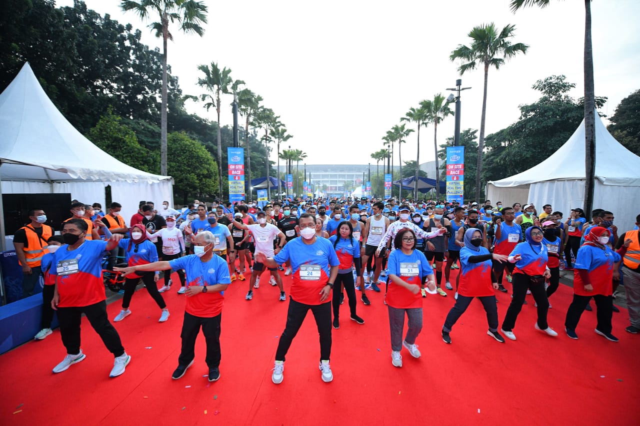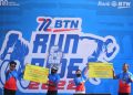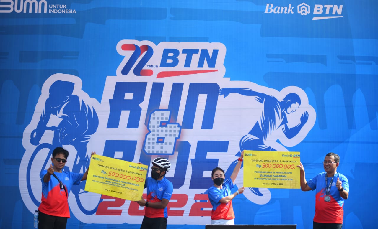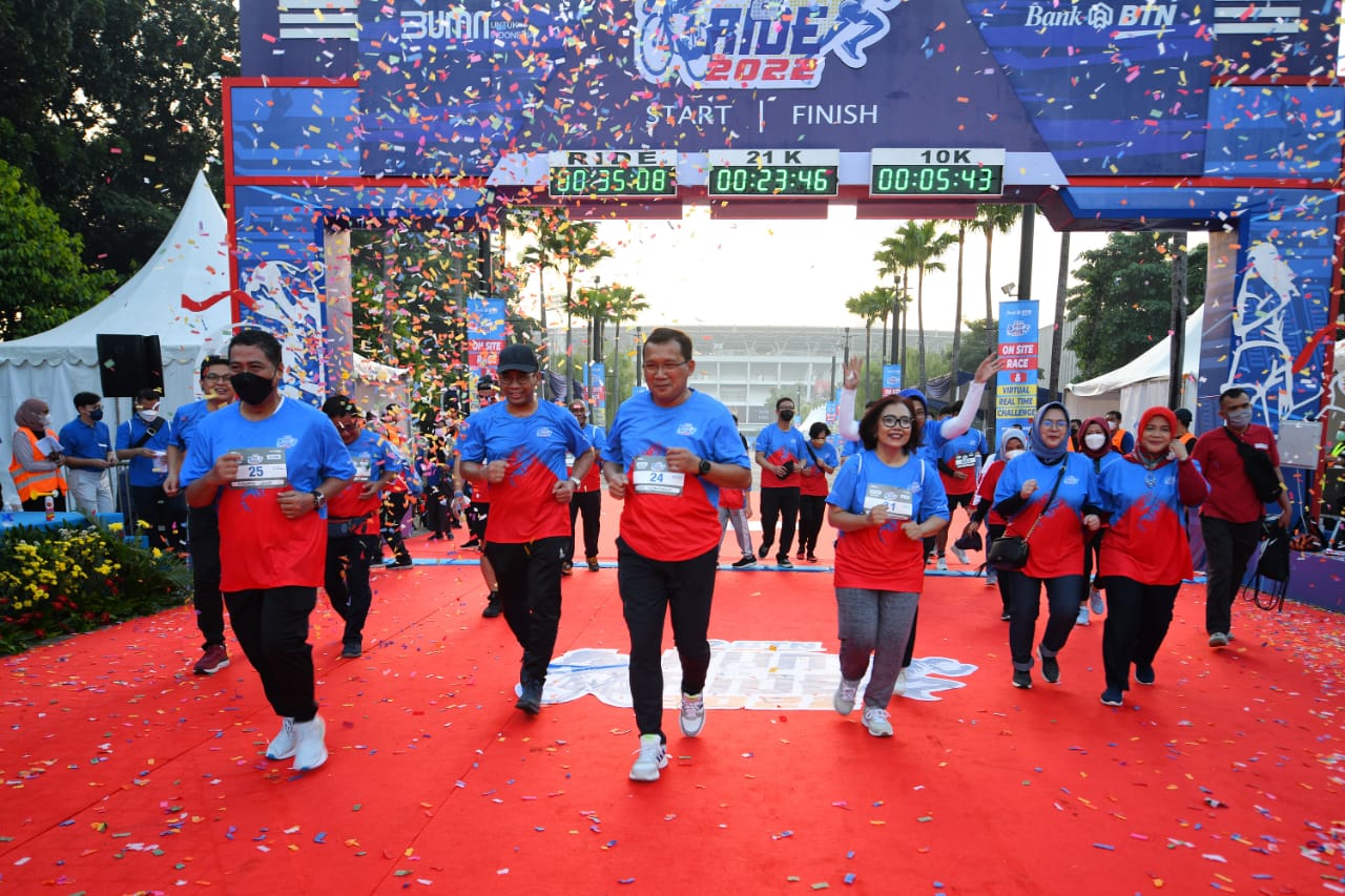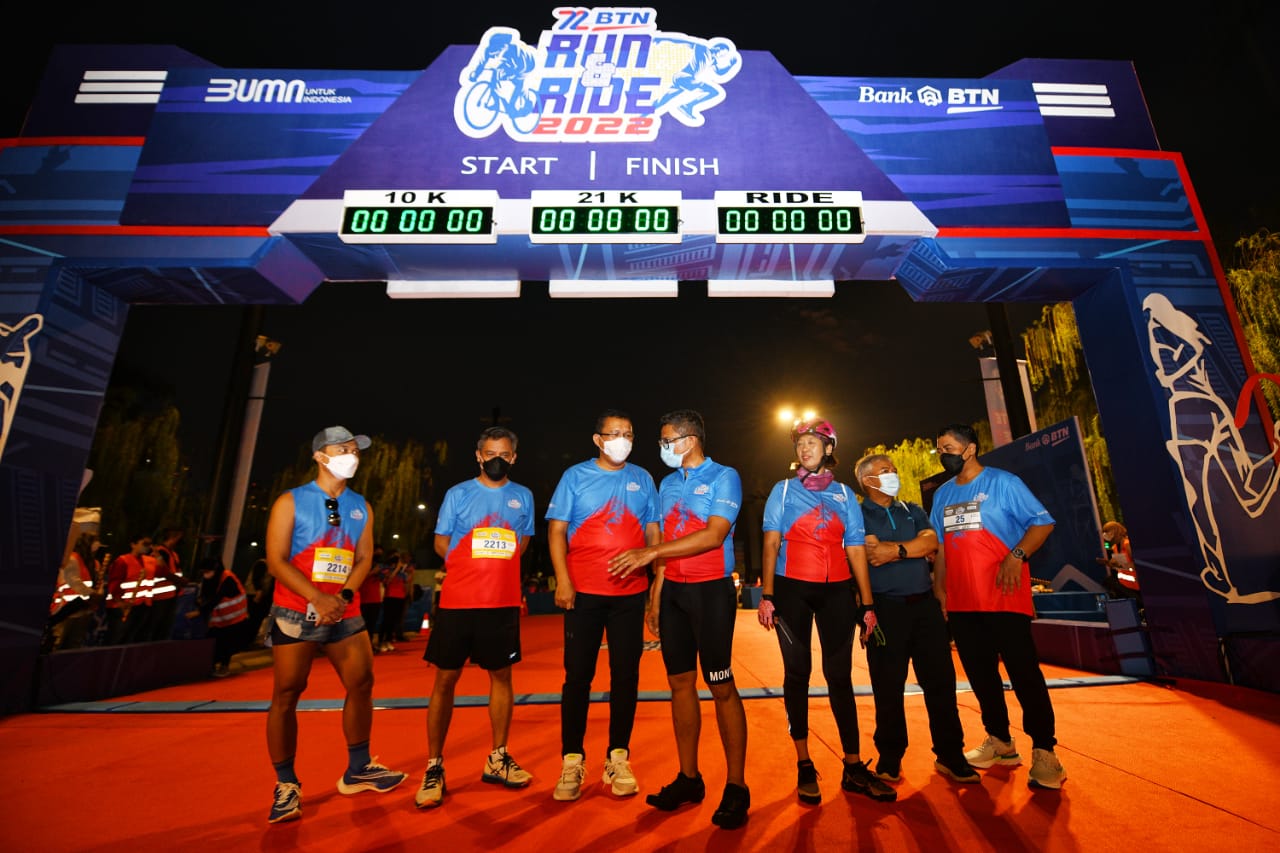 Wakil Menteri BUMN Pahala Nugraha Mansury berbincang dengan Direktur Utama Bank BTN Haru Koesmahargyo didampingi Wakil Direktur Utama Bank BTN Nixon LP Napitupulu dan jajaran Direksi Bank BTN saat ajang BTN Run & Ride 2022 di Plaza Barat Senayan, Jakarta (27/3). Sekitar 3.000 peserta ikut memeriahkan ajang yang digelar dalam rangka perayaan HUT BTN ke-72 Tahun. Dalam ajang ini berhasil terkumpul donasi sebesar Rp1 miliar dari setiap kilometer yang berhasil diselesaikan pelari dan pesepeda yang disumbangkan untuk mendukung pengelolaan rumah sampah di perumahan subsidi yang dibiayai BTN dan bantuan untuk penyandang disabilitas melalui Yayasan Penyandang Anak Cacat (YPAC).