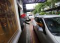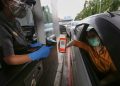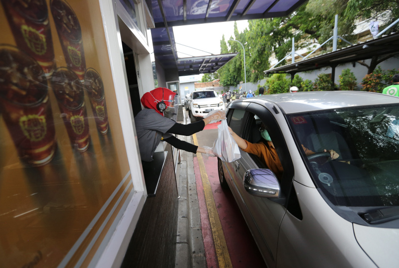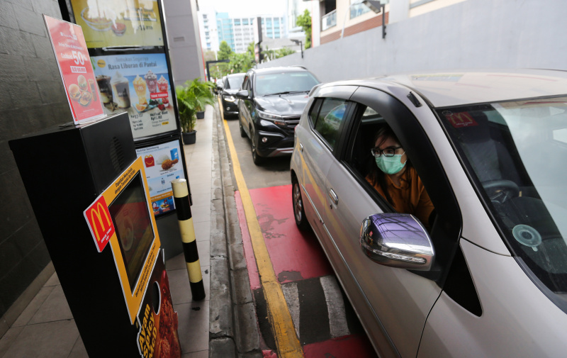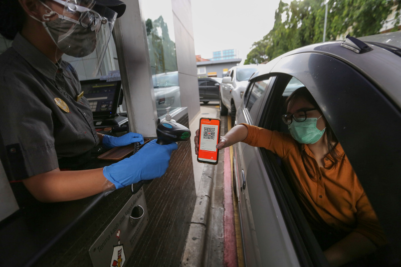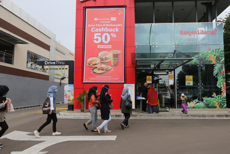 Pengunjung menggunakan scan QR Barcode saat pembayaran ketika promo 50% Cashback ShopeePay Day di Drive Thru McDonald’s Salemba, Jakarta Pusat, Selasa (15/12/2020)
