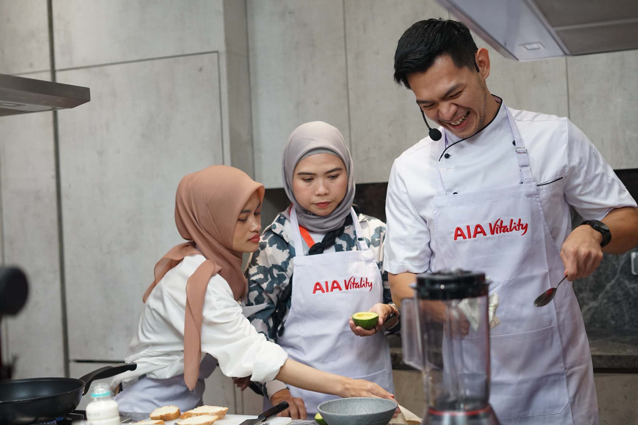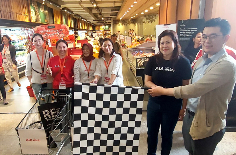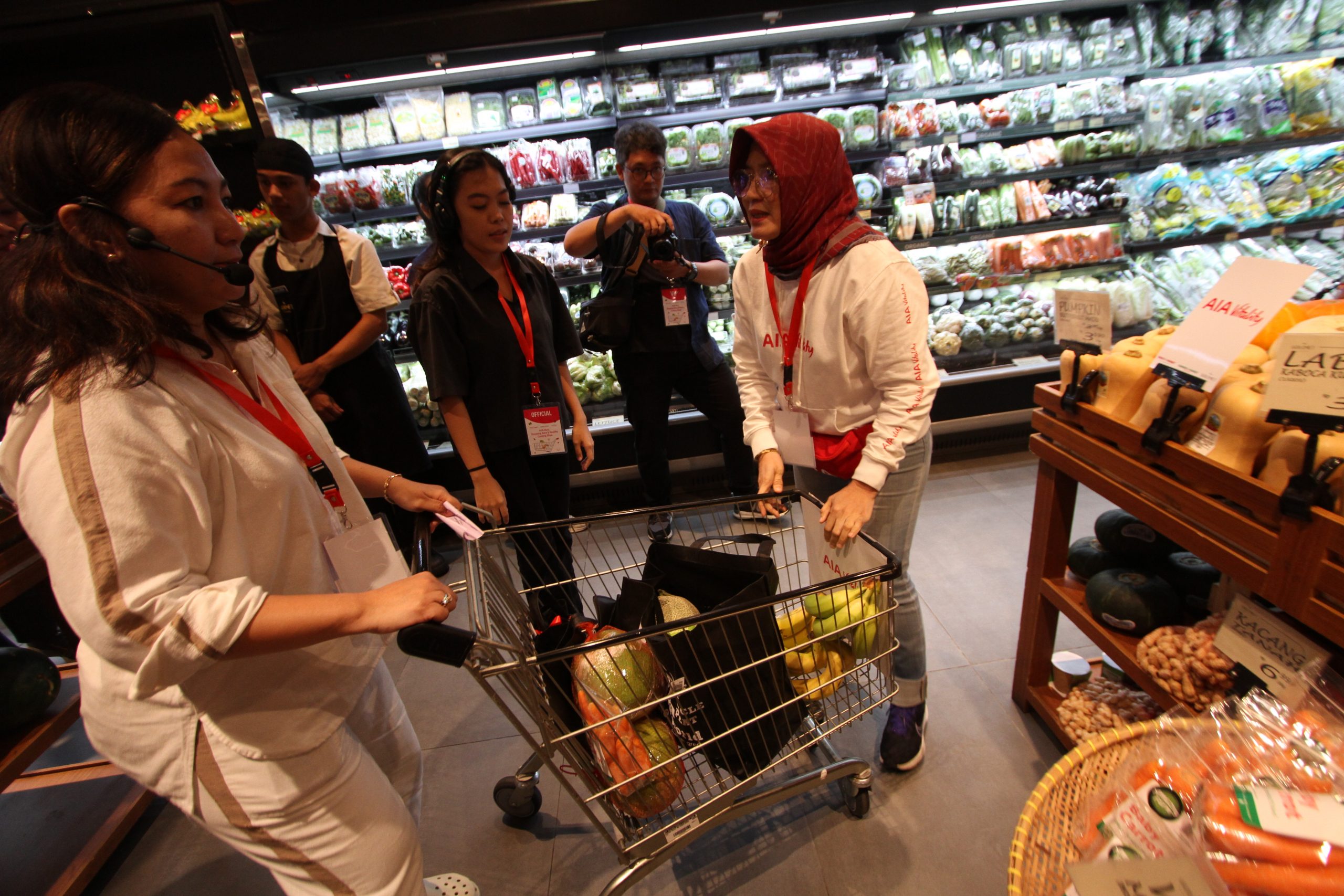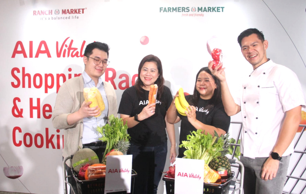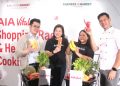 Head of AIA Vitality Jong Wie Siu (dua kiri), Head of Corporate Communication AIA, Lia Merdekawaty (dua kanan), CRM Ranch Market and Farmers Market, Michael Audrian Natawirja (kiri) dan Pemenang Masterchef Season 7, Jerry Andrean (kanan) berbincang bersama saat membuka acara AIA Vitality Shopping Race & Healthy Cooking Show yang diikuti oleh nasabah, tenaga pemasar, dan karyawan AIA di The Gourmet, Astha, Jakarta, Sabtu (20/1). Melalui program AIA Vitality, AIA menggandeng Ranch Market dan Farmers Market Group menghadirkan tantangan seru dan edukasi kepada peserta lewat berbelanja menghabiskan voucher senilai Rp1.000.000 dalam waktu 5 menit untuk membeli makanan sehat dan menemukan item tersembunyi sekaligus memberikan edukasi pengenalan masakan sehat dan mengolah makanan yang tepat guna mendorong masyarakat untuk membangun kebiasaan mengonsumsi makanan sehat.