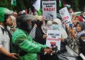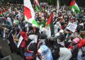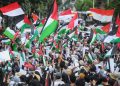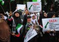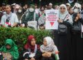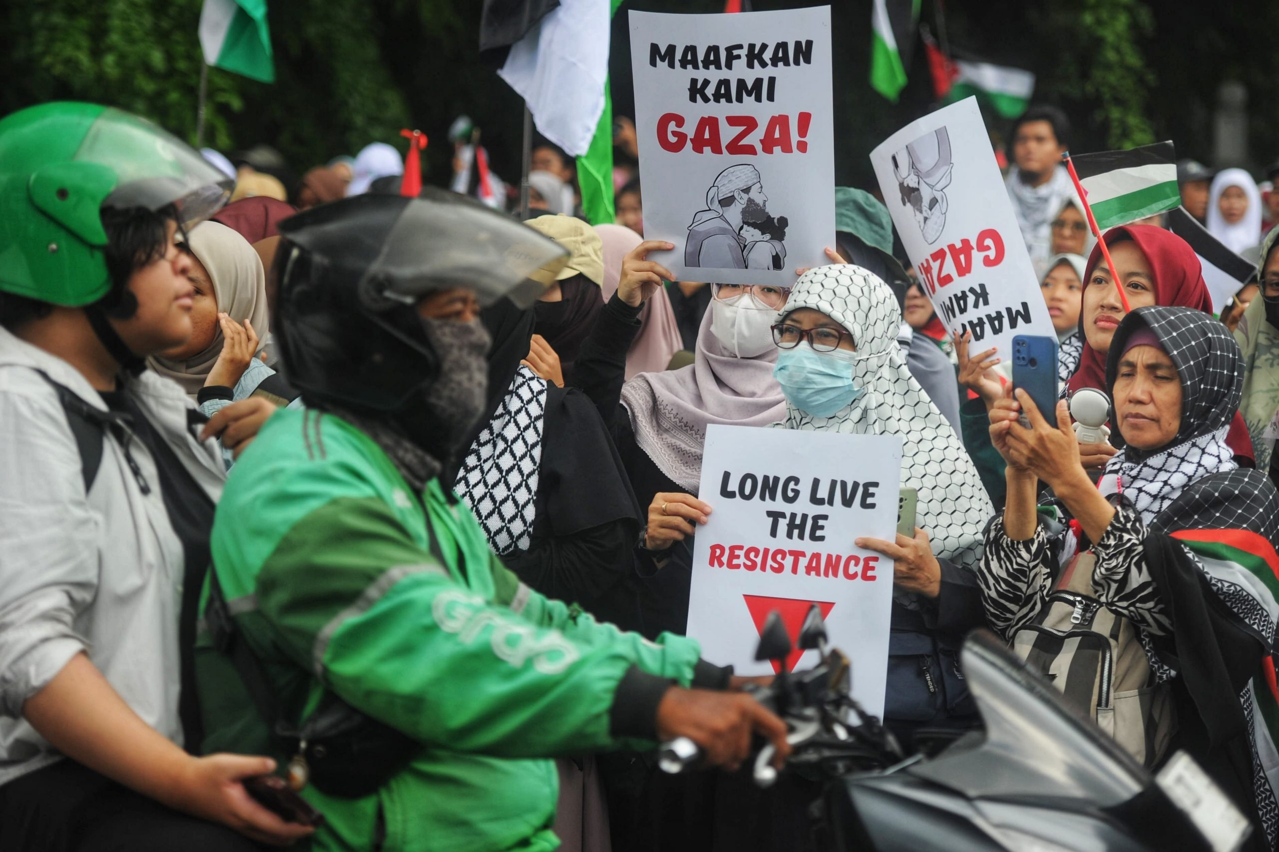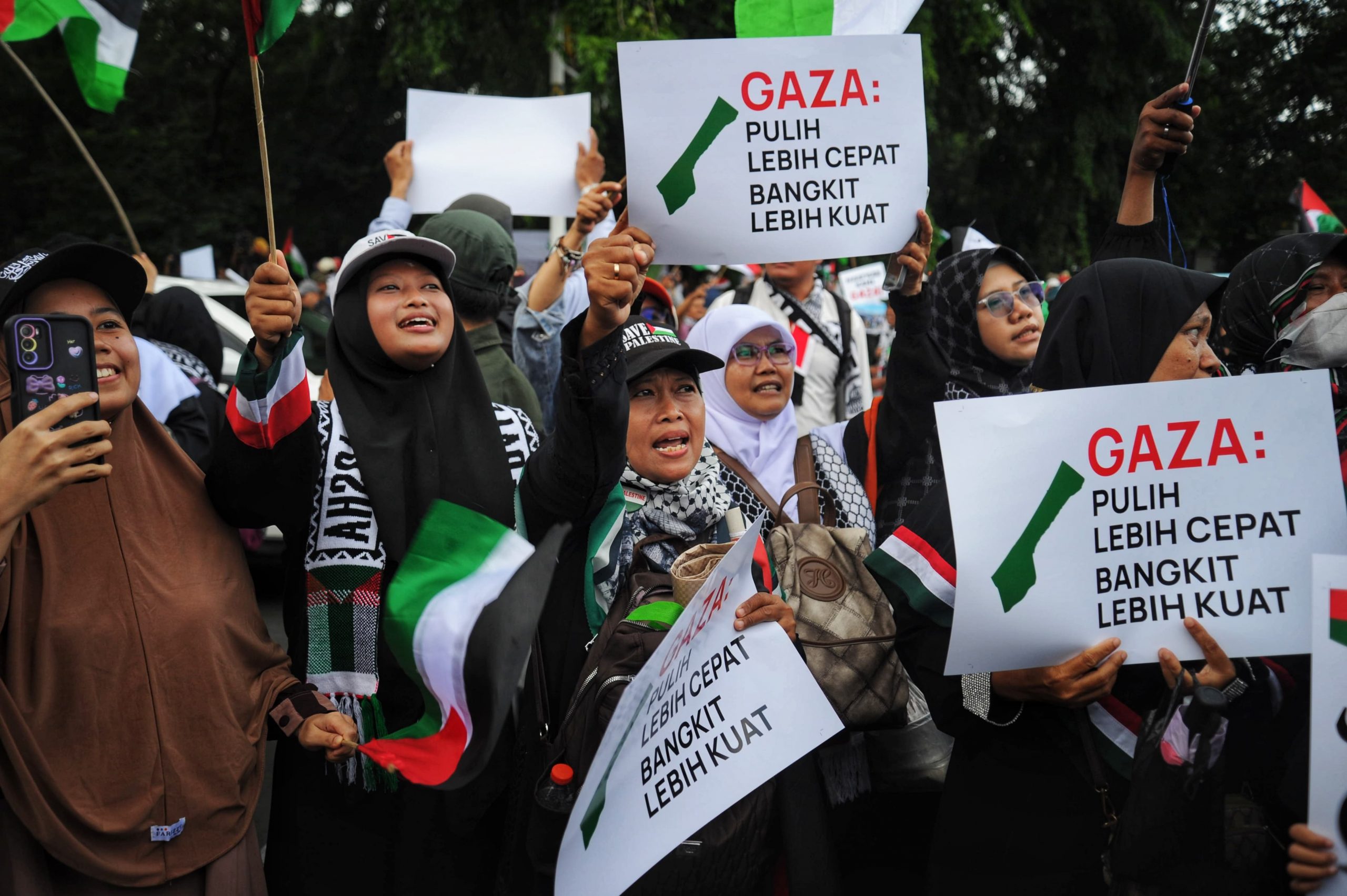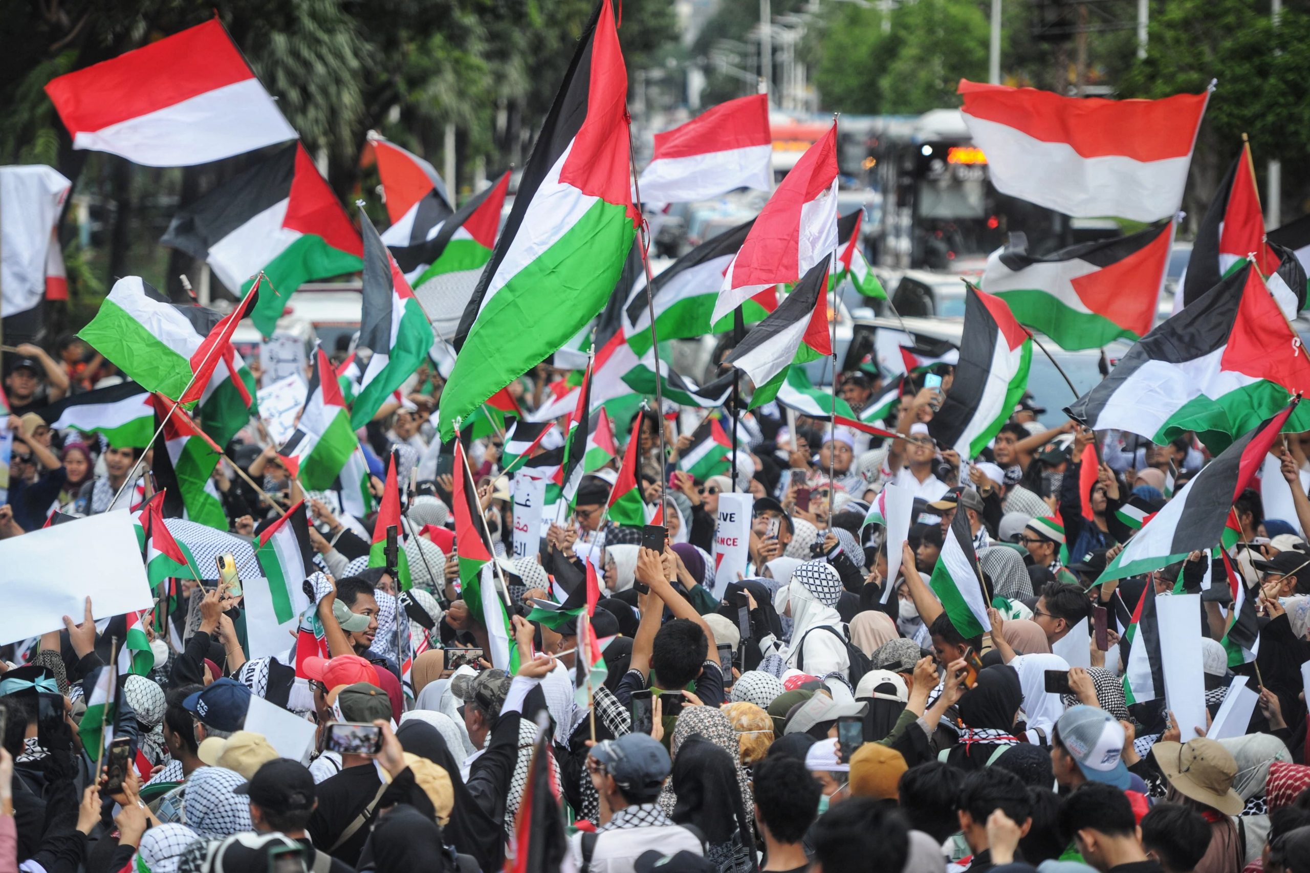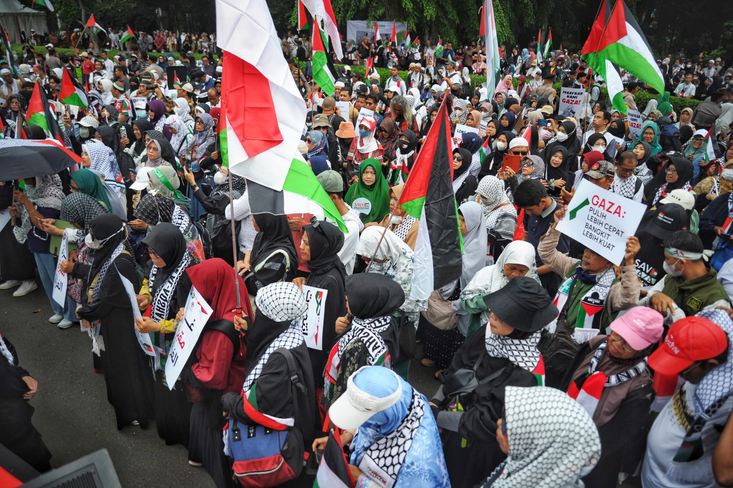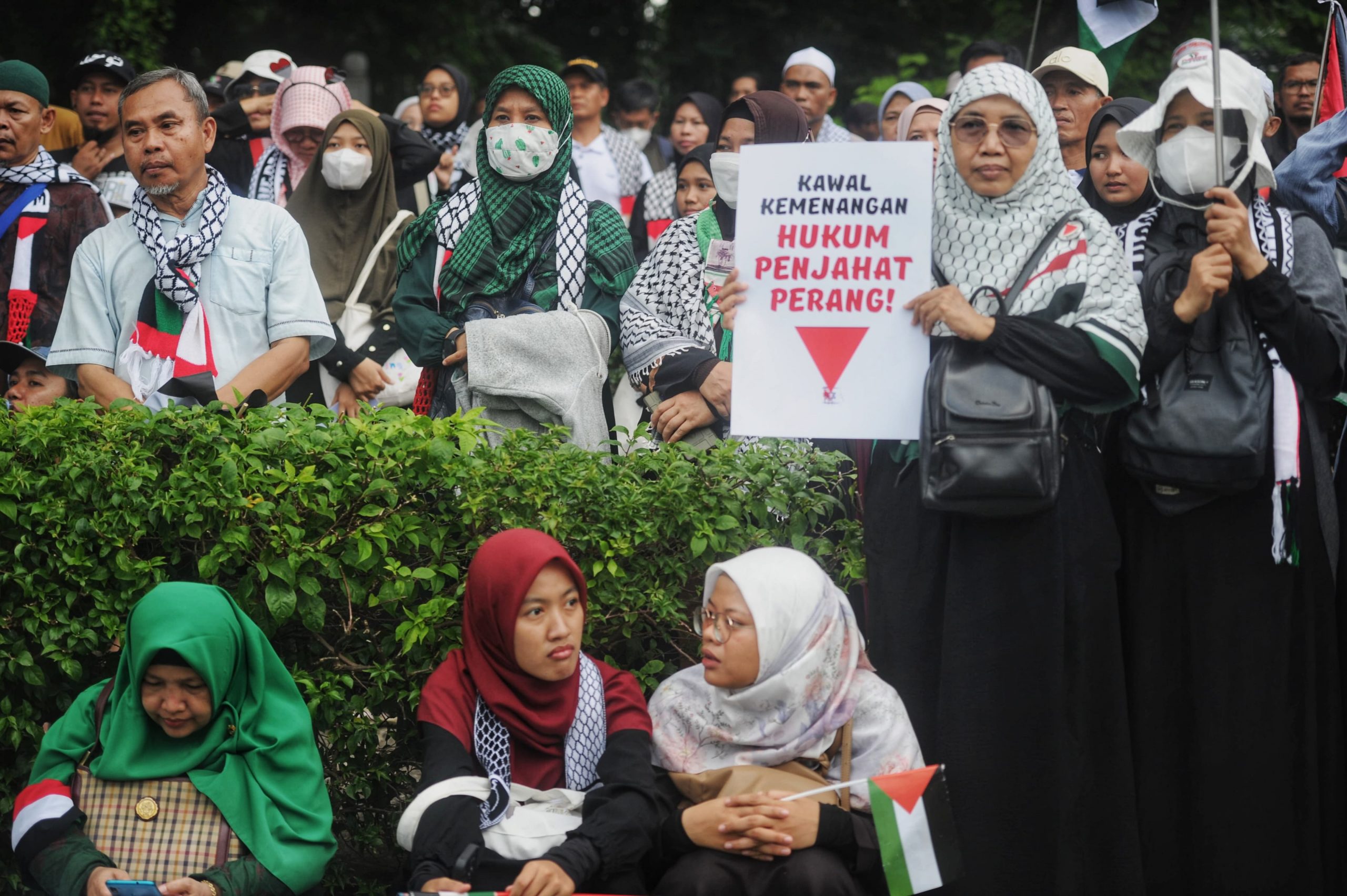 Massa yang tergabung dalam Aliansi Pemuda Indonesia untuk Palestina mengikuti aksi bela Palestina di depan Kedutaan Besar Amerika Serikat, Jakarta, Jumat (17/1/2025). Mereka menyatakan dukungan Indonesia atas kemenangan Gaza setelah disepakatinya gencatan senjata antara Hamas dan Israel yang akan diberlakukan pada Minggu (19/1).