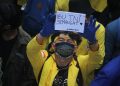 Sejumlah demonstran berunjuk rasa menolak pengesahan Undang-undang Cipta Kerja di Jalan Medan Merdeka Barat, Jakarta, Selasa (20/10/2020). Aksi gabungan buruh, petani, mahasiswa, dan pelajar yang dilakukan bersamaan dengan setahun pemerintahan Presiden Joko Widodo dan Wakil Presiden Ma’ruf Amin itu meminta Presiden mengeluarkan Perppu pencabutan UU tersebut karena dinilai kurang berpihak pada rakyat kecil.