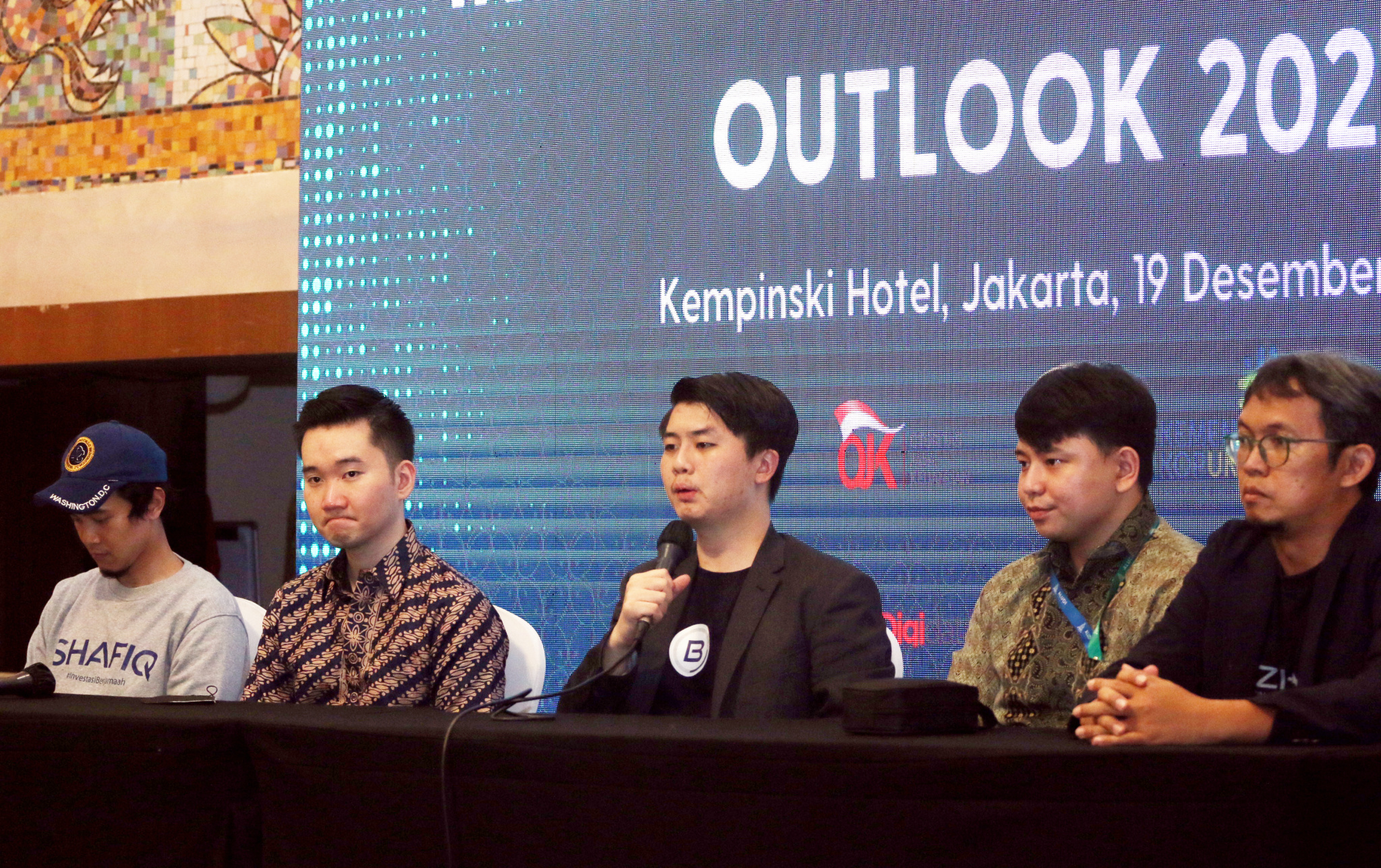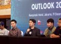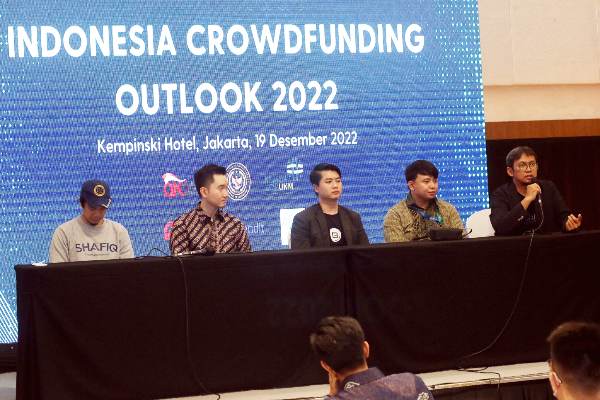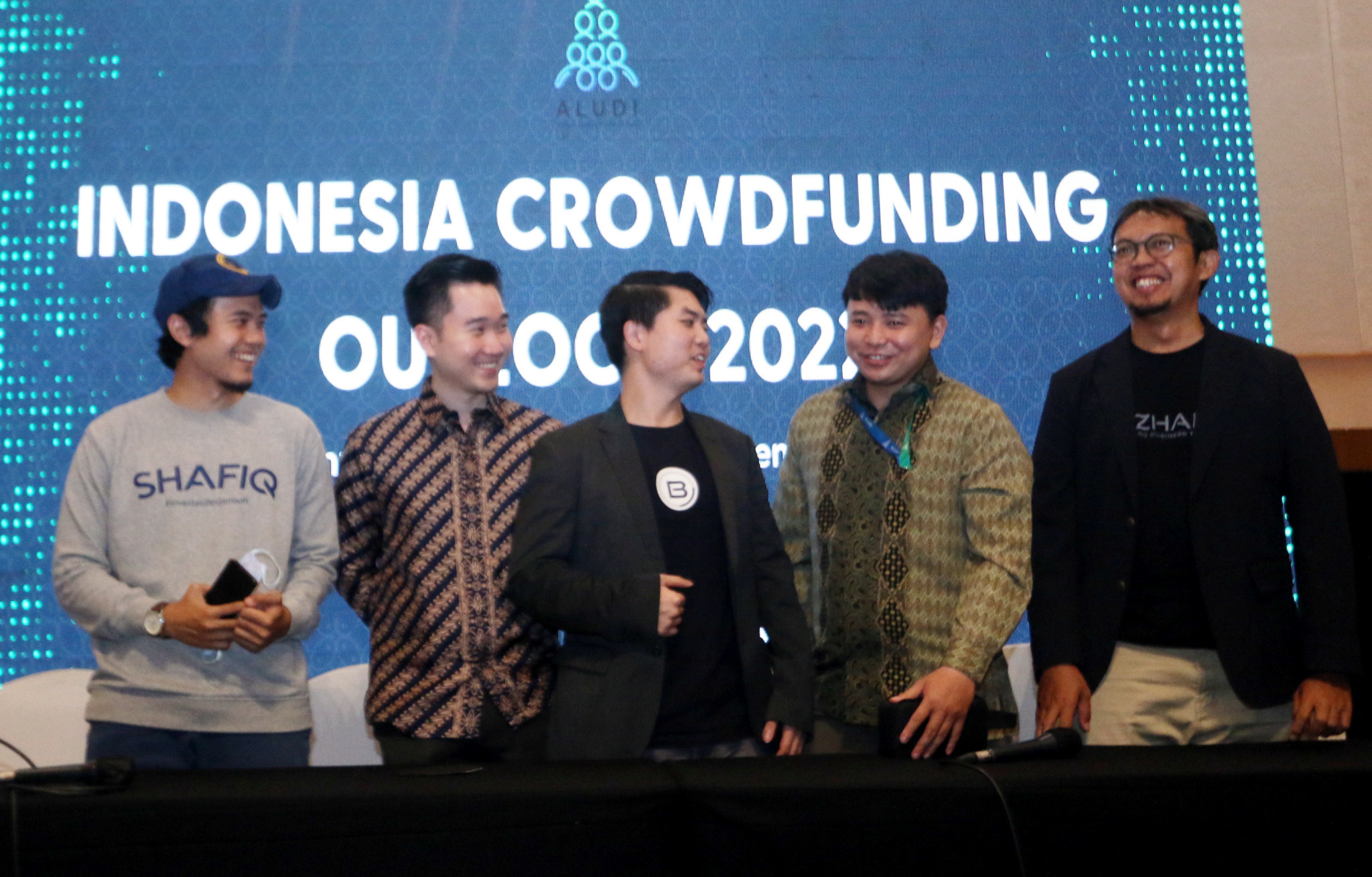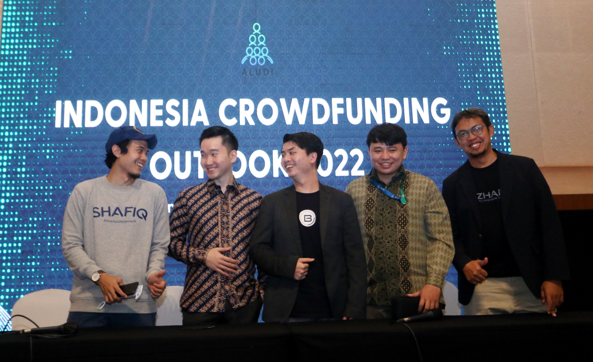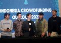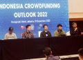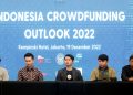 Dari Kiri : CEO Shafiq Kevin, Bendahara Umum ALUDI & CEO LandX Romario Sumargo, Wakil Ketua ALUDI & CEO Bizhare Heinrich Vincent, Policy Director ALUDI Calvin Jonathan Dan CFO Bizhare Gatot Adhiwibowo berbincang usai prescon Indonesia Crowdfunding Outlook 2022 kepada awak media dia Jakarta, Senin (19/12). Asosiasi Layanan Urun Dana Indonesia (ALUDI) menilai bahwa potensi industri portfolio investasi di Securities Crowdfunding (SCF) atau urun dana di Indonesia cukup besar. Hal ini terlihat sejak munculnya pada tahun 2020 konftribusi portfolio investasi SCF telah mencapai sebesar 6,54 persen dari seluruh portfolio investasi di Indonesia dengan nilai total dana yang dihimpun per 17 Desember 2022 sebanyak Rp 727 miliar.