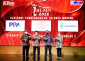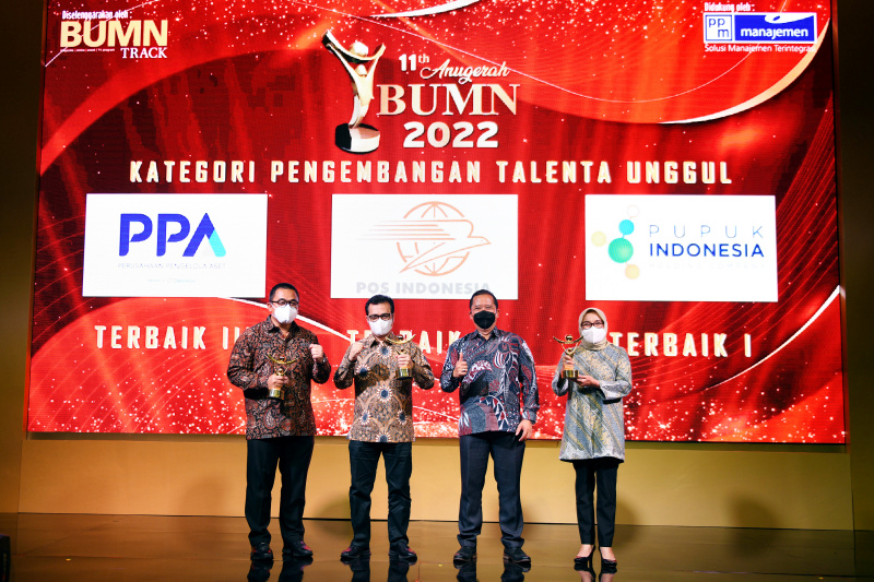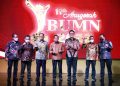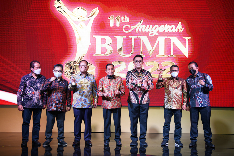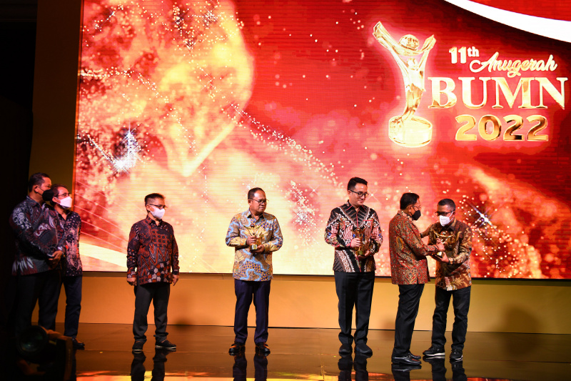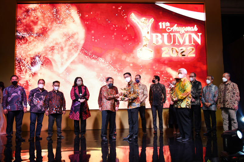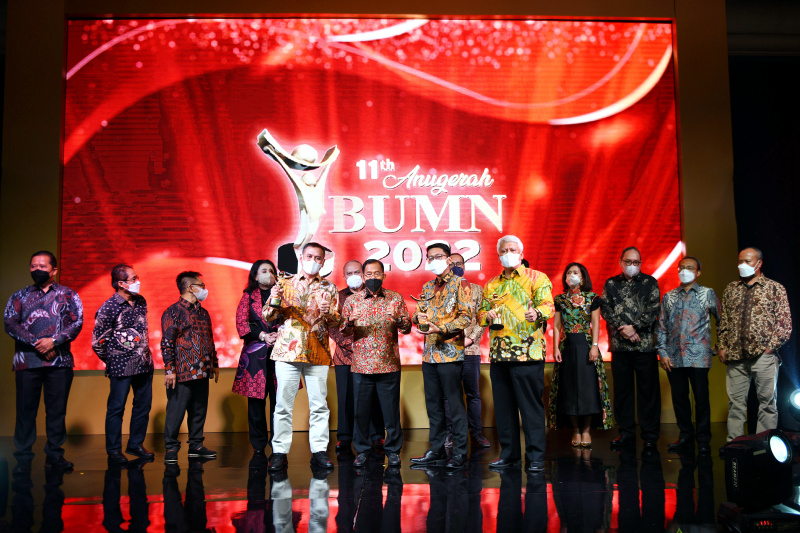 Menteri BUMN 1998-1999 dan Dewan Pakar BUMN TRACK Tanri Abeng didampingi Pemimpin Redaksi BUMN TRACK Akhmad Kusaeni menyerahkan penghargaan kepada para pemenang Anugerah BUMN 2022 yang digelar di Jakarta, Kamis (24/03/2022). BUMN Track didukung PPM Manajemen kembali menggelar Anugerah BUMN 2022 sebagai bentuk apresiasi kepada para CEO dan perusahaan BUMN yang telah berkiprah bagi pertumbuhan kinerja perusahaan. Apresiasi ini diberikan kepada BUMN yang telah survive melewati masa-masa sulit di era disrupsi sekaligus gigih berjibaku menghadapi pandemi.