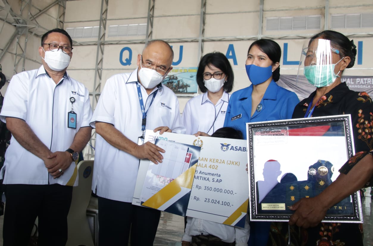 Direktur Utama PT ASABRI (Persero) Wahyu Suparyono serahkan langsung manfaat program Jaminan Kecelakaan Kerja berupa Santunan Risiko Kematian Khusus, Nilai Tunai Tabungan Asuransi dan beasiswa kepada ahli waris prajurit KRI Nanggala 402 didampingi Komisaris Utama Fary Djemi Francis dan Direktur SDM dan Hukum Rizka Moeslichan di Hanggar Lanudal Juanda, Surabaya, 29 April 2021. PT ASABRI (Persero) pada Kamis (29 April 2021) menyerahkan manfaat program Jaminan Kecelakaan Kerja (JKK) berupa Santunan Risiko Kematian Khusus, Nilai Tunai Tabungan Asuransi, dan beasiswa kepada ahli waris dari pahlawan KRI Nanggala 402 yang gugur karena hilang kontak di Selat Bali.