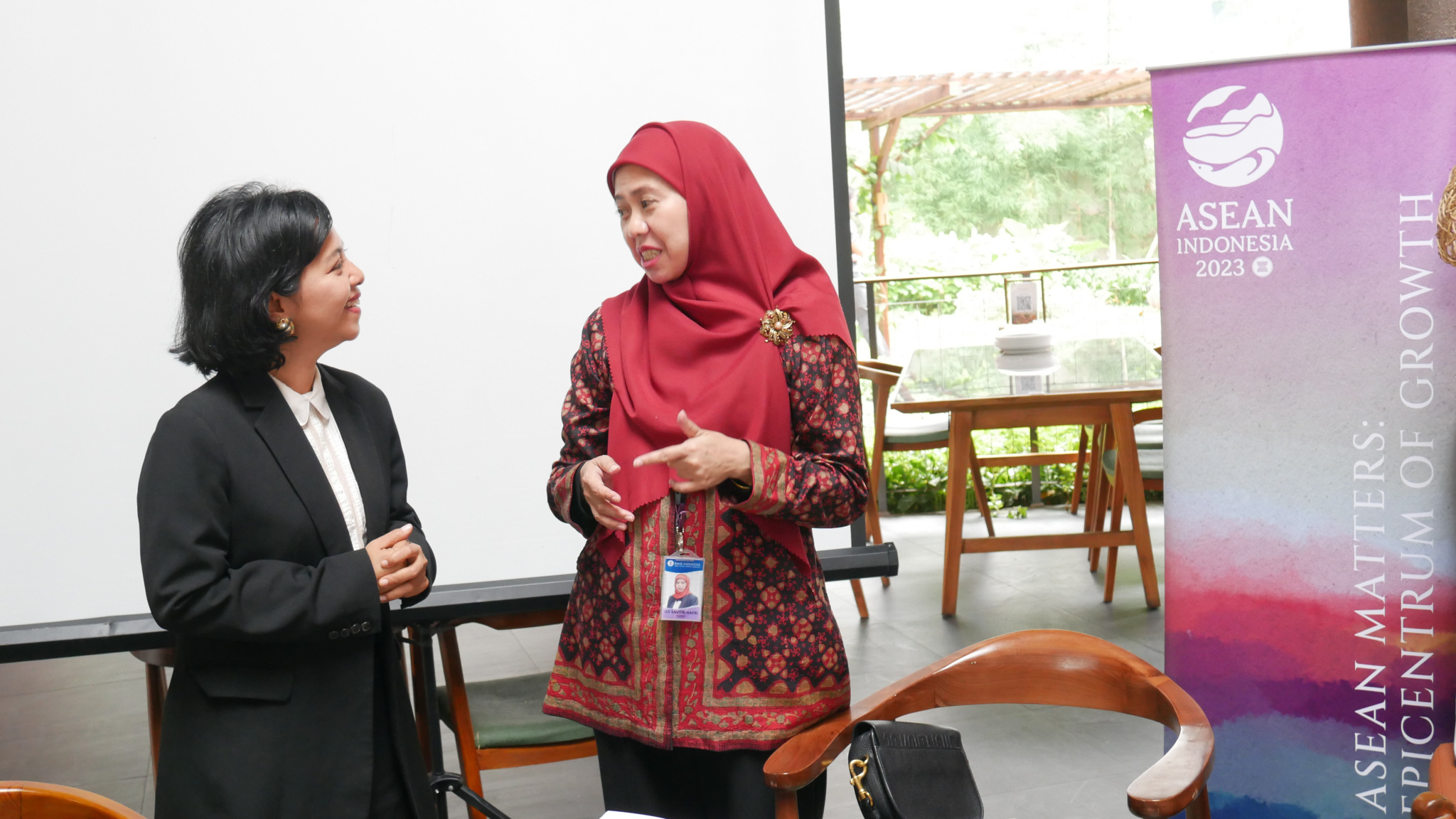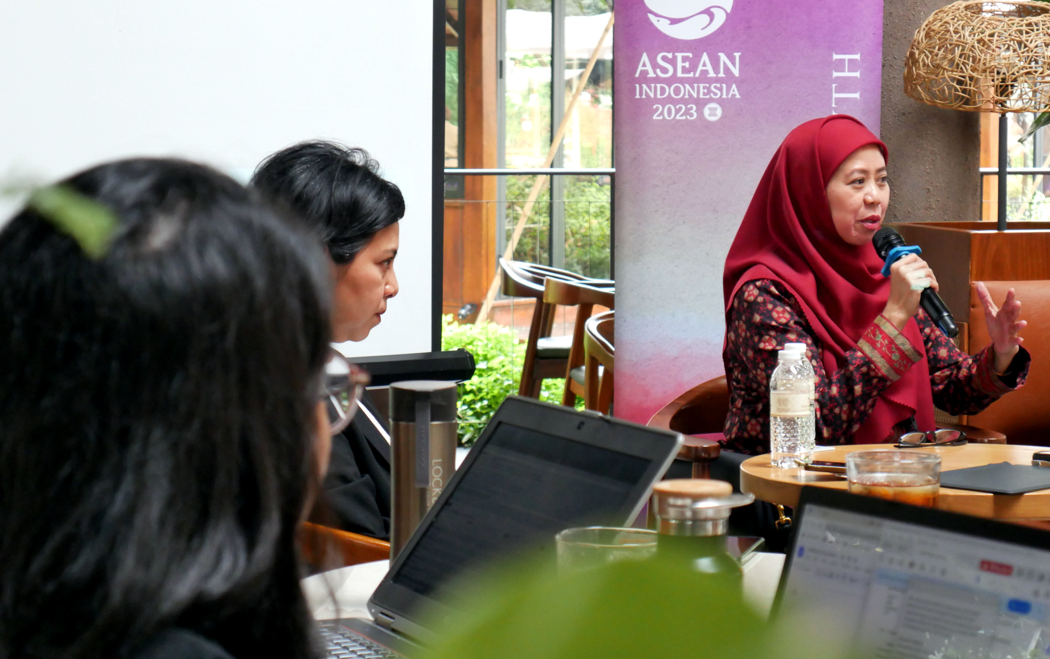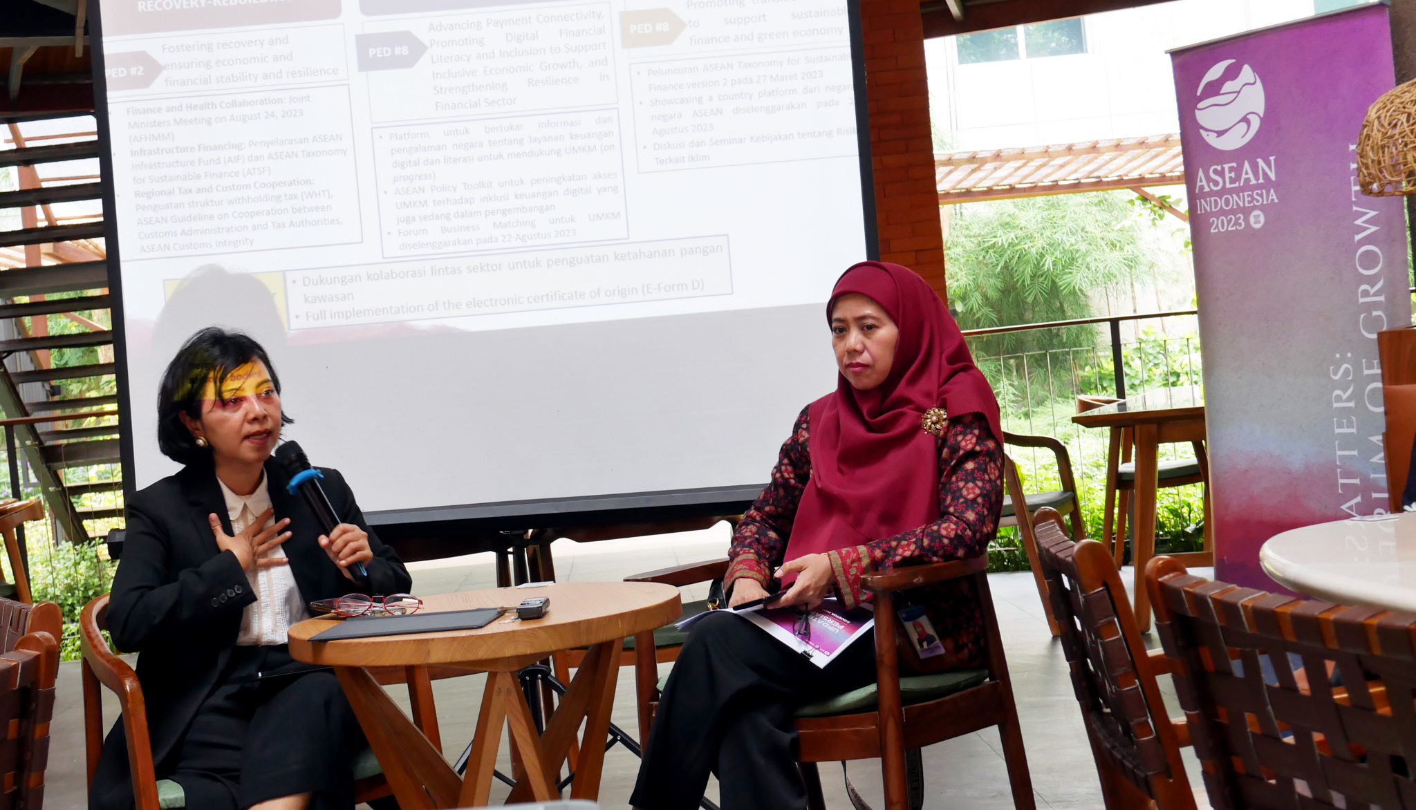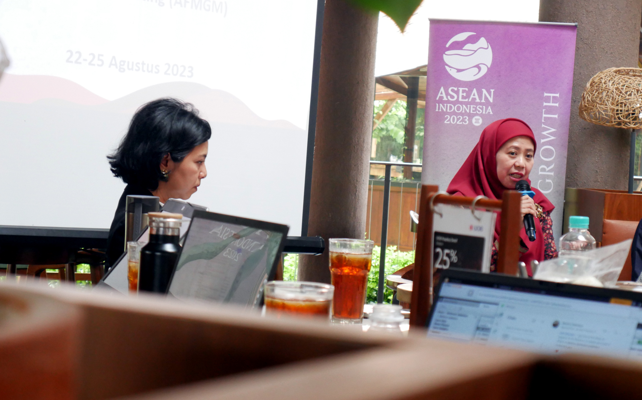 Kepala Pusat Kebijakan Regional dan Bilateral Kemenkeu Yogi Rahmayanti (kiri) bersama Direktur Departemen Internasional BI Iss Savitri Hafid (kanan) saat media briefing ASEAN Finance Ministers and Central Bank Governors Meeting (AFMGM) di Jakata, Senin (21/8/2023). ASEAN Finance Ministers and Central Bank Governors Meeting (AFMGM) kedua akan berlangsung pada 22-25 Agustus 2023. terdapat 10 Negara yang merupakan anggota ASEAN, diantaranya Indonesia, Singapura, Malaysia, Brunei Darussalam, Filipina, Kamboja, Vietnam, Thailand, Laos, dan Myanmar. Selain itu, Timor-Leste juga turut menghadiri pertemuan ini pertama kalinya dalam kapasitasnya sebagai pengamat di jalur keuangan, sejak disetujuinya Timor Leste sebagai anggota ASEAN ke sebelas pada 2022.