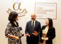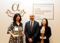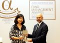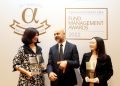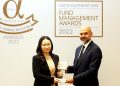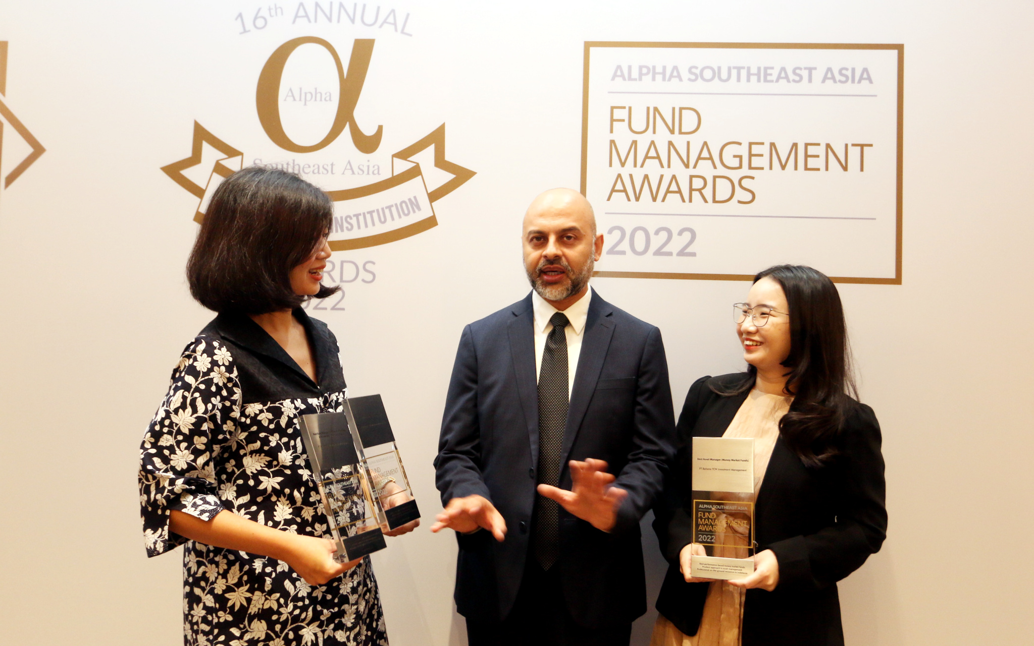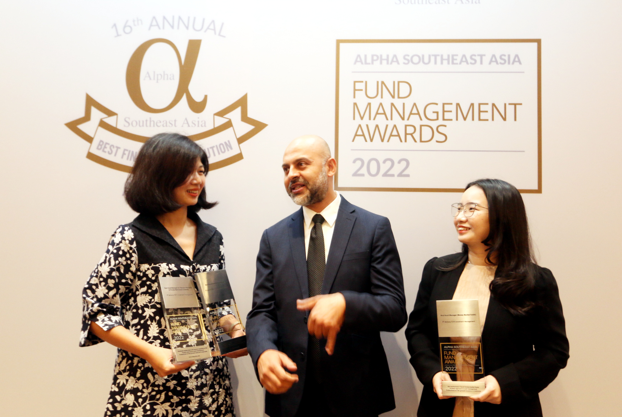 Direktur PT Bahana TCW Investment Management (Bahana TCW) Danica Adhitama (kiri) didampingi Money Market Fund Manager Bahana TCW, Michelle Prioven Ma (kanan) berbincang dengan CEO Alpha Southeast Asia Singapura, Shiddiq Bazarwala seusai menerima penghargaan dalam ajang 13th Annual Alpha Southeast Asia Fund Management Awards 2022 di Jakarta, Kamis (8/9/2022). Bahana TCW berhasil memperoleh tiga penghargaan dalam ajang ini untuk kategori Best Overall Asset & Fund Manager untuk kedelapan kali secara beruntun, Best Fund Manager for Pension Mandates & Private Retirement Schemes untuk ketiga kalinya secara beruntun dan Best Asset Manager (Money Market Funds).