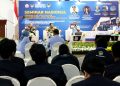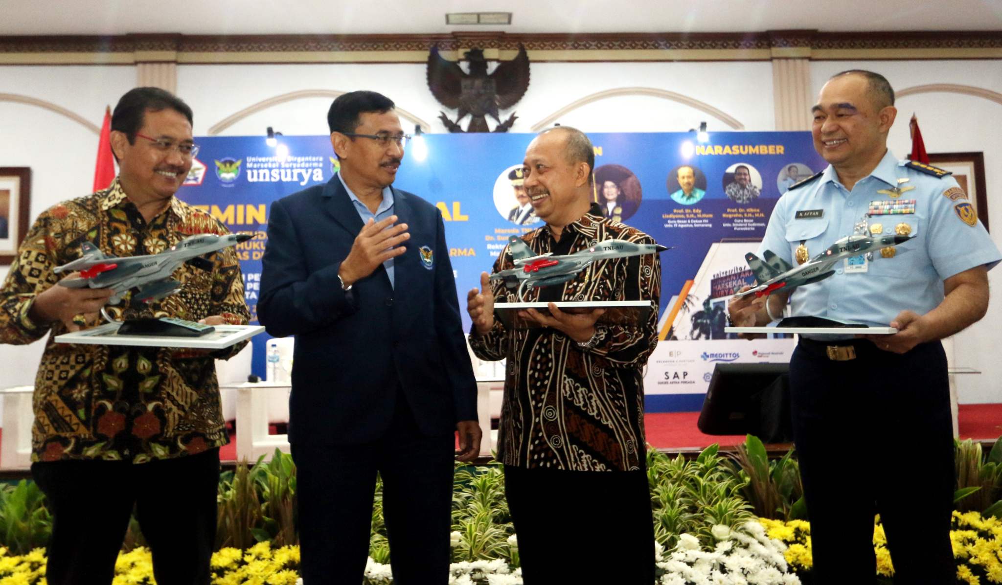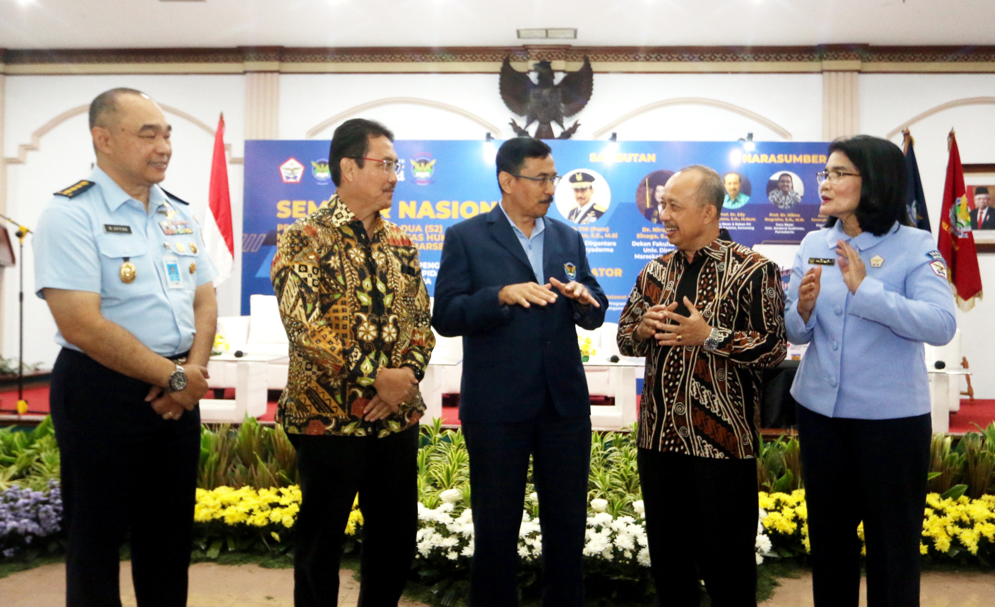 Rektor Universitas Dirgantara Marsekal Suryadarma (Unsurya), Marsda TNI (Purn) Dr. Sungkono (tengah) didampingi oleh Dekan Fakultas Hukum Unsurya, Dr. Niru Anita Sinaga (kanan) berbincang dengan Guru Besar dan Dekan Fakultas Hukum Universitas 12 Agustus Semarang, Prof. Edy Lisdiyono (kedua kanan) Guru Besar Universitas Jenderal Soedirman Purwokerto, Prof. Dr. Hibnu Nugroho (kedua kiri) dan Paban III/Tahwildirga Spotdirga Kolonel Pnb Nurtantio Affan saat membuka seminar nasional di Jakarta, Selasa (16/05/2023). Unsurya menyelenggarakan seminar nasional dengan tema “Implementasi Pengaturan Dan Pengoperasian Drone Ditinjau Dari Perspektif Hukum Pidana, Hukum Perdata Dan Hukum Udara,” guna memberikan perspektif hukum terhadap pengimplementasian dan penggunaan drone untuk tujuan non militer seperti hobi dan rekreasi serta korporasi.