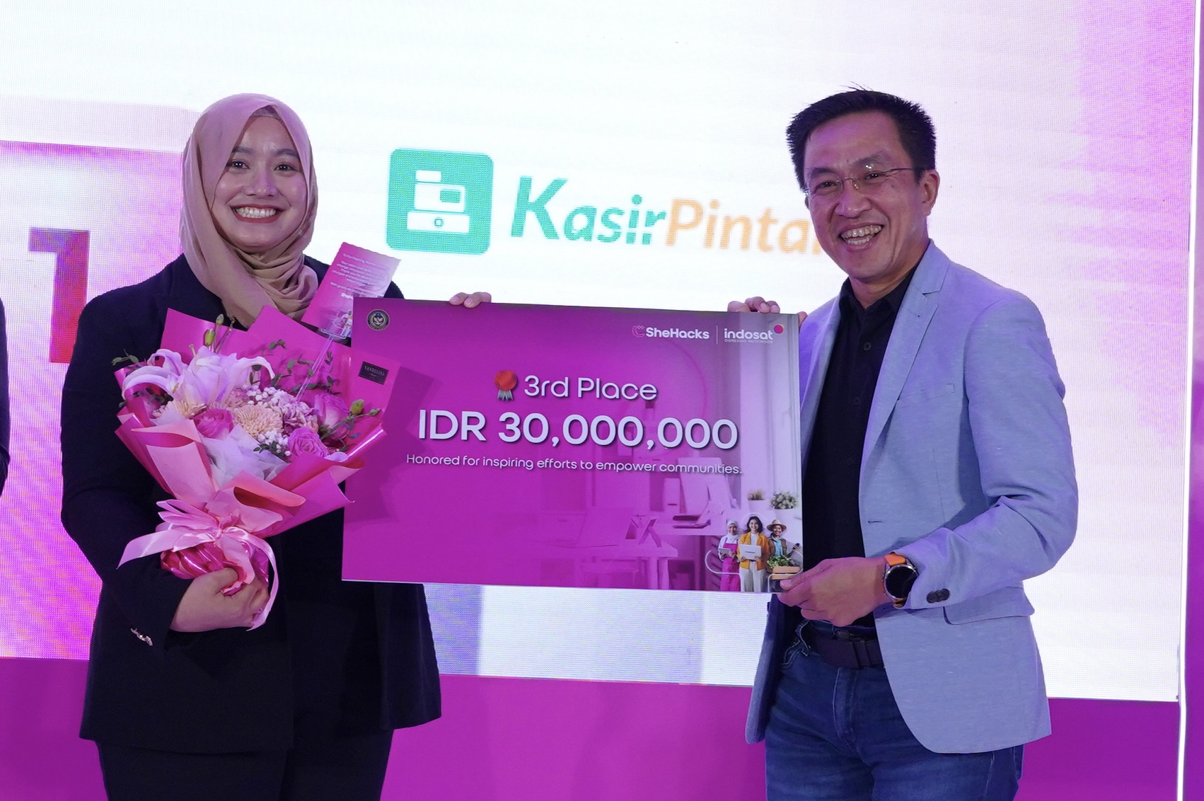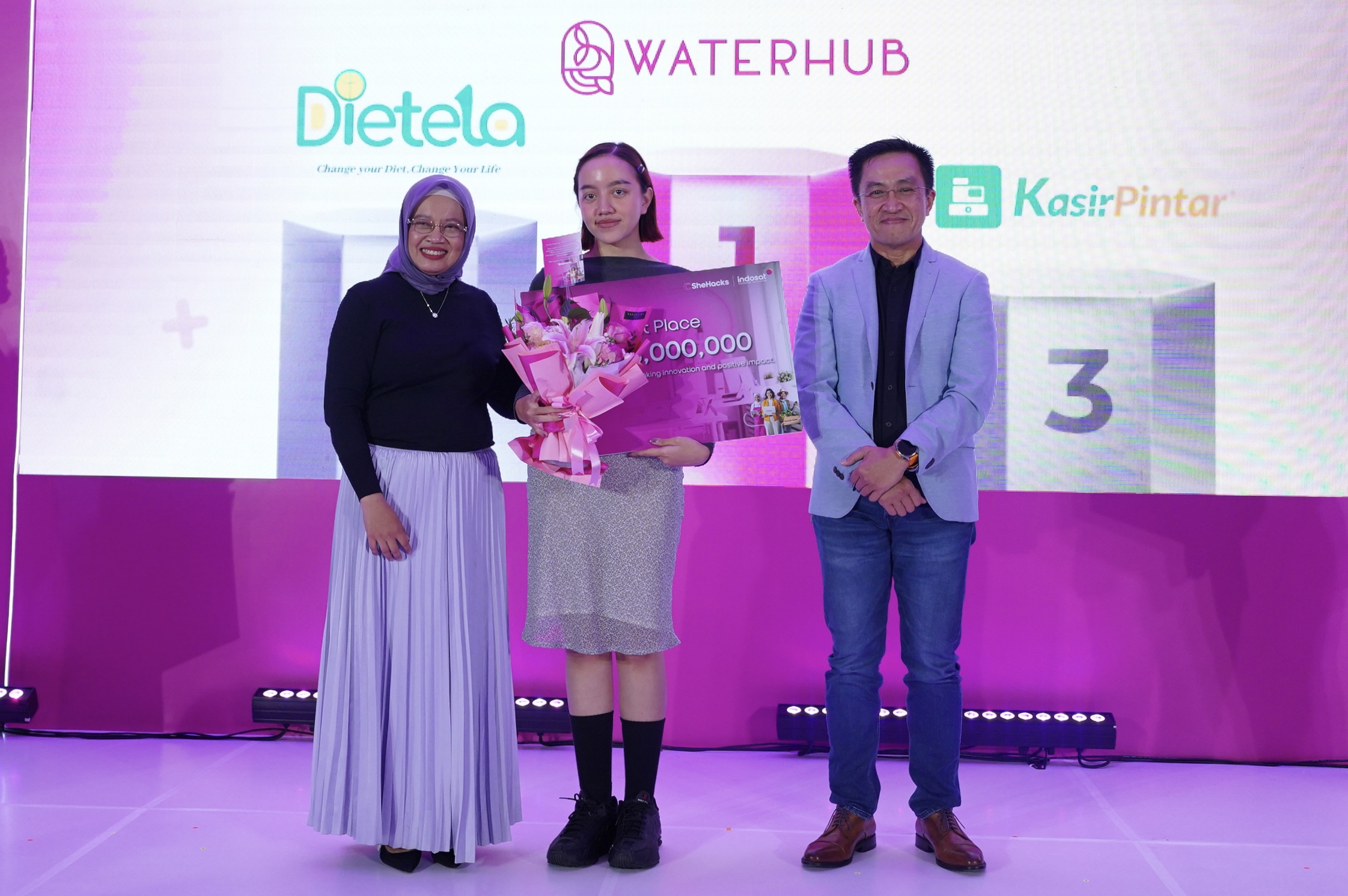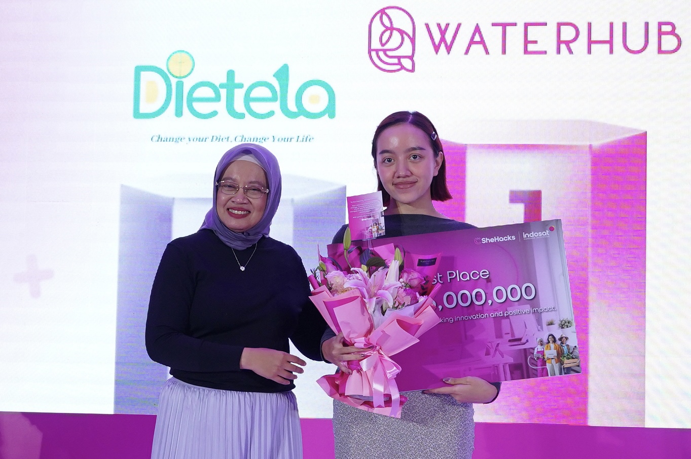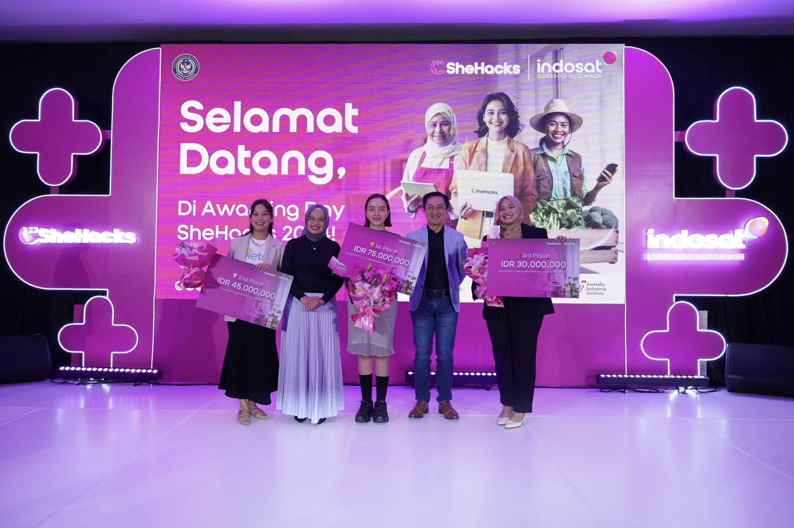 Irsyad Sahroni Director & Chief Human Resources Officer Indosat (kedua dari kanan) dan Reski Damayanti Chief Legal & Regulatory Officer (kedua dari kiri) bersama para pemenang SheHacks 2024 yang berlangsung di Jakarta, Selasa (10/12). Indosat dengan bangga mengumumkan tiga perusahaan rintisan terbaik yang dipimpin oleh perempuan muda inspiratif sebagai pemenang kompetisi SheHacks 2024. Setelah melalui perjalanan sembilan bulan dengan pelatihan intensif, para juri telah memilih Waterhub (sistem manajemen air), Dietela (platform kesehatan dan nutrisi perempuan), dan KasirPintar (aplikasi kasir berbasis cloud) sebagai inovasi terbaik. Ketiganya dinilai mampu memberikan dampak nyata yang berkelanjutan bagi masyarakat.