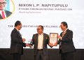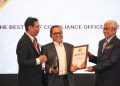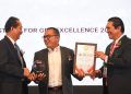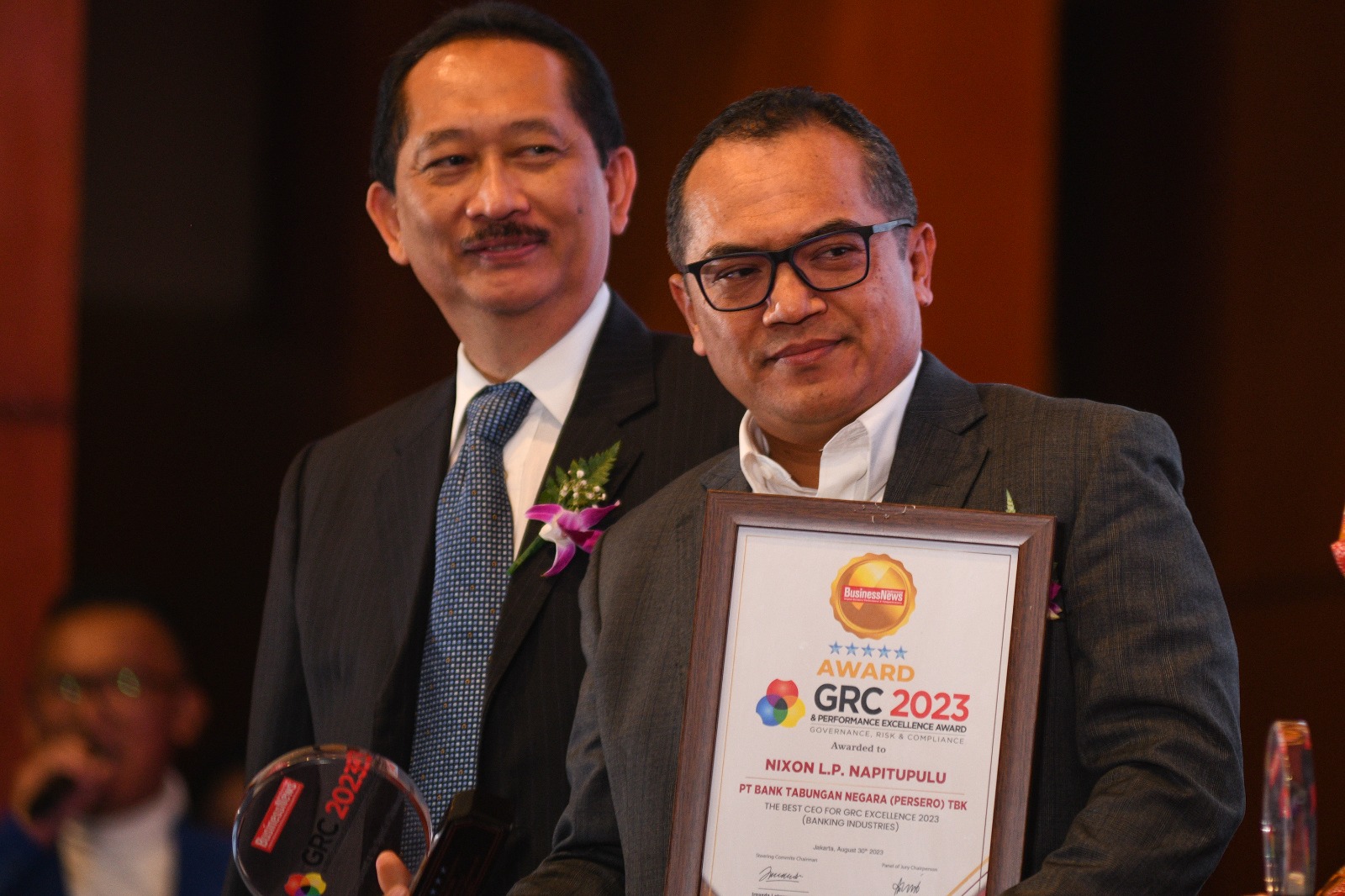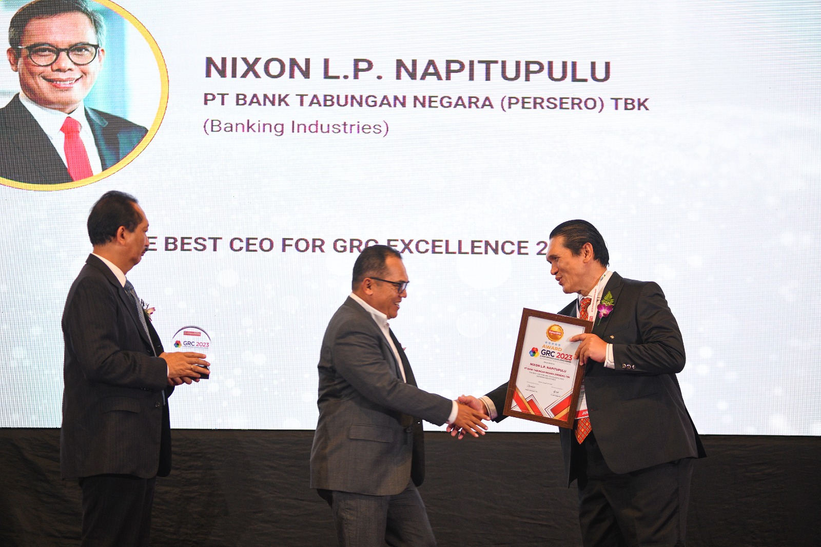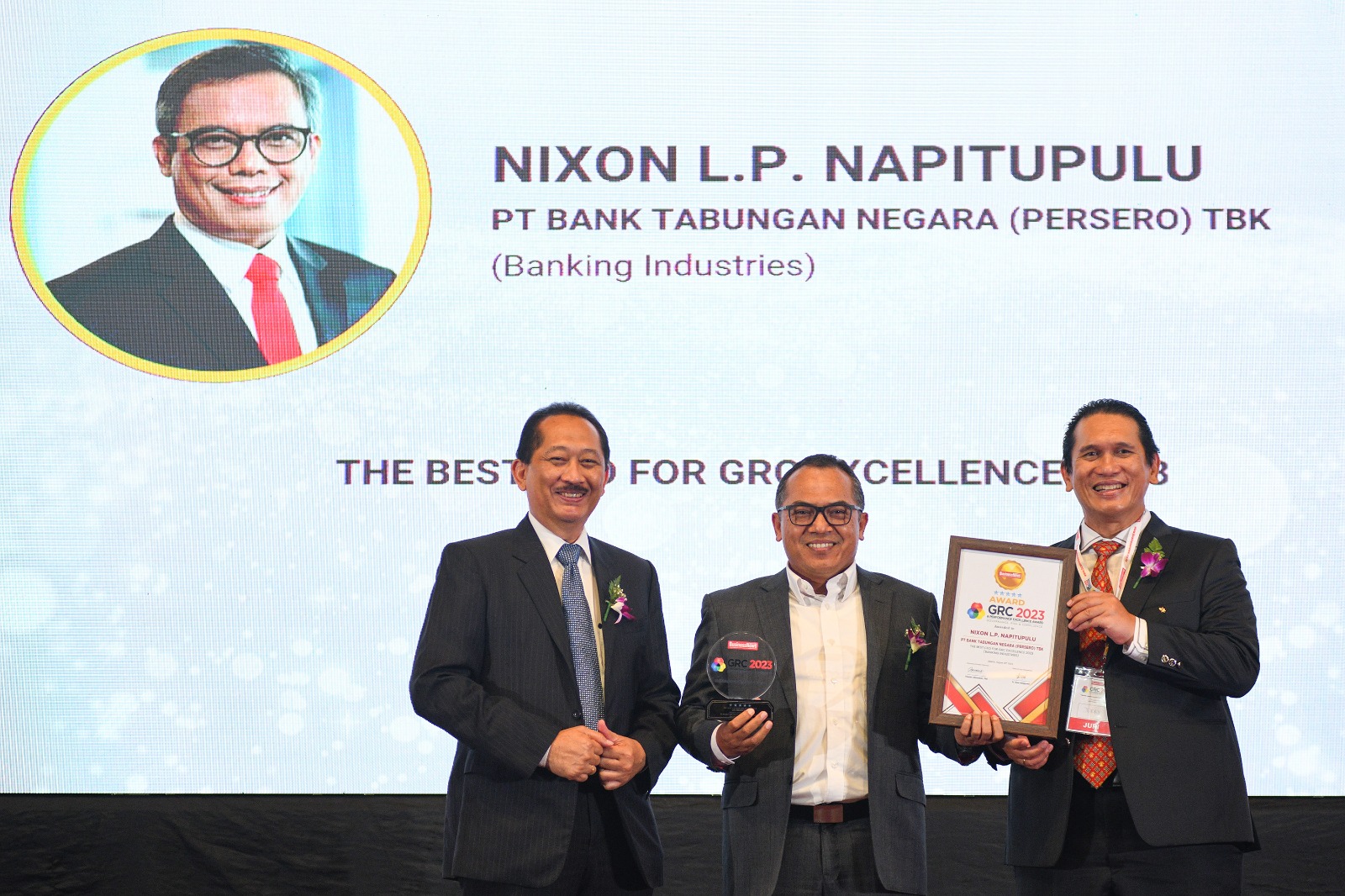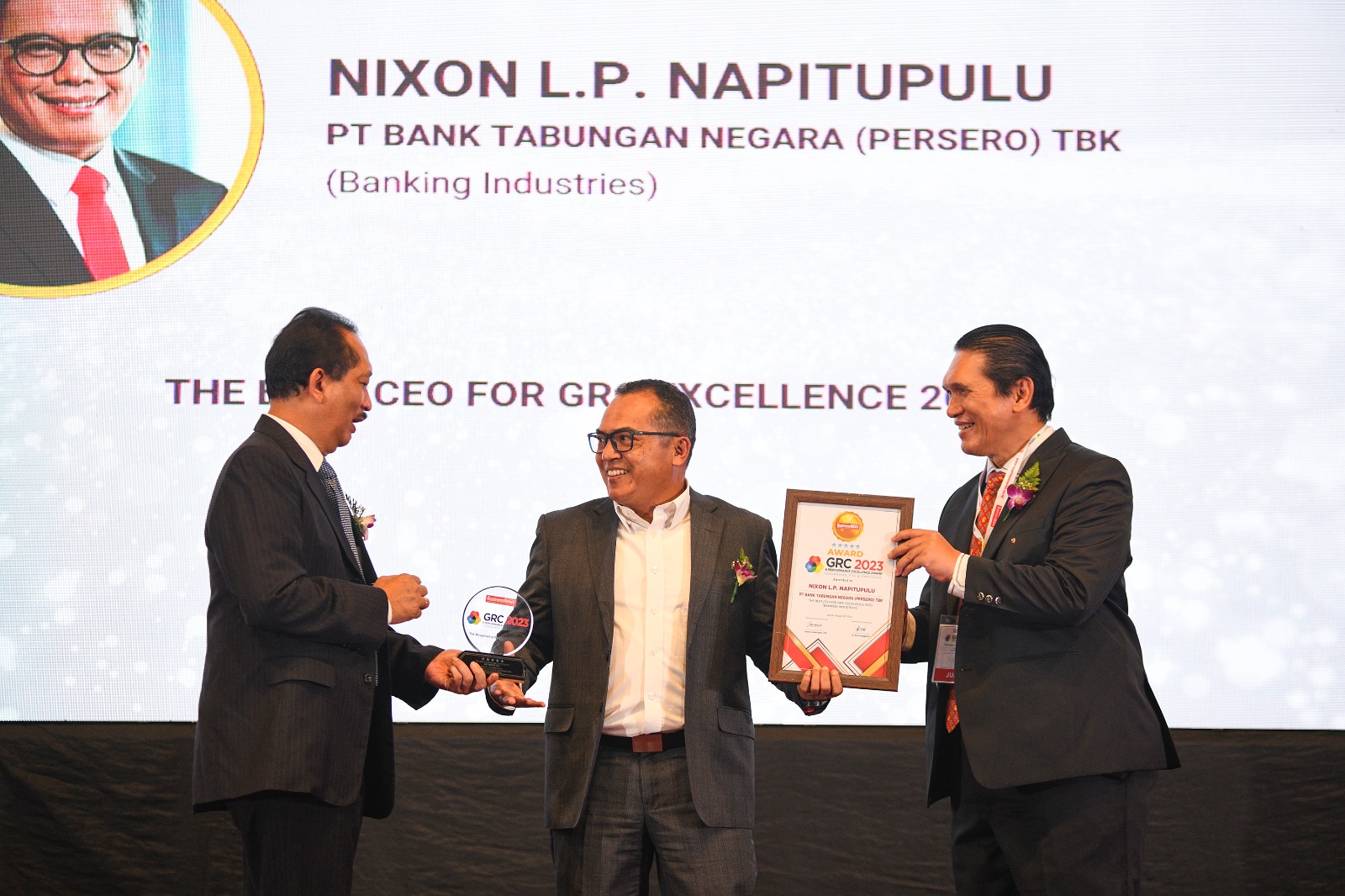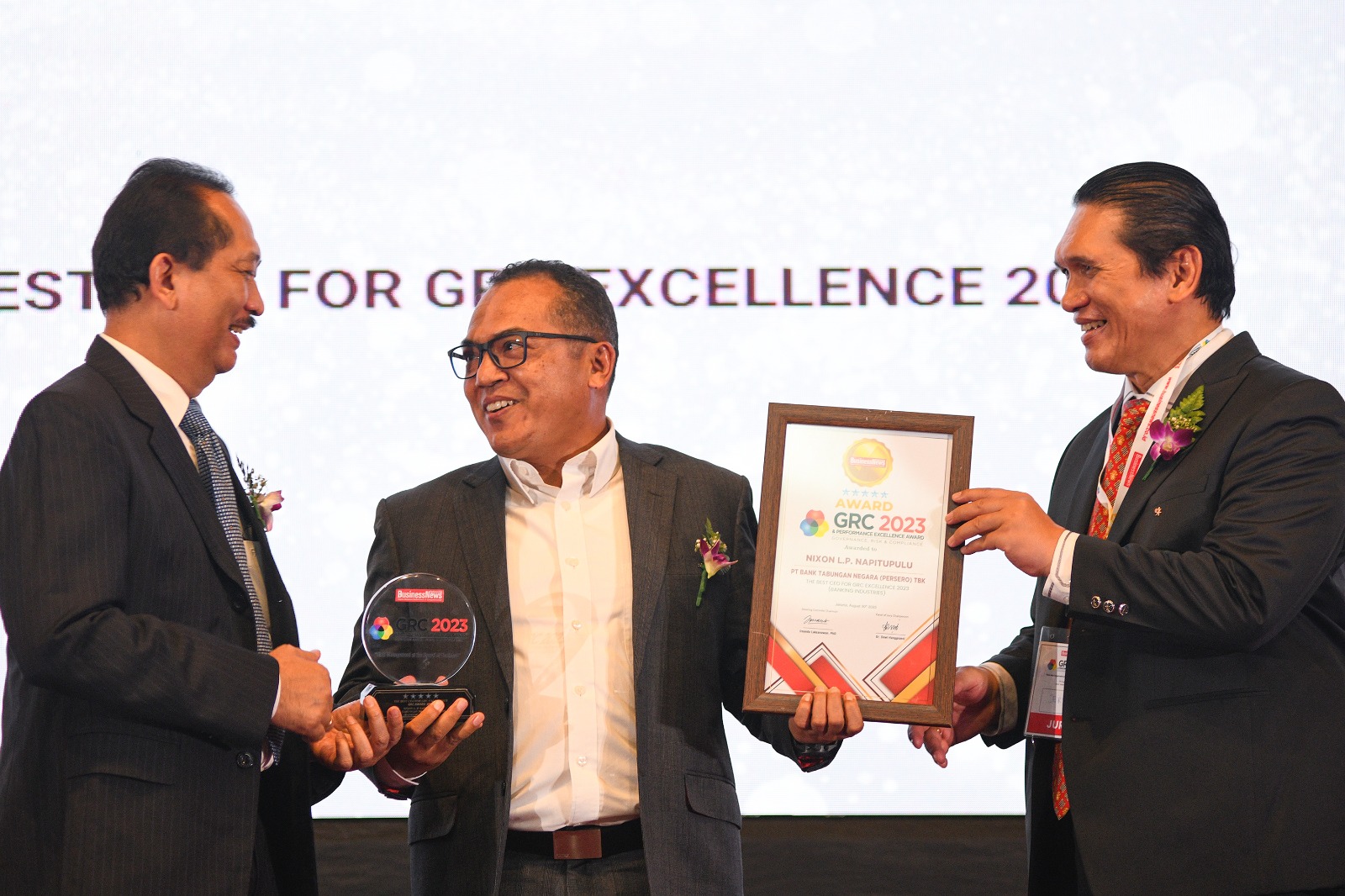 Direktur Human Capital, Compliance & Legal PT Bank Tabungan Negara (Persero) Tbk, Eko Waluyo (tengah) tersenyum usai menerima empat penghargaan di ajang GRC & Performance Excellence Awards 2023 dari Dewan Juri, Sofyan Rohidi (kiri), Harry Sutanto (kanan) di Jakarta, Rabu (30/8).