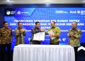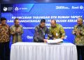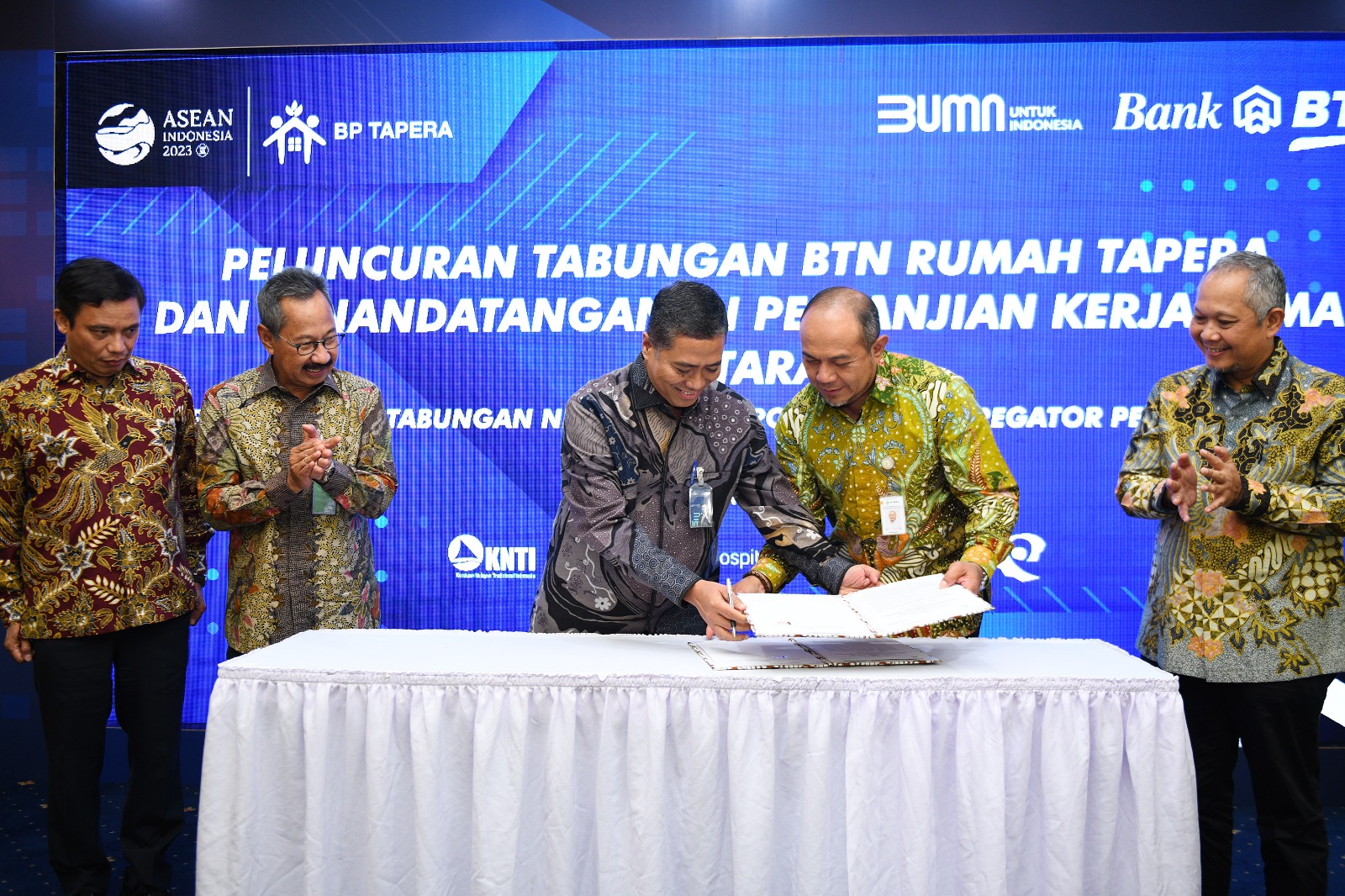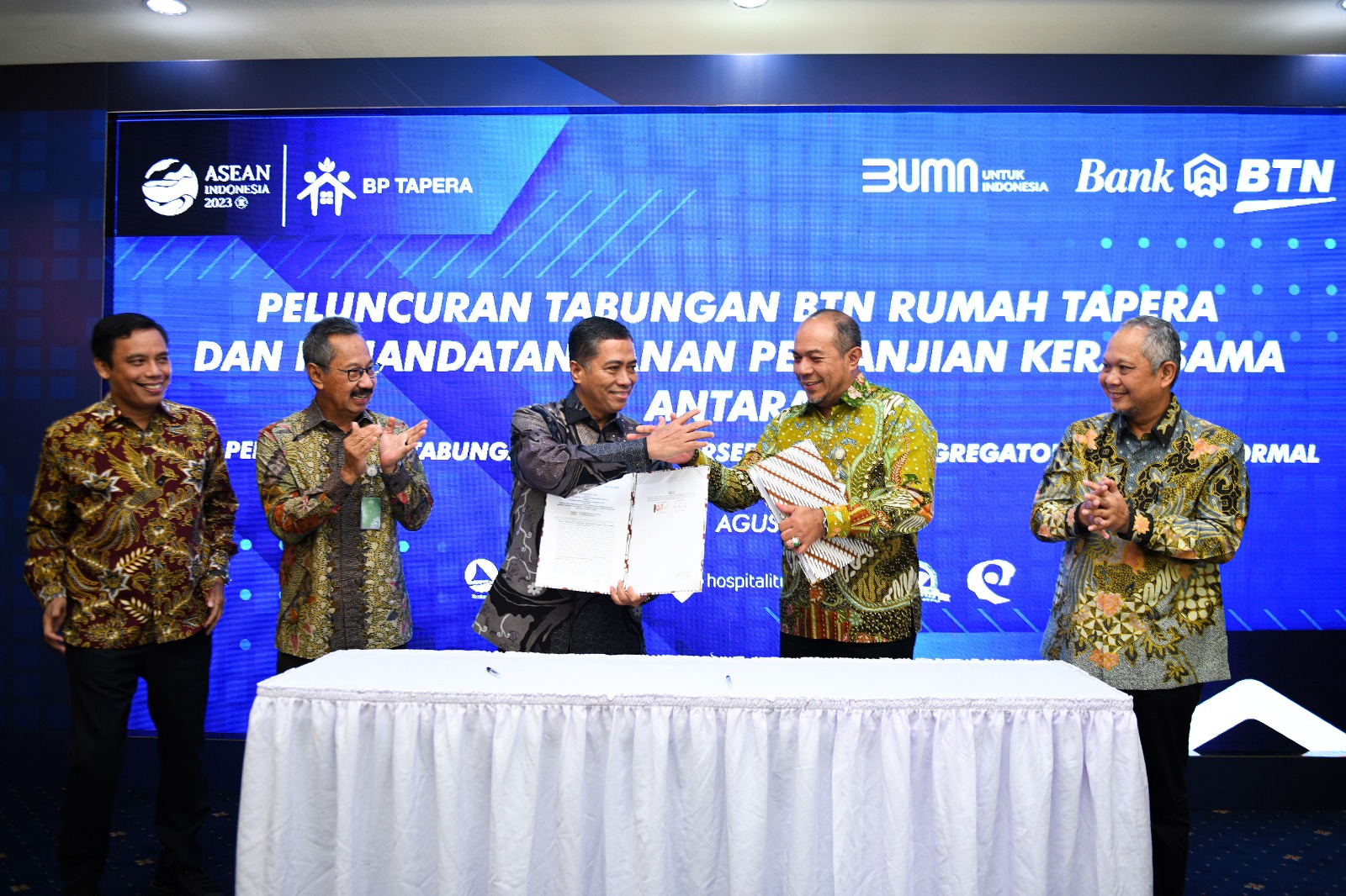 Direktur Consumer Bank BTN Hirwandi Gafar dan Deputi Komisioner Bidang Pengerahan Dana Tapera BP Tapera Eko Ariantoro menunjukkan naskah Perjanjian Kerja Sama Penyaluran Fasilitas Likuiditas Pembiayaan Perumahan Bagi Pekerja Mandiri dan Informal Melalui Program Tabungan Rumah Tapera disaksikan Direktur Utama Bank BTN Nixon LP Napitupulu (kiri), Dirjen Pembiayaan Infrastruktur Kementerian PUPR Herry Trisaputra Zuna (kaman), serta Komisioner BP Tapera Adi Setianto (kedua kiri) saat Peluncuran Tabungan BTN Rumah Tapera dan Penandatanganan Kerja Sama antara Bank BTN, BP Tapera dan Agregator Pekerja Informal di Jakarta, Selasa (1/8). Kerjasama dengan BP Tapera dan agregator pekerja informal akan mengakomodasi para pekerja sektor informal yang belum memiliki rumah melalui skema Saving Plan. Pekerja informal harus menabung sebesar angsuran dan iuran Tapera selama 3 bulan sebagai syarat untuk mendapatkan KPR Sejahtera.
