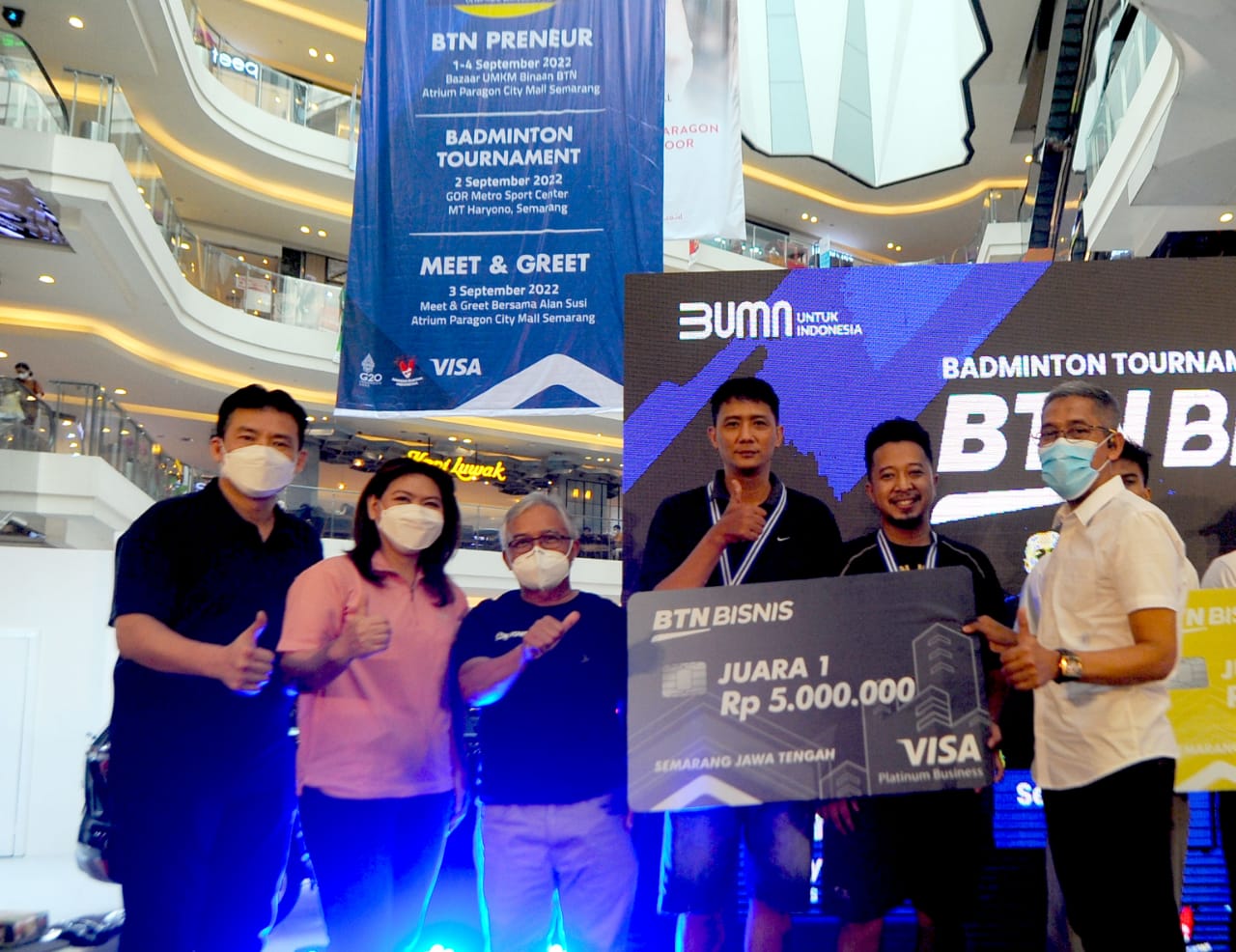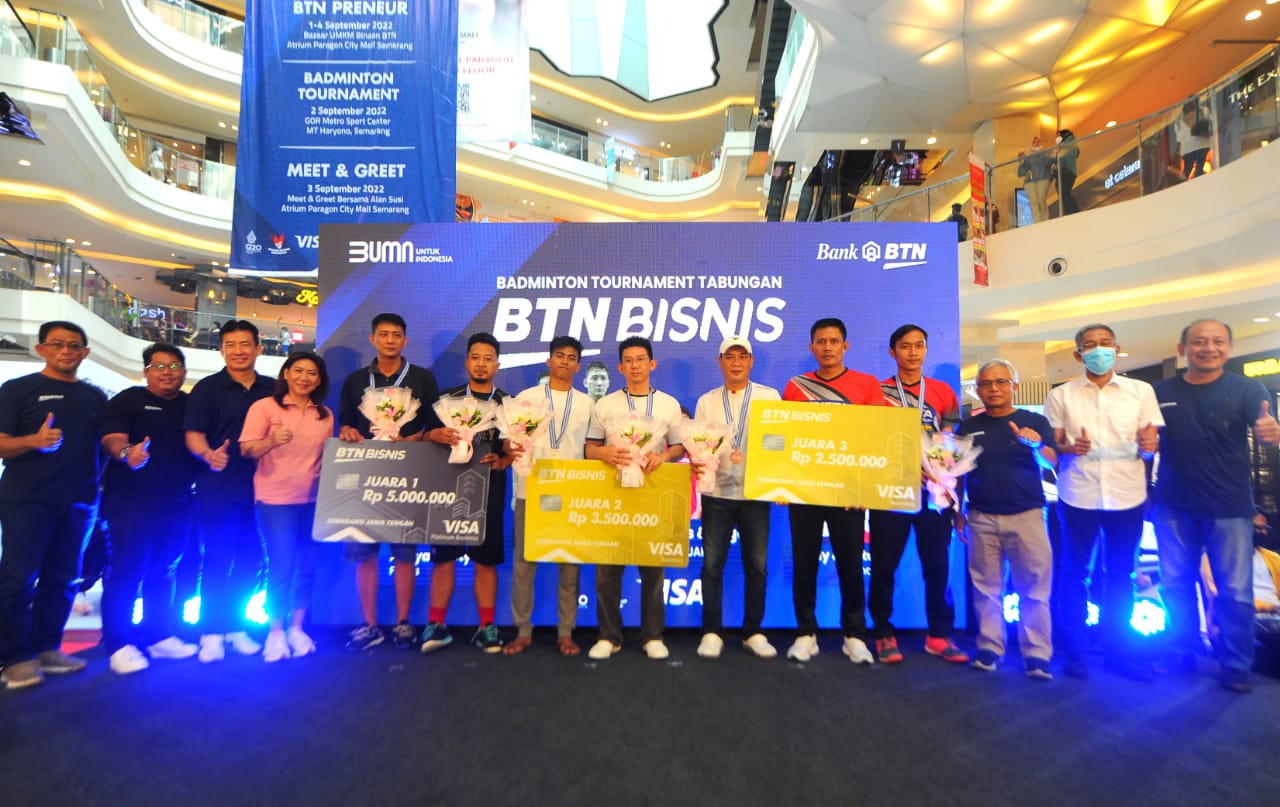 Direktur Distribution & Funding Bank BTN Jasmin bersama Sekda Provinsi Jawa Tengah Sumarno dan mantan atlet bulutangkis Indonesia Susi Susanti serta Alam Budi Kusuma secara simbolis memberikan hadiah kepada para pemenang Badminton Tournament pada acara Road Show Tabungan BTN Bisnis di Semarang, Sabtu (3/9). Road Show Tabungan BTN Bisnis di Semarang ini diharapkan mampu mendongkrak perolehan dana murah perseroan dan membantu pelaku UMKM bisa mengelola usahanya dengan baik sehingga dapat berkembang dan naik kelas
