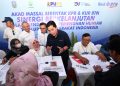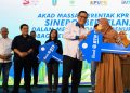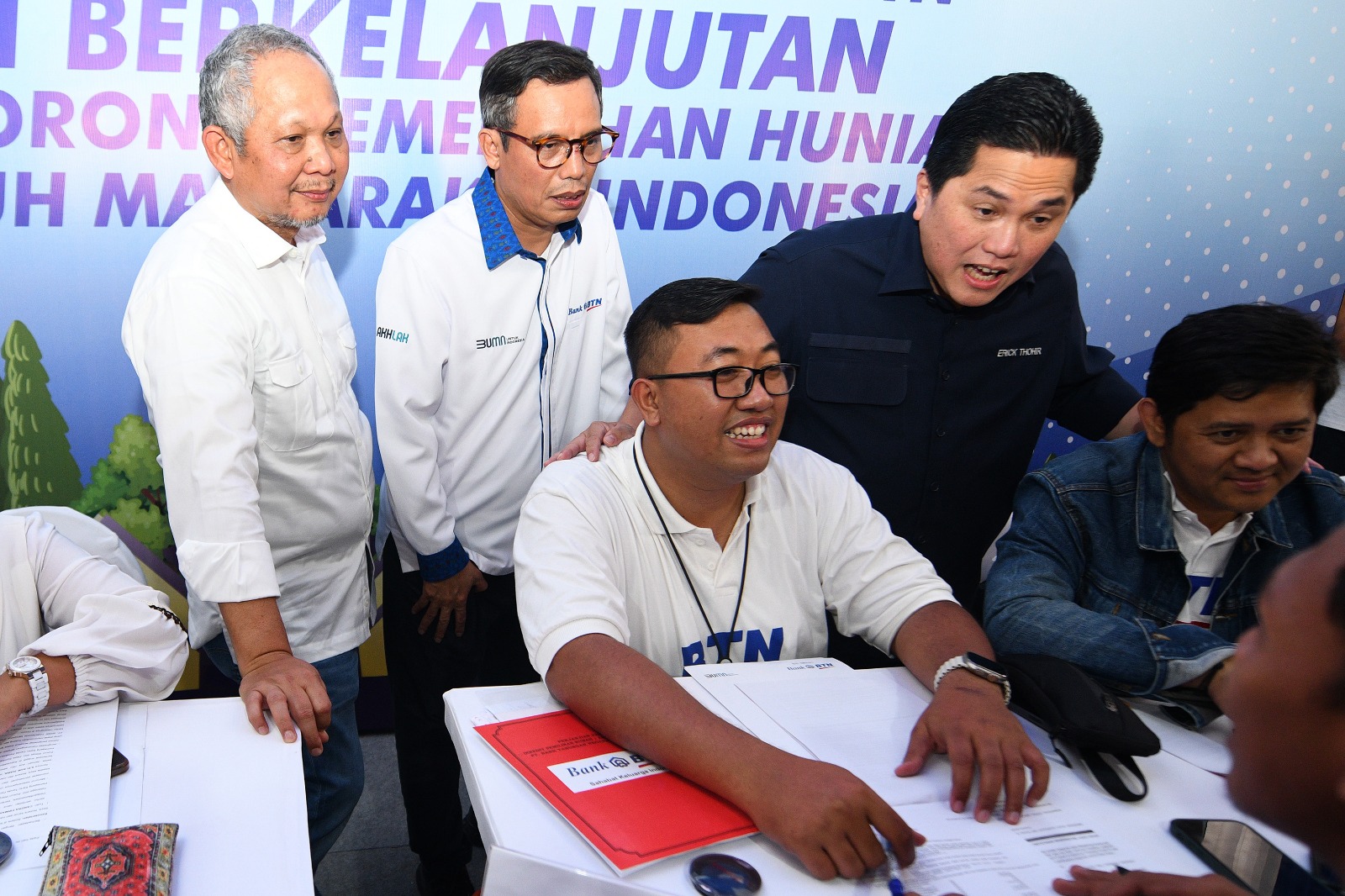 Direktur Utama Bank BTN, Nixon LP Napitupulu disaksikan Menteri BUMN Erick Thohir secara simbolis menyerahkan kunci rumah kepada debitur Bank BTN pada acara Akad Massal Serentak KPR & KUR Bank BTN di Sidoarjo, Jawa Timur, Sabtu (9/9). Akad massal KPR serentak yang digelar Bank BTN merupakan salah satu upaya perseroan untuk melakukan optimalisasi pembiayaan rumah rakyat terus terjaga. Optimalisasi yang dilakukan Bank BTN diharapkan bisa mewujudkan mimpi jutaan rakyat Indonesia memiliki hunian yang layak dan terjangkau.