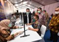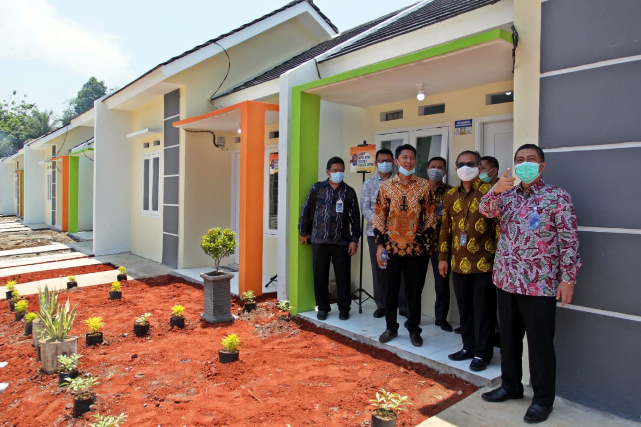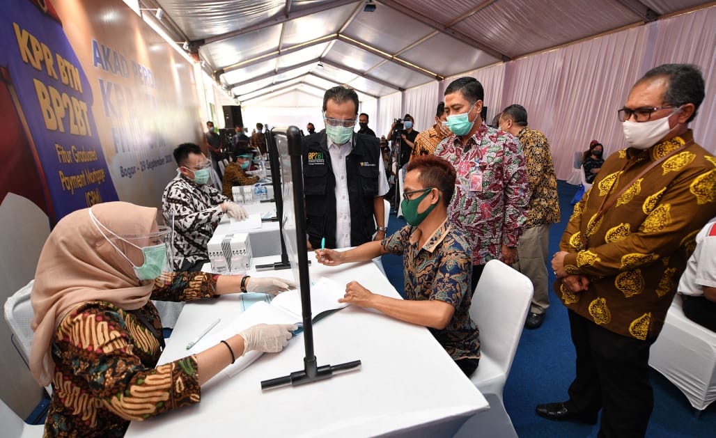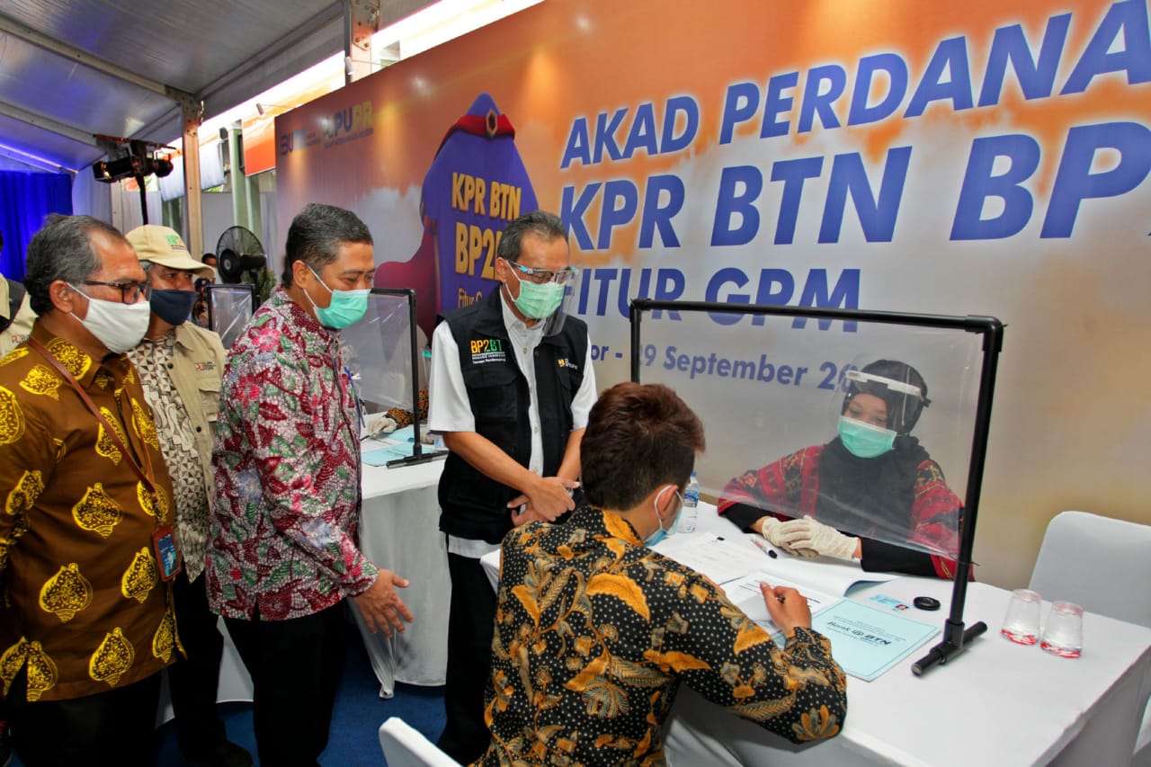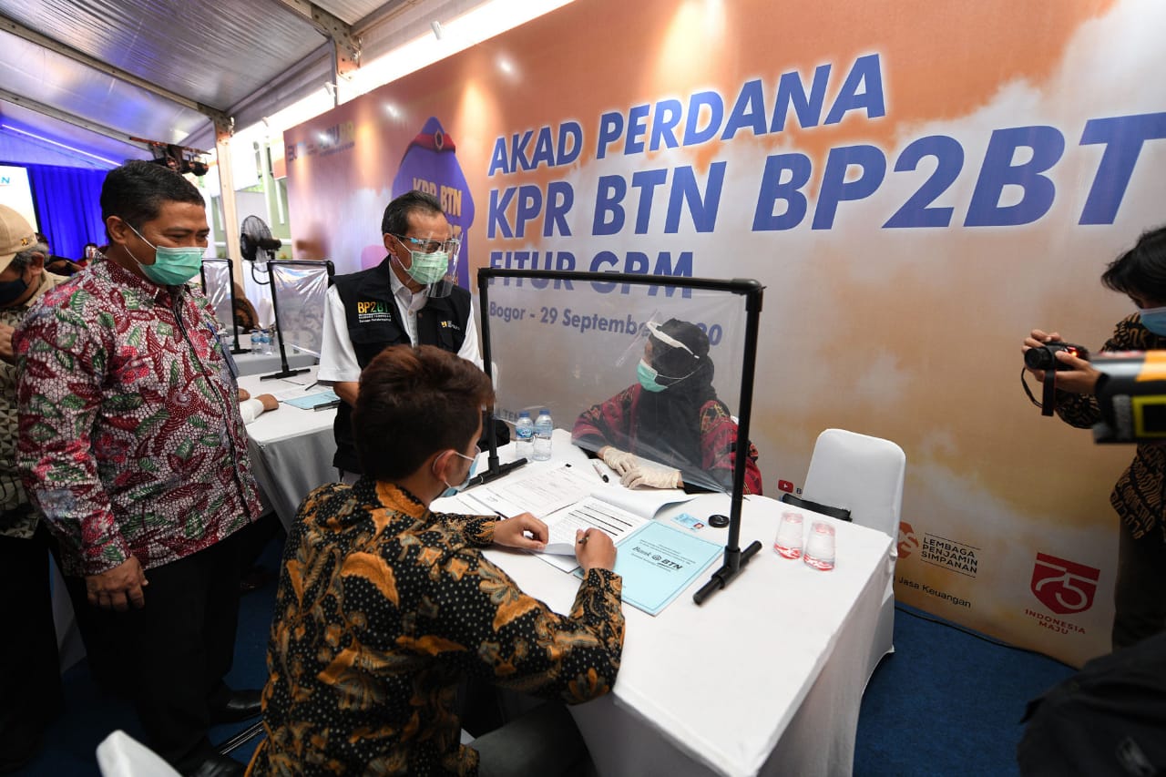 Direktur Consumer and Commercial Lending PT Bank Tabungan Negara (Persero) Tbk, Hirwandi Gafar bersama Dirjen Pembiayaan Infrastruktur Pekerjaan Umum dan Perumahan, Kementerian PUPR, Eko D. Heripoerwanto ( kanan) dan Kepala Kantor Wilayah I Bank BTN Manahan Hutapea (kiri) meninjau proses akad perdana KPR Bantuan Pembiayaan Perumahan Berbasis Tabungan (BP2BT) dengan fitur Graduated Payment Mortgage (GPM) di Perumahan Pesona Kahuripan 3, Cileungsi Bogor, Jawa Barat, Selasa (29/9). Sejak diluncurkan Bank BTN pada tanggal 7 September 2020, KPR BP2BT fitur GPM makin diminati masyarakat, tercatat hingga akhir September ini sudah mencapai sekitar 200 debitur yang mengajukan aplikasi KPR Subsidi BP2BT dengan fitur GPM dan telah melakukan akad kredit pada bulan yang sama.