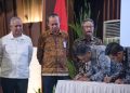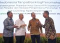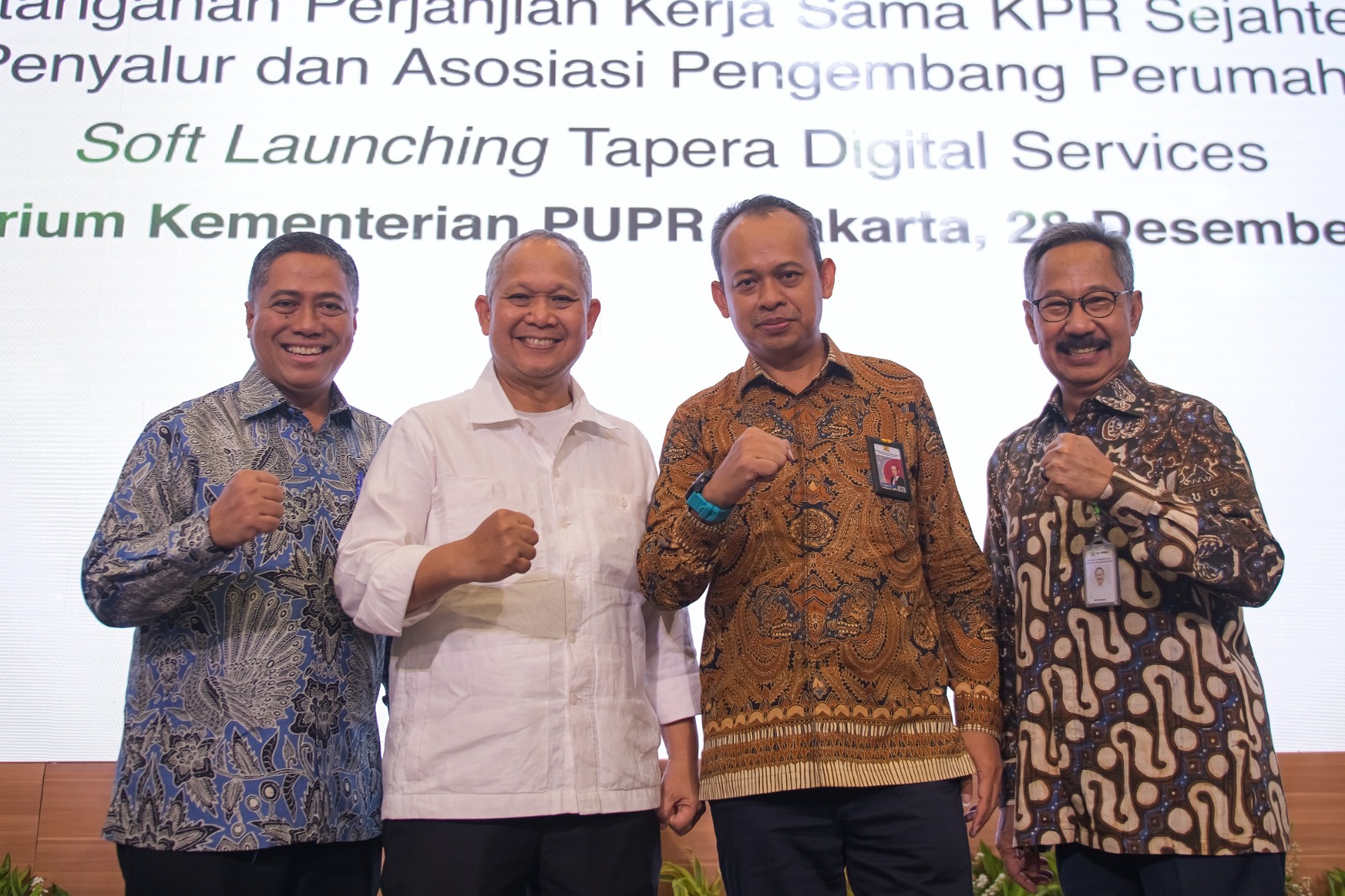 Direktur Consumer Bank BTN Hirwandi Gafar bersama Komisioner BP Tapera Adi Setianto melakukan penandatanganan perjanjian kerjasama KPR Sejahtera FLPP dengan Bank Penyalur dan Asosiasi Pengembang Perumahan Tahun 2024 dengan BP Tapera disaksikan Direktur Jenderal Pembiayaan Infrastruktur Pekerjaan Umum dan Perumahan Herry Trisaputra Zuna dan Direktur Jenderal Perumahan Iwan Suprijanto di Jakarta, Kamis (28/12/2023).