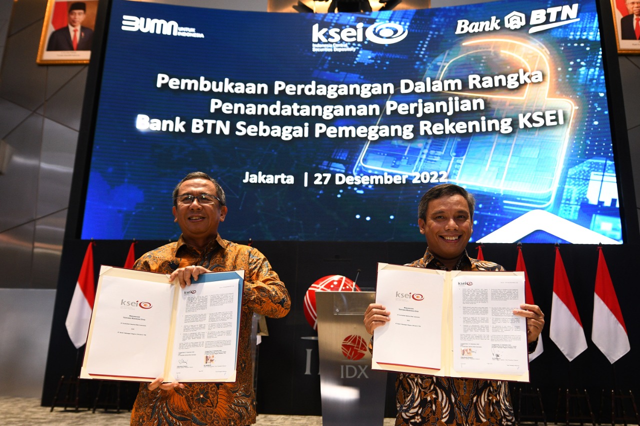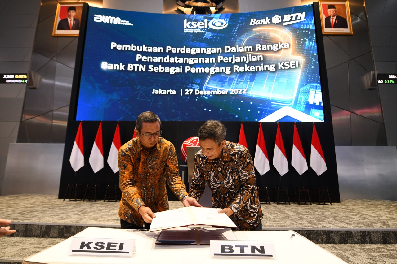Wakil Direktur Utama PT Bank Tabungan Negara (Persero) Tbk, Nixon LP Napitupulu (kanan), dan Direktur Utama KSEI Uriep Budhi Prasetyo (kiri) menunjukkan Perjanjian Kerja Sama (PKS) mengenai pemegang rekening KSEI di Jakarta, Selasa (27/12). Bank BTN memperluas bisnis di jasa Kustodian dengan menargetkan dana kelolaan dana dari nasabah institusi yang menggunakan jasa Kustodian sekitar Rp12 triliun pada tahun pertama. Dengan menyandang status sebagai Kustodian akan melengkapi layanan BTN bagi nasabah yang akan melakukan investasi di pasar modal dan menunjukkan komitmen Bank BTN dalam mengembangkan pasar modal Indonesia.