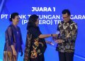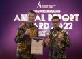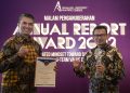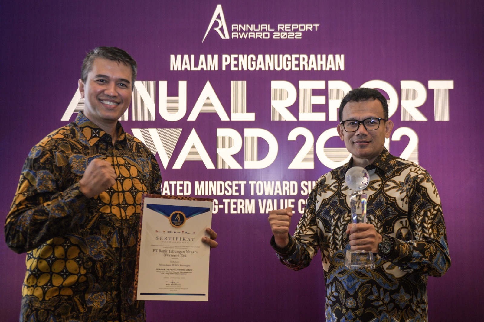 Direktur Finance Bank BTN Nofry Rony Poetra bersama Corporate Secretary Bank BTN Ramon Armando berfoto bersama usai menerima penghargaan sebagai juara 1 dalam ajang Annual Report Award (ARA) 2022 yang diselenggarakan oleh 7 instansi yakni Otoritas Jasa Keuangan (OJK), Kementerian Koordinator Bidang Perekonomian, Kementerian BUMN, Ditjen Pajak Kementerian Keuangan, Bursa Efek Indonesia (BEI), Komite Nasional Kebijakan Governansi (KNKG) dan Ikatan Akuntan Indonesia, di Jakarta, Senin Malam (27/11). Dalam ajang tersebut Bank BTN meraih Juara 1 kategori Perusahaan BUMN Keuangan. Penyajian Laporan Tahunan Bank BTN Tahun 2022 dinilai menjadi yang terbaik diantara perusahaan BUMN Keuangan yang tercatat di Bursa Efek Indonesia (BEI).