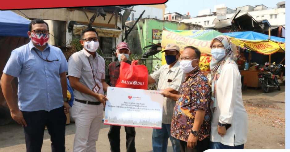 Bank DKI menyerahkan bantuan CSR berupa 100 paket sembako kepada korban kebakaran pedagang UMKM Pasar Cempaka Putih, Jakarta Pusat (6/10). Sebagai bentuk komitmen dalam mendukung sektor UMKM, Bank DKI juga dipercaya untuk menyalurkan dana program Pemulihan Ekonomi Nasional (PEN) sebesar Rp2 triliun kepada pelaku UMKM terdampak Covid-19.
