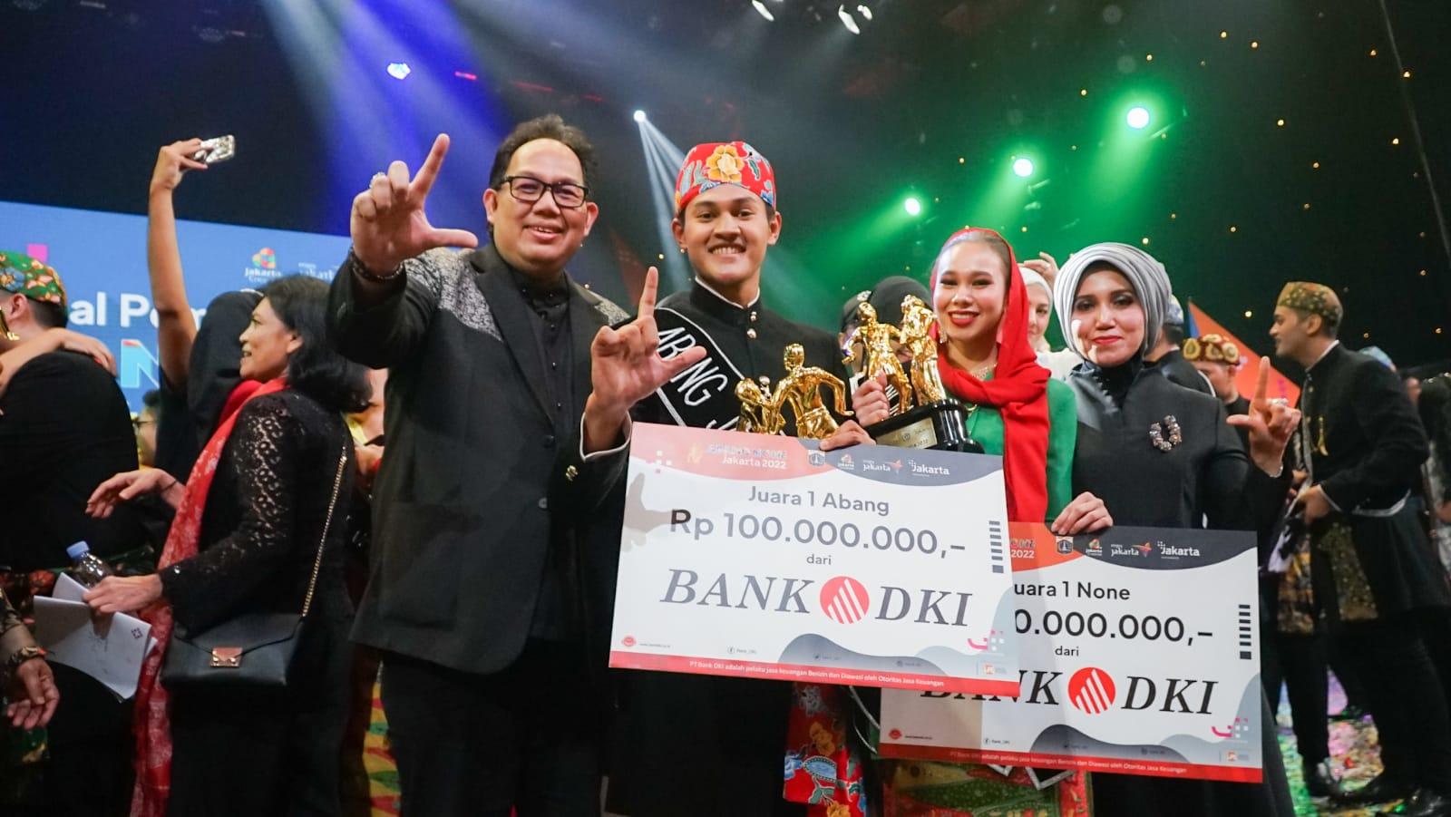 Direktur Utama Bank DKI, Fidri Arnaldy (Tiga dari kiri foto) mendampingi Gubernur DKI Jakarta, Anies Rasyid Baswedan dan Wakil Gubernur DKI Jakarta, Ahmad Riza Patria serta para finalis Abang None Jakarta tahun 2022 dalam gelaran Malam Final Pemilihan Abang None Jakarta 2022 di Jakarta (02/09).
