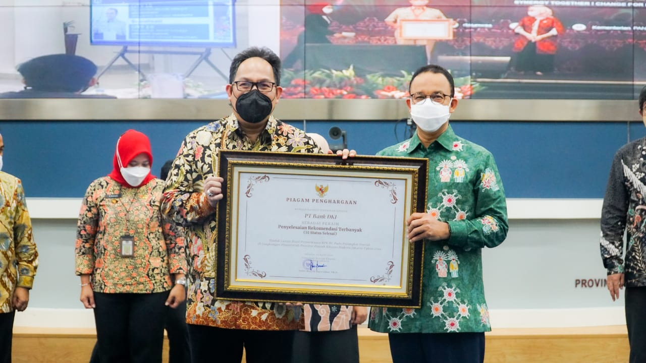 Gubernur DKI Jakarta, Anies Baswedan (kanan) bersama Direktur Utama Bank DKI, Fidri Arnaldy usai menyerahkan penghargaan kepada PT Bank DKI sebagai perusahaan dengan Penyelesaian Rekomendasi Terbanyak (51 kasus selesai) atas tindak lanjut hasil pemeriksaan Badan Pemeriksa Keuangan Republik Indonesia pada perangkat daerah di lingkungan Pemprov DKI Jakarta Tahun 2021, (28/4).
