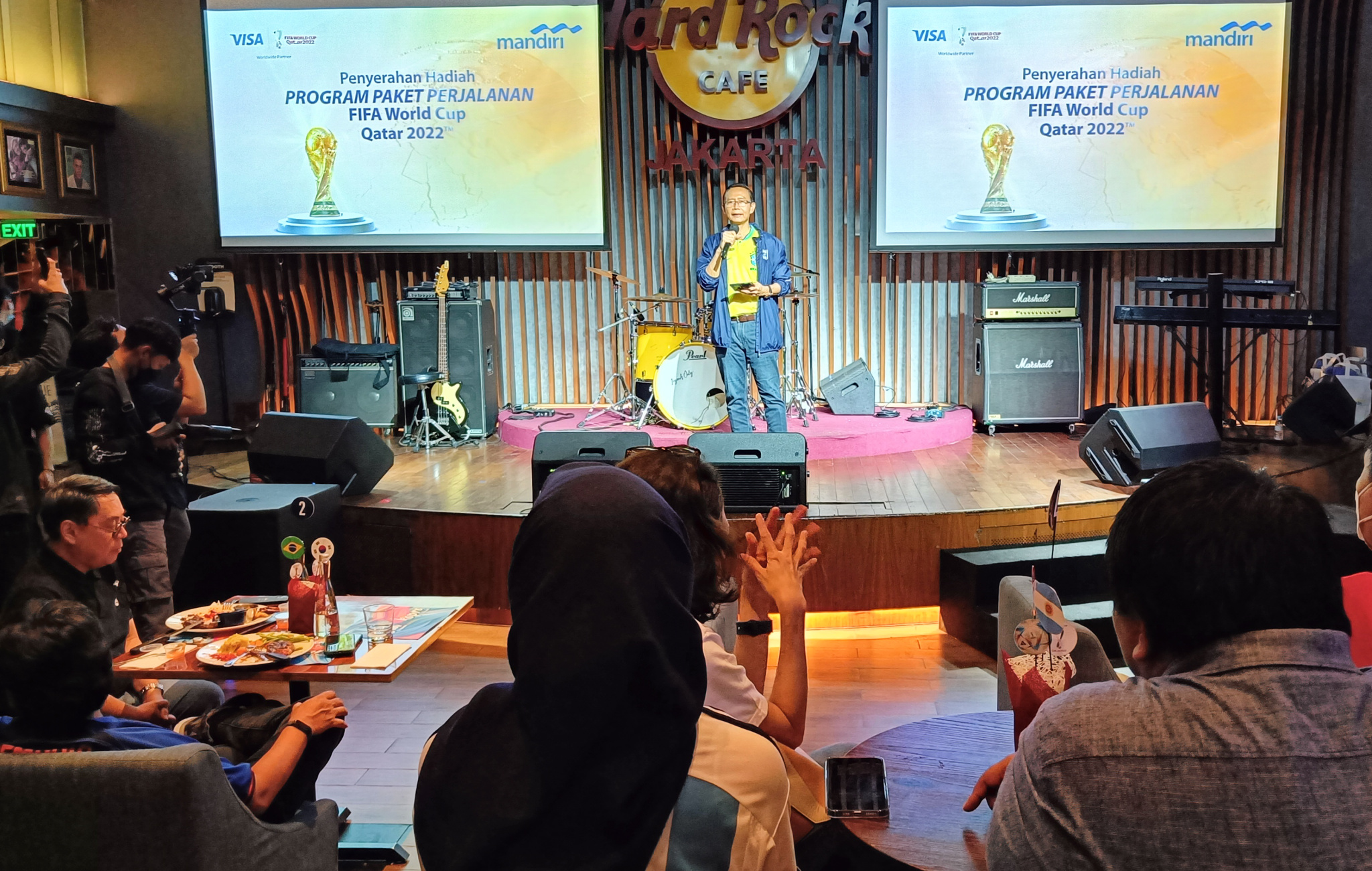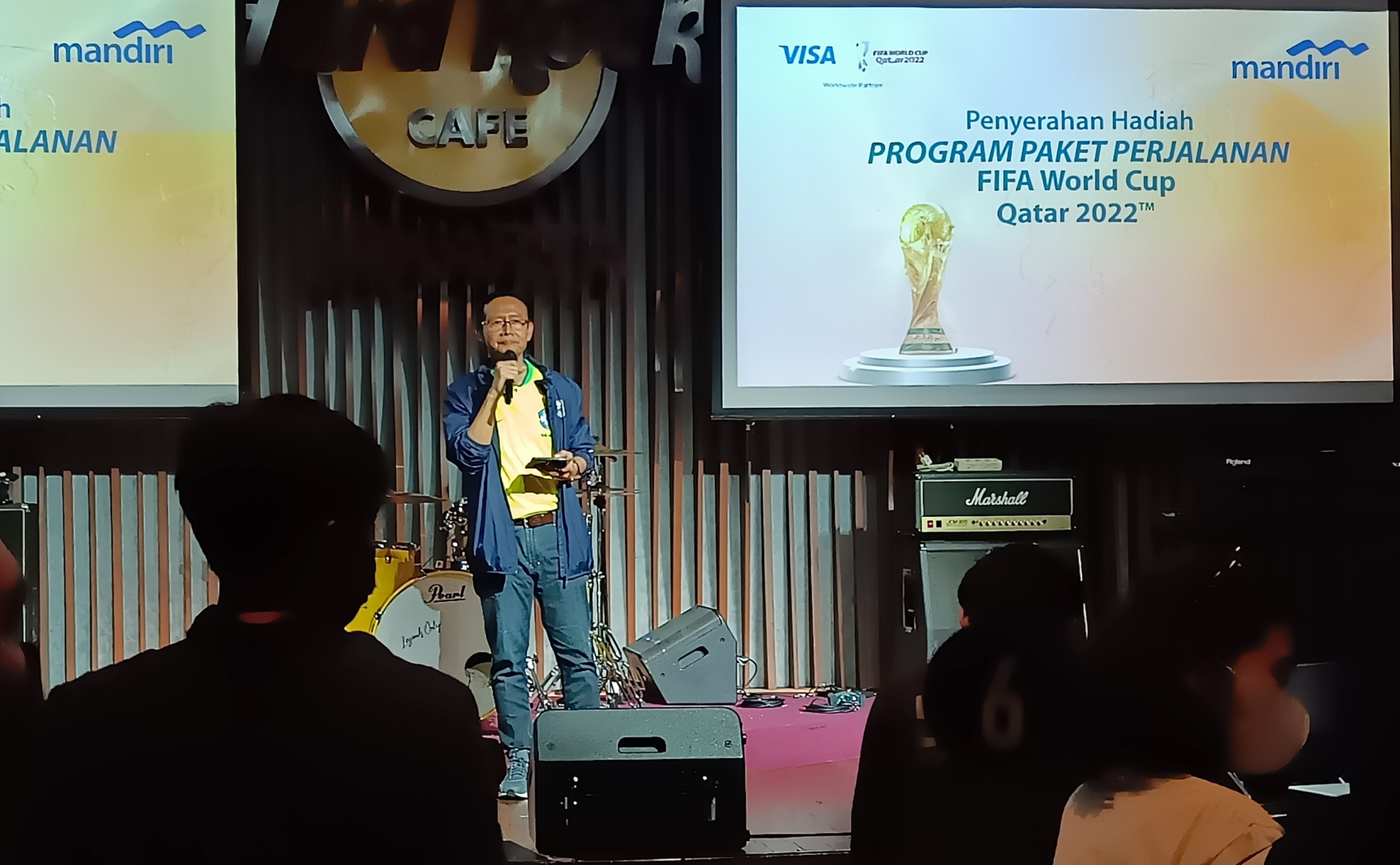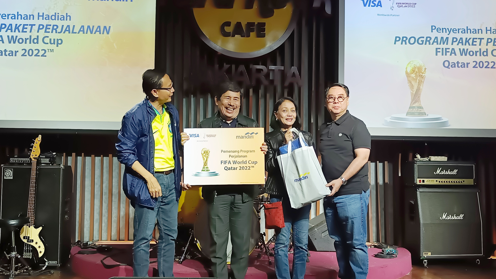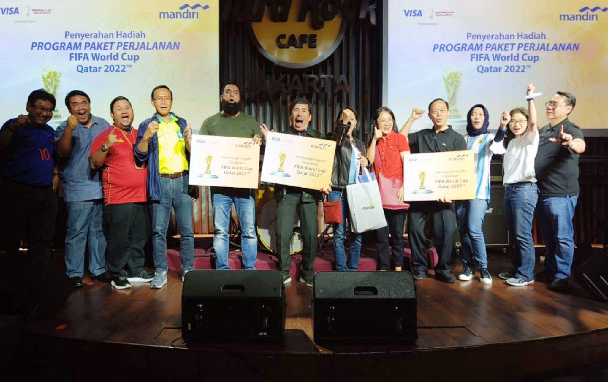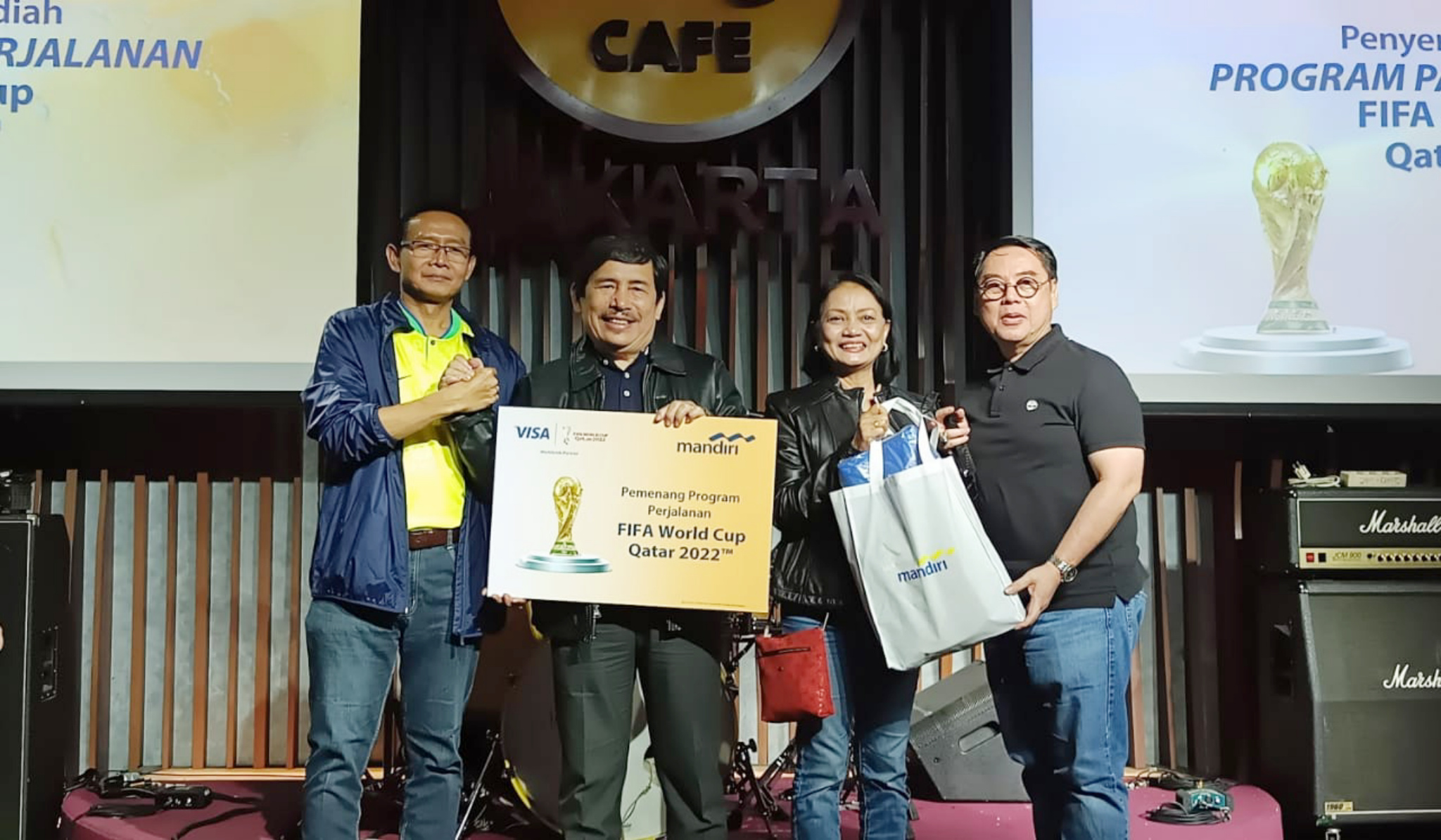 Direktur Jaringan & Retail Banking Bank Mandiri Aquarius Rudianto (kiri) dan Presiden Direktur Visa Indonesia Riko Abdurrahman (kanan) saat menyerahkan hadiah program nonton langsung FIFA Piala Dunia 2022 Qatar kepada nasabah pebisnis di Jakarta, Selasa (6/12). Program yang diberikan kepada nasabah pebisnis berdasarkan simpanan dan transaksi nasabah ini merupakan salah satu inisiatif strategis perseroan dalam meningkatkan loyalitas nasabah segmen pebisnis sekaligus upaya mendulang dana murah. Selain program ini, Bank Mandiri juga terus mengembangkan berbagai inisiatif dan transformasi digital untuk mendukung kelancaran dan kemudahan bisnis nasabah pebisnis.