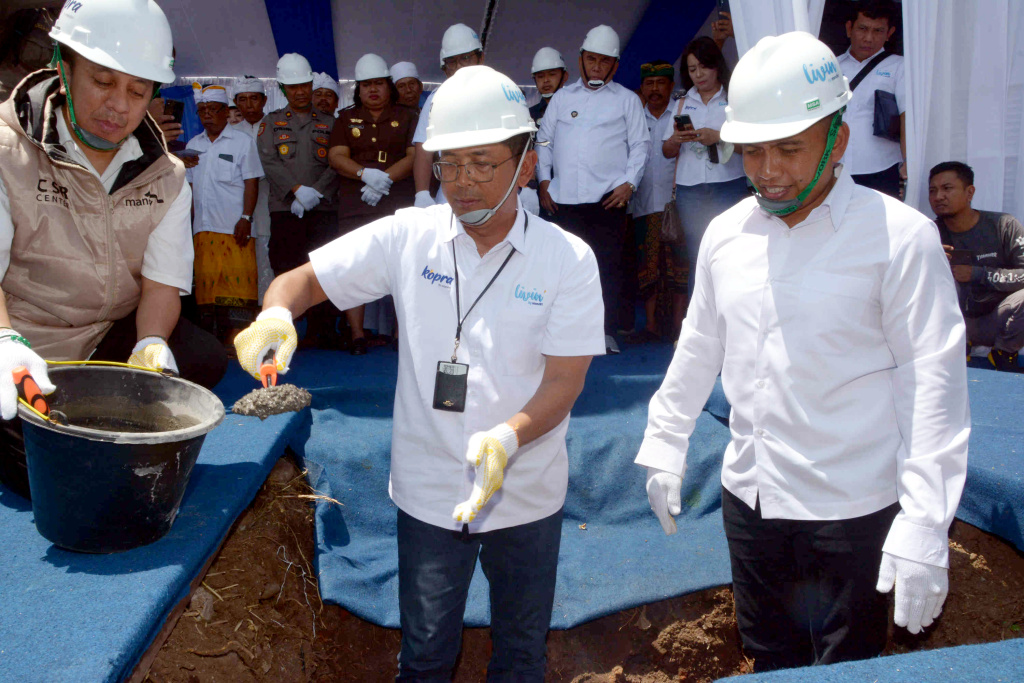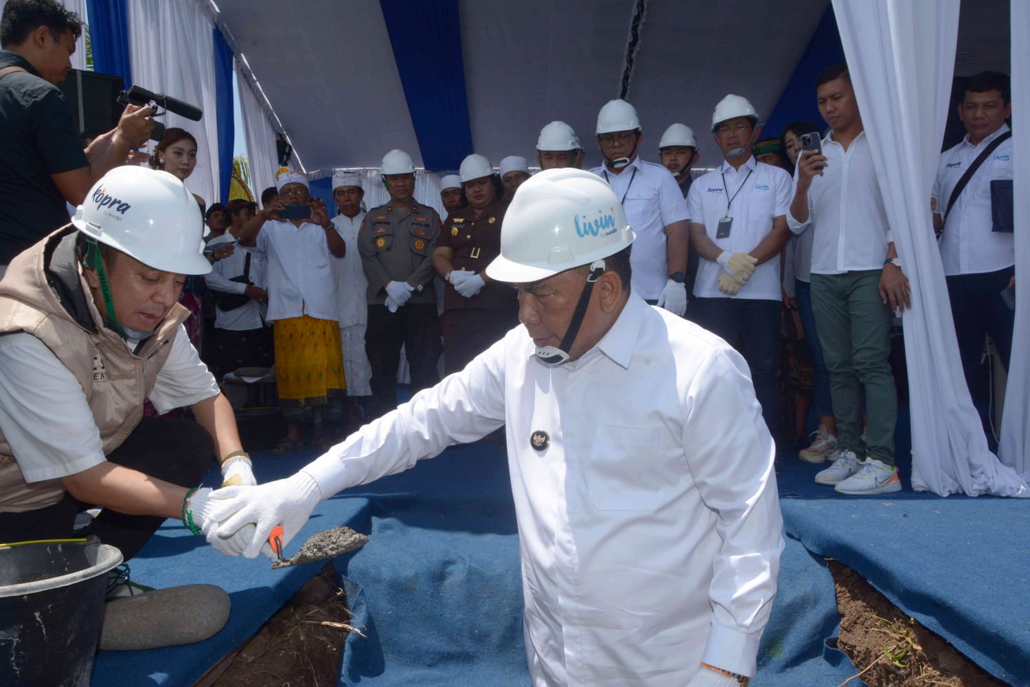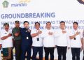 SVP Government Project Bank Mandiri Hendrianto Setiawan (tengah) bersama Bupati Jembrana I Nengah Tamba (tiga kanan), Wakil Bupati Jembrana I gede ngurah patriana Krisna (dua kanan) dan Regional CEO Kanwil XI Bank Mandiri Winardi Legowo (kanan) saat meresmikan groundbreaking pembangunan Pengolahan Beras Terpadu di Jembrana, Bali, Rabu (22/2). Menyusul keberhasilan program kewirausahaan petani melalui Pengolahan Beras Terpadu di Pamarican, Ciamis dan Kaliputih, Kebumen, Bank Mandiri berharap program ini dapat meningkatkan kesejahteraan petani, serta membantu menstabilkan harga beras di masyarakat. Diharapkan pengolahan beras terpadu ini akan selesai dibangun pada kuartal III – 2023.