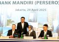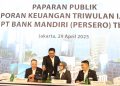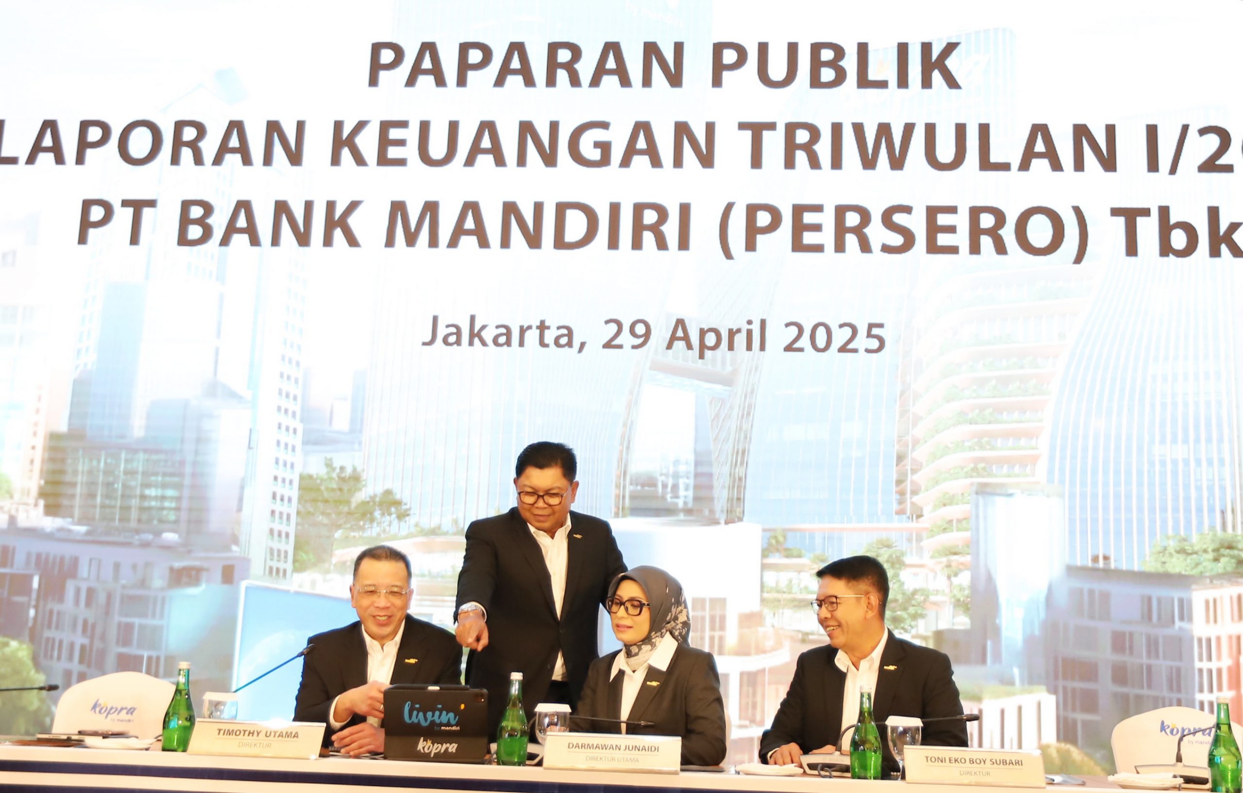 (Ki-Ka) Direktur Information Technology Bank Mandiri Timothy Utama, Direktur Bank Mandiri Eka Fitria bersama Direktur Utama Bank Mandiri Darmawan Junaidi serta Direktur Operations Toni E.B Subari berbincang setelah memaparkan kinerja Kuartal I 2025 di Jakarta, Selasa (29/4). Bank Mandiri terus memperkuat komitmen untuk menjaga pertumbuhan bisnis yang sehat di sepanjang awal 2025, tercermin dari realisasi kredit konsolidasi Bank Mandiri tercatat sebesar Rp1.672 triliun pada Maret 2025 atau tumbuh 16,5% secara year-on-year (YoY). Kinerja yang baik tersebut, juga diikuti oleh pertumbuhan yang berkualitas, tercermin dari rasio kredit bermasalah (Non-Performing Loan/NPL) secara bank only terjaga di level 1,01% pada Maret 2025 dan Cost of Credit (CoC) yang membaik ke level 0,71% per Maret 2025.