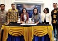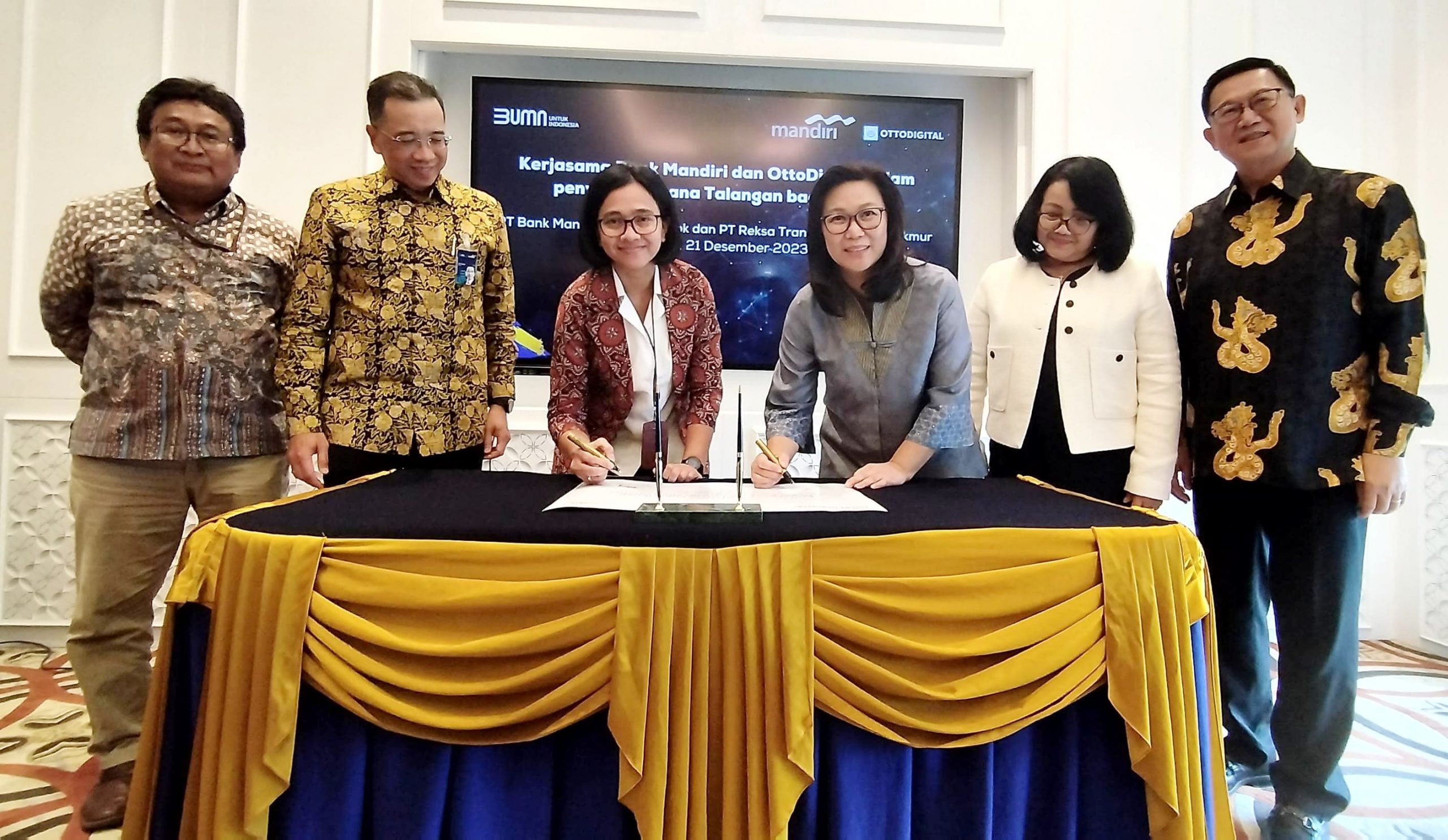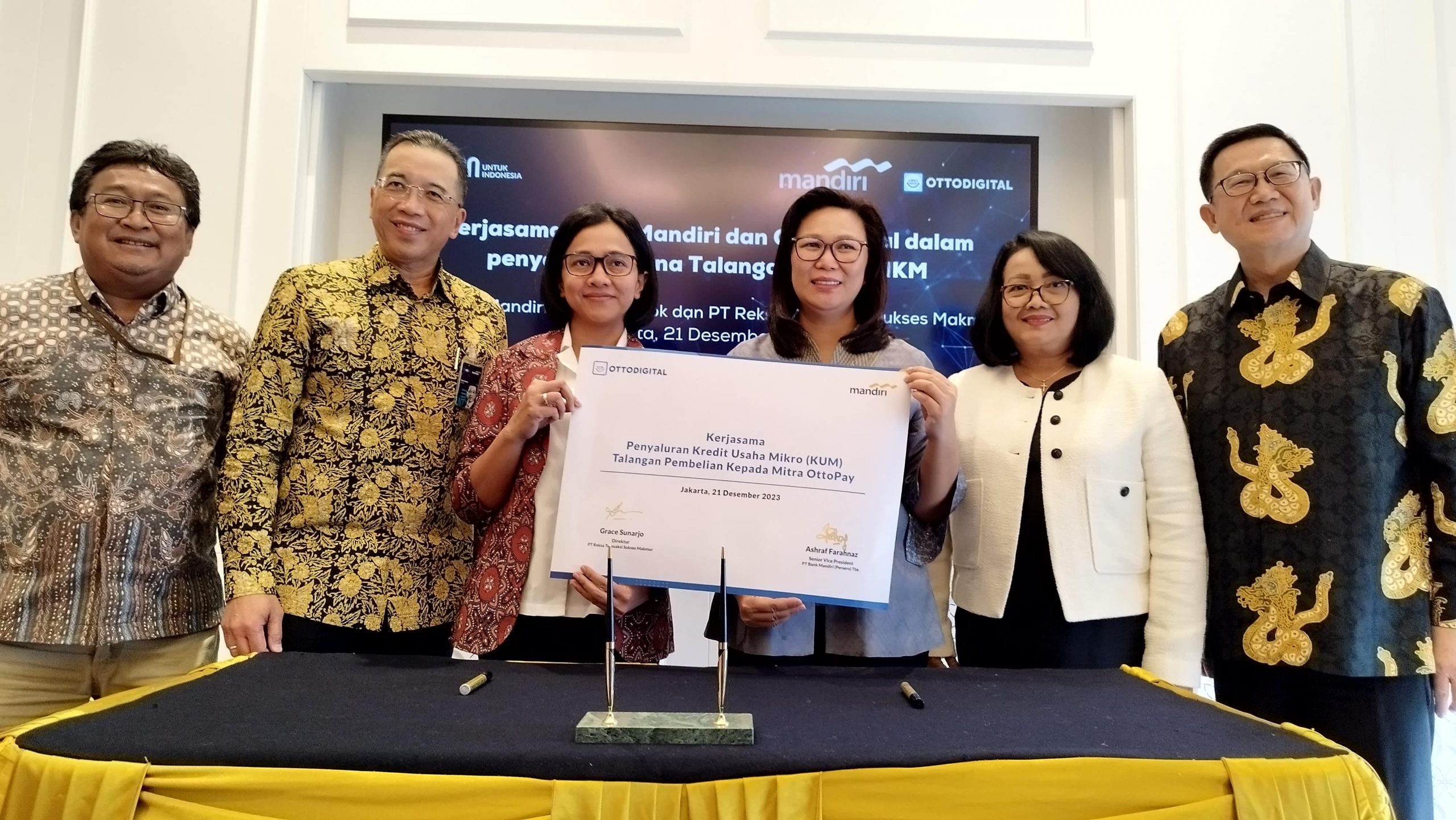 (Kiri-kanan) Senior Executive Vice President Micro & Consumer Finance Bank Mandiri Josephus K. Triprakoso, Direktur Teknologi Informasi Bank Mandiri Timothy Utama, SVP Micro Development & Agent Banking Group Bank Mandiri Ashraf Farahnaz, Direktur OttoPay Grace Sunarjo, Direktur Corporate Banking Bank Mandiri Susana Indah, dan CEO OttoDigital Theodorus Wiryawan berbincang setelah melakukan penandatanganan kerja sama penyediaan layanan pinjaman produktif Dana Talangan Mandiri kepada UMKM mitra OttoPay milik OttoDigital Bank Mandiri menargetkan dapat menyalurkan Kredit skema talangan melalui platform OttoPay sebesar Rp 50 Miliar. Kolaborasi ini diharapkan mampu meningkatkan kapasitas daya saing usaha pelaku UMKM sehingga dapat mendorong pertumbuhan ekonomi serta penyerapan tenaga kerja.