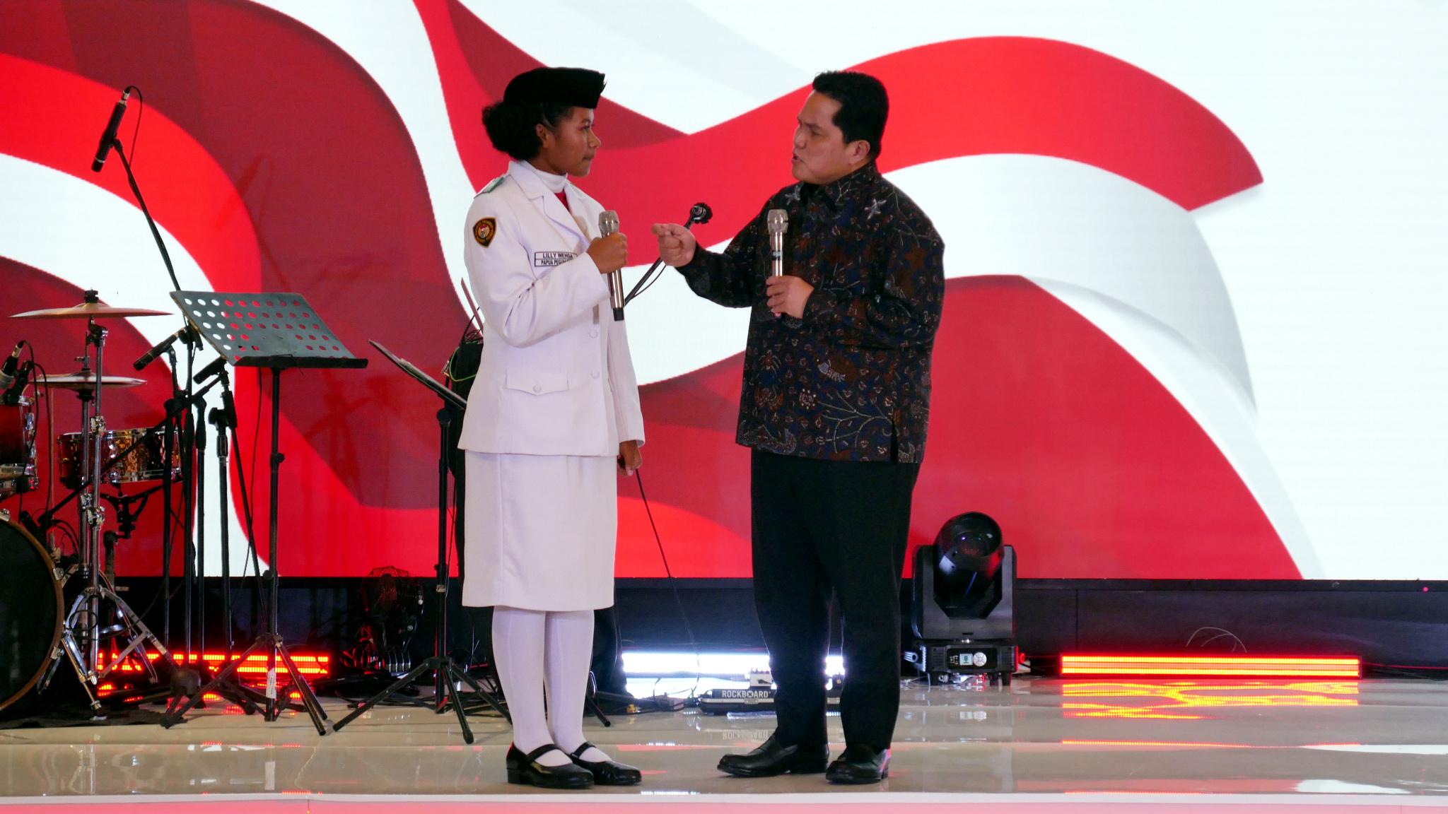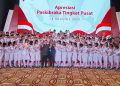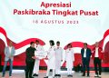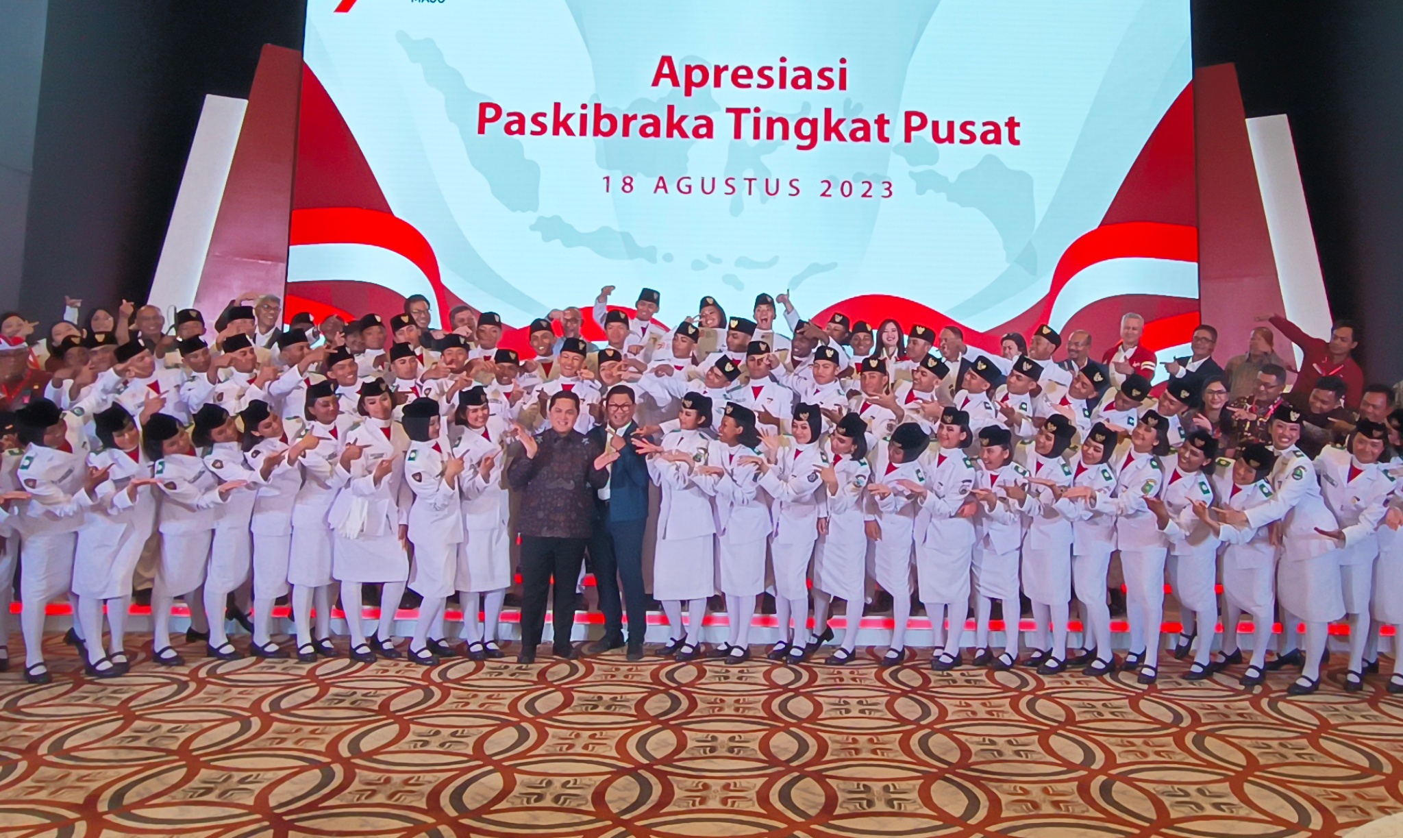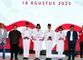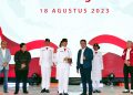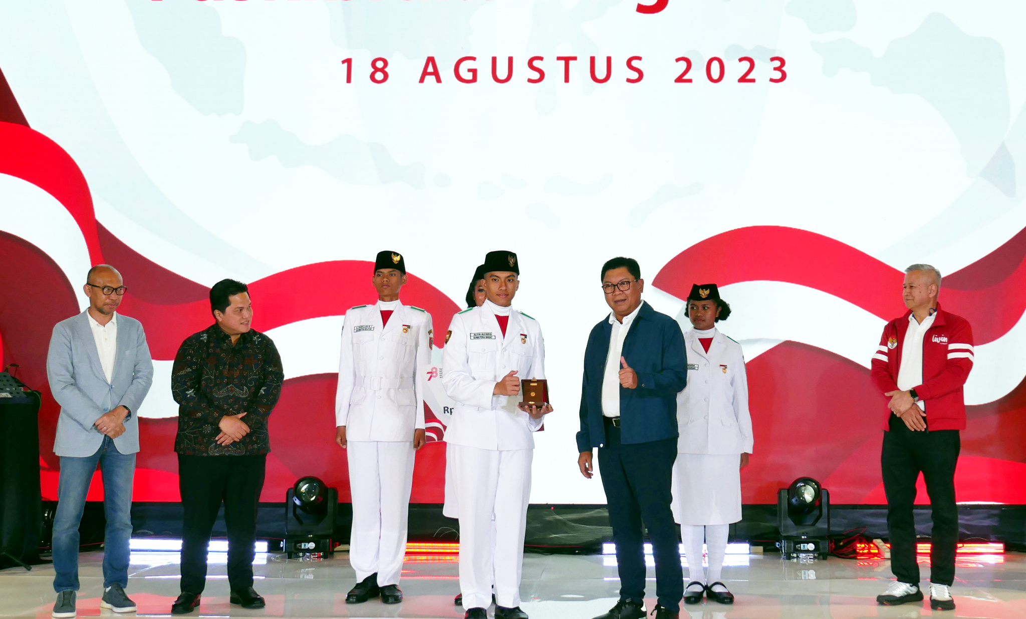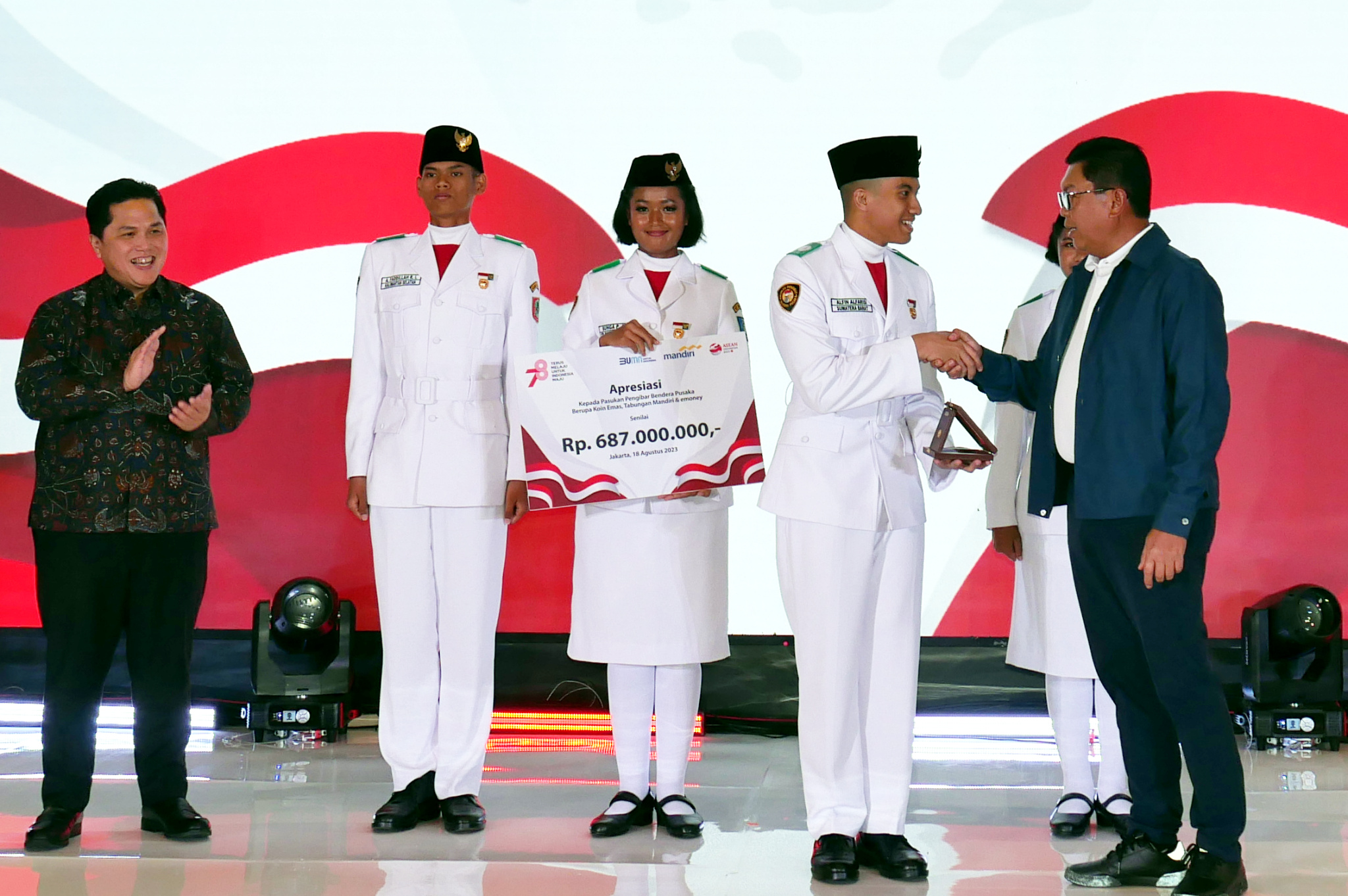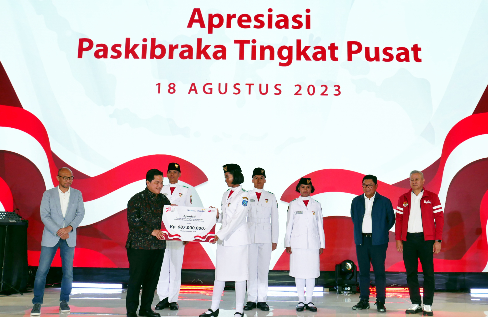 (Kiri – Kanan) Komisaris Utama Bank Mandiri Chatib Basri, Menteri BUMN Erick Thohir, perwakilan Paskibraka Tingkat Pusat, Direktur Utama Bank Mandiri Darmawan Junaidi, Direktur Hubungan Kelembagaan Bank Mandiri Rohan Hafas menyerahkan apresiasi secara simbolis kepada Anggota Pasukan Pengibar Bendera Pusaka (Paskibraka) Tingkat Pusat di Jakarta, Jumat (18/8). Atas peran penting Anggota Paskibraka dalam Upacara Peringatan HUT ke 78 RI, Bank Mandiri menyerahkan apresiasi berupa tabungan, kartu e-money, dan koin emas 24 karat seberat 5 gram serta asuransi perlindungan jiwa kepada setiap anggota. Diharapkan, apresiasi ini dapat terus memotivasi para anggota Paskibraka Tingkat Pusat untuk terus mengembangkan diri melalui kreasi dan inovasi yang bisa memberikan kontribusi kepada Tanah Air.