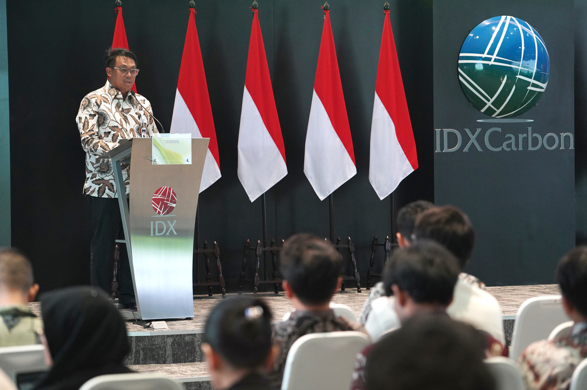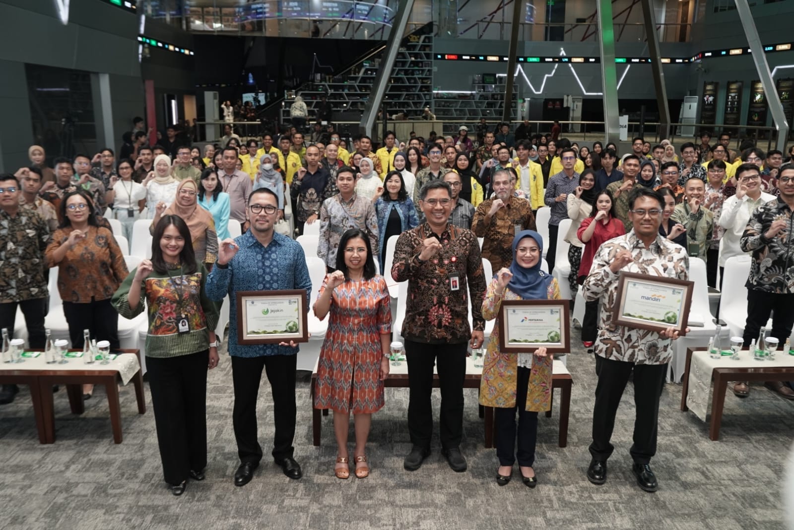 (Kiri–kanan) Wakil Direktur Utama Bank Mandiri Henry Panjaitan, Direktur Keuangan, Sumber Daya Manusia, dan Umum Bursa Efek Indonesia Risa E. Rustam, serta SVP ESG Group Bank Mandiri Monica Yoanita Octavia pada peluncuran fitur Sertifikat Pengurangan Emisi Gas Rumah Kaca (SPE-GRK) pada Livin’ Planet di aplikasi Livin’ by Mandiri, di Bursa Efek Indonesia, Jakarta, pada Rabu (22/4). Inisiatif ini merupakan kolaborasi Bank Mandiri dengan IDX Carbon untuk memperluas akses masyarakat terhadap pasar karbon sekaligus mendorong partisipasi nasabah dalam aksi iklim melalui mekanisme carbon offset yang kredibel dan terverifikasi.
