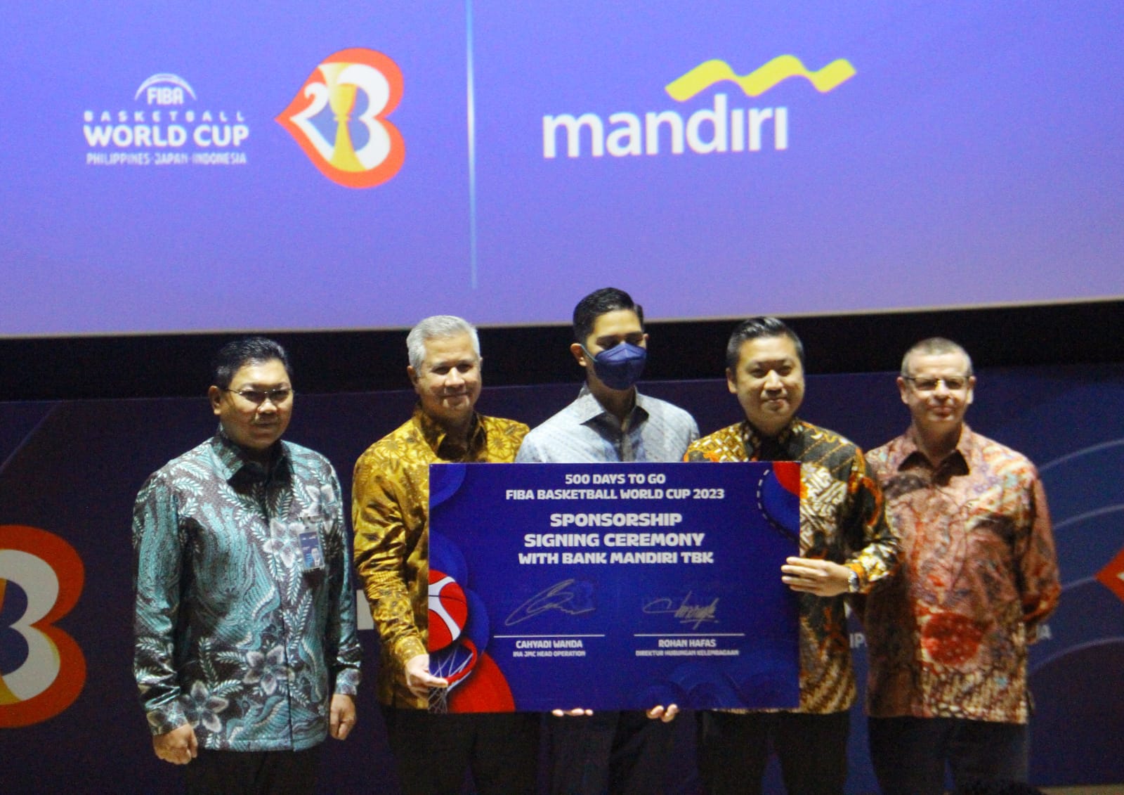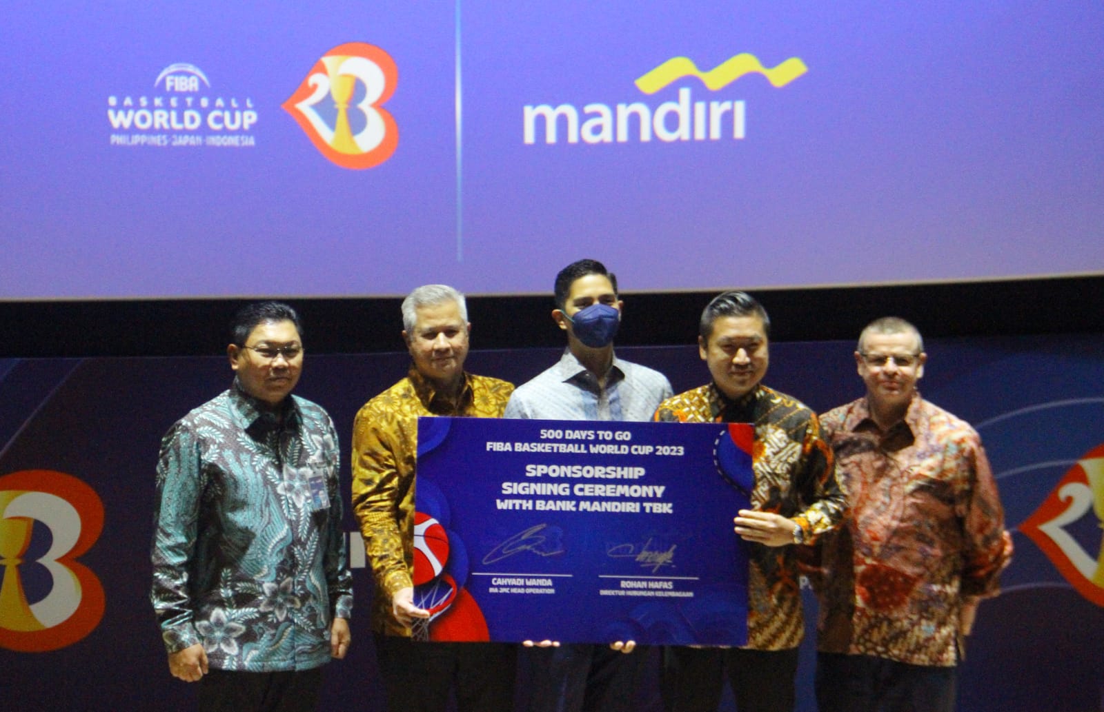 (kika) Direktur Utama Bank Mandiri Darmawan Junaidi, Direktur Hubungan Kelembagaan Bank Mandiri Rohan Hafas, Ketua Pelaksana FIBA World Cup 2023 Budi S. Djiwandono, Ketua Joint Management Committee (JMC) FIBA World Cup 2023 Cahyadi Wanda, dan Executive Director FIBA Basketball World Cup 2023 David Crocker berfoto bersama saat penandatangan perjanjian sponsorship serta peluncuran kampanye 500 days to go FIBA Basketball World Cup 2023 di Jakarta, Selasa (12/4). Dalam kesepakatan ini, Bank Mandiri bakal menjadi sponsor utama perhelatan FIBA Basketball World Cup 2023 pada 25 Agustus – 10 September 2023, dimana Indonesia ditunjuk menjadi tuan rumah bersama Jepang dan Filipina. Harapannya, event ini bisa membangkitkan olahraga basket di Tanah Air, sekaligus memperkuat eksistensi Indonesia di pentas olahraga dunia.