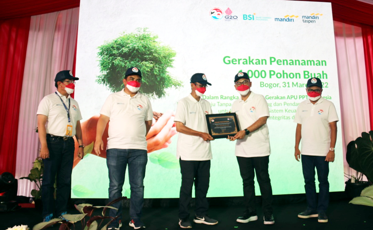 PPATK bersama Mandiri Group yang terdiri dari Bank Mandiri Taspen dan Bank Syariah Indonesia menggelar penanaman pohon dalam rangka HUT 2 Dekade APU PPT di Katulampa, Bogor (31/3).