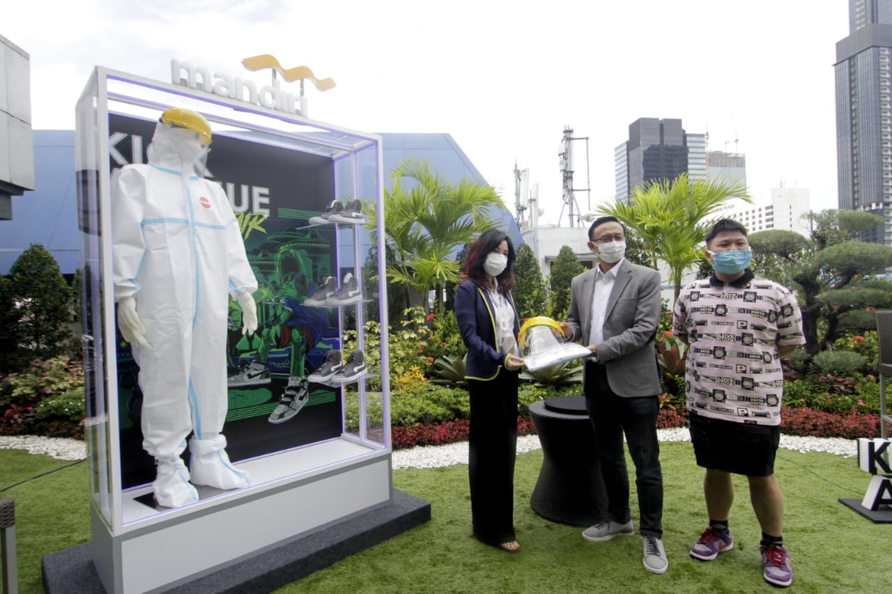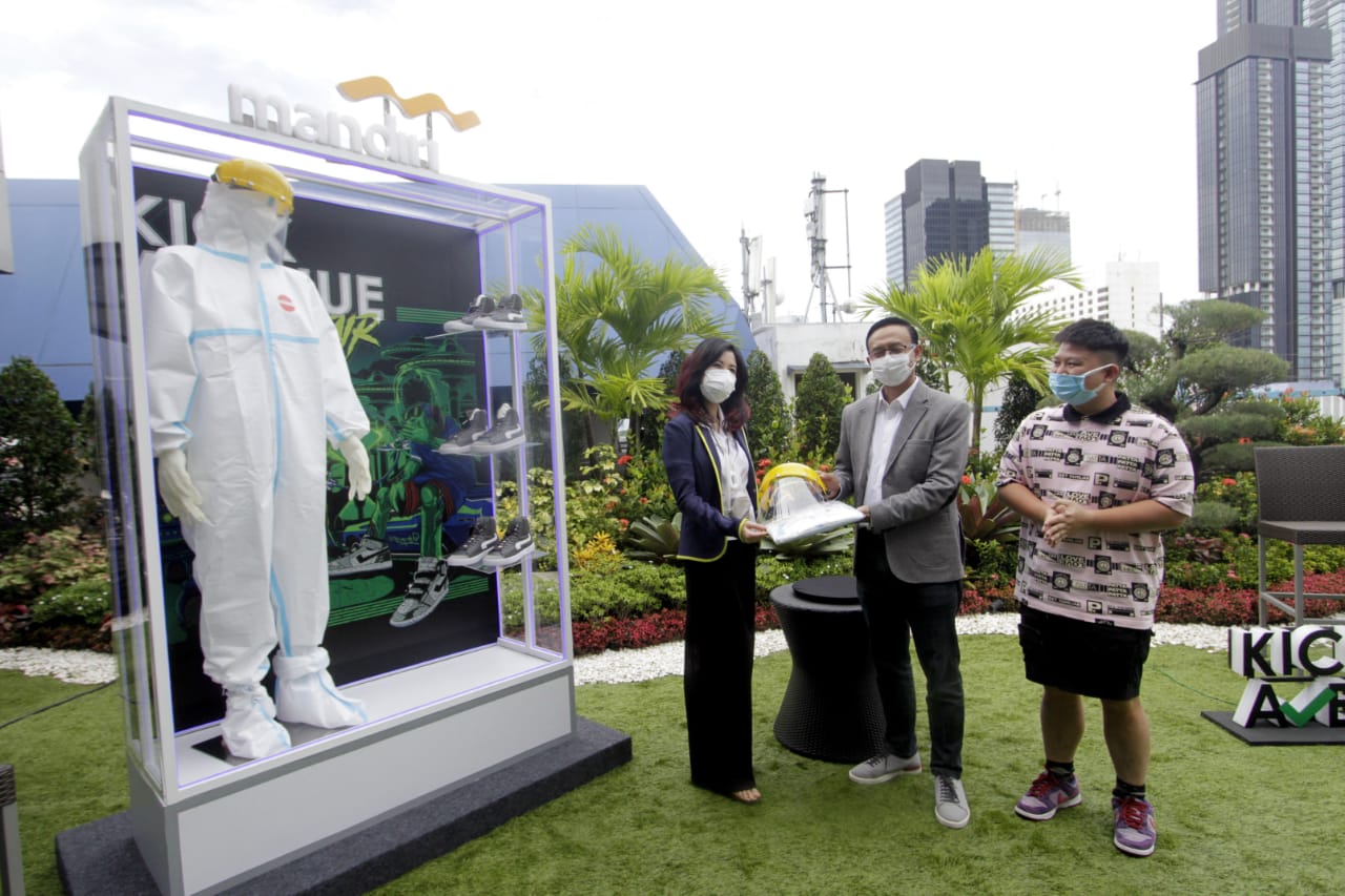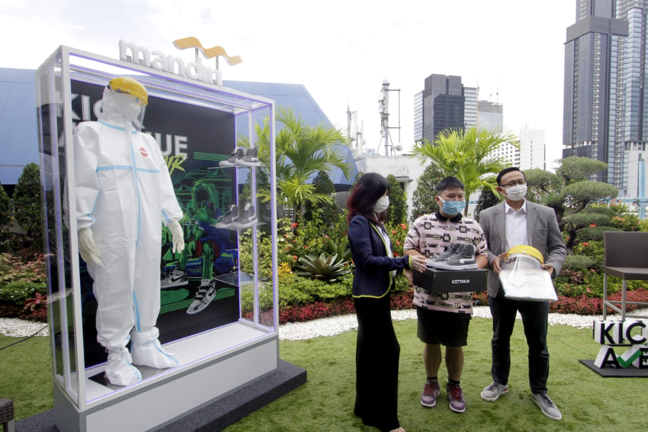 Direktur Jaringan dan Retail Banking Bank Mandiri Aquarius Rudianto (tengah) menyerahkan simbolisasi bantuan APD dan sneakers kepada Influencer Kesehatan dr. Sonia Wibisono (kiri) sebagai perwakilan tenaga kesehatan dengan disaksikan Founder Kick Avenue Jejouw (kanan) di Jakarta, Selasa (15/12). Sebagai rangkaian kegiatan Kick Avenue Fair 2020 yang telah diselenggarakan pada Agustus lalu, Bank Mandiri bersama Kick Avenue menyerahkan donasi 100 set bantuan APD dan 100 pasang sneakers buatan lokal bagi tenaga kesehatan yang berjuang menangani covid-19. Donasi ini diberikan sebagai bentuk kepedulian kepada upaya penanganan covid-19 sekaligus upaya mendorong pemanfaatan produk-produk buatan lokal demi pemulihan ekonomi Indonesia
