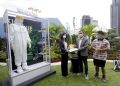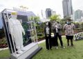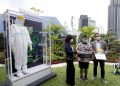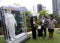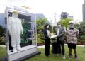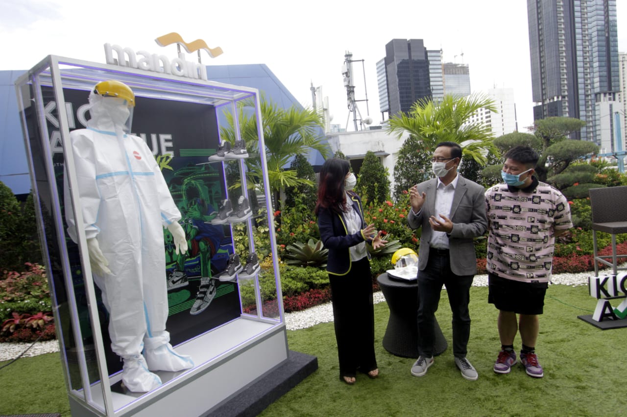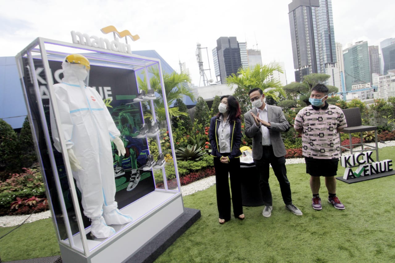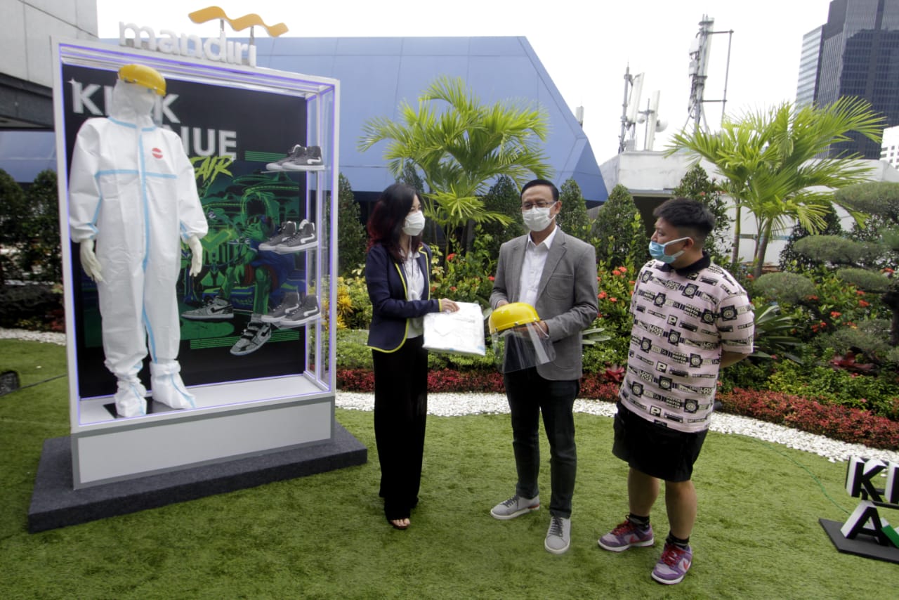 Direktur Jaringan dan Retail Banking Bank Mandiri Aquarius Rudianto (tengah) menyerahkan simbolisasi bantuan APD dan sneakers kepada Influencer Kesehatan dr. Sonia Wibisono (kiri) sebagai perwakilan tenaga kesehatan dengan disaksikan Founder Kick Avenue Jejouw (kanan) di Jakarta, Selasa (15/12). Sebagai rangkaian kegiatan Kick Avenue Fair 2020 yang telah diselenggarakan pada Agustus lalu, Bank Mandiri bersama Kick Avenue menyerahkan donasi 100 set bantuan APD dan 100 pasang sneakers buatan lokal bagi tenaga kesehatan yang berjuang menangani covid-19. Donasi ini diberikan sebagai bentuk kepedulian kepada upaya penanganan covid-19 sekaligus upaya mendorong pemanfaatan produk-produk buatan lokal demi pemulihan ekonomi Indonesia