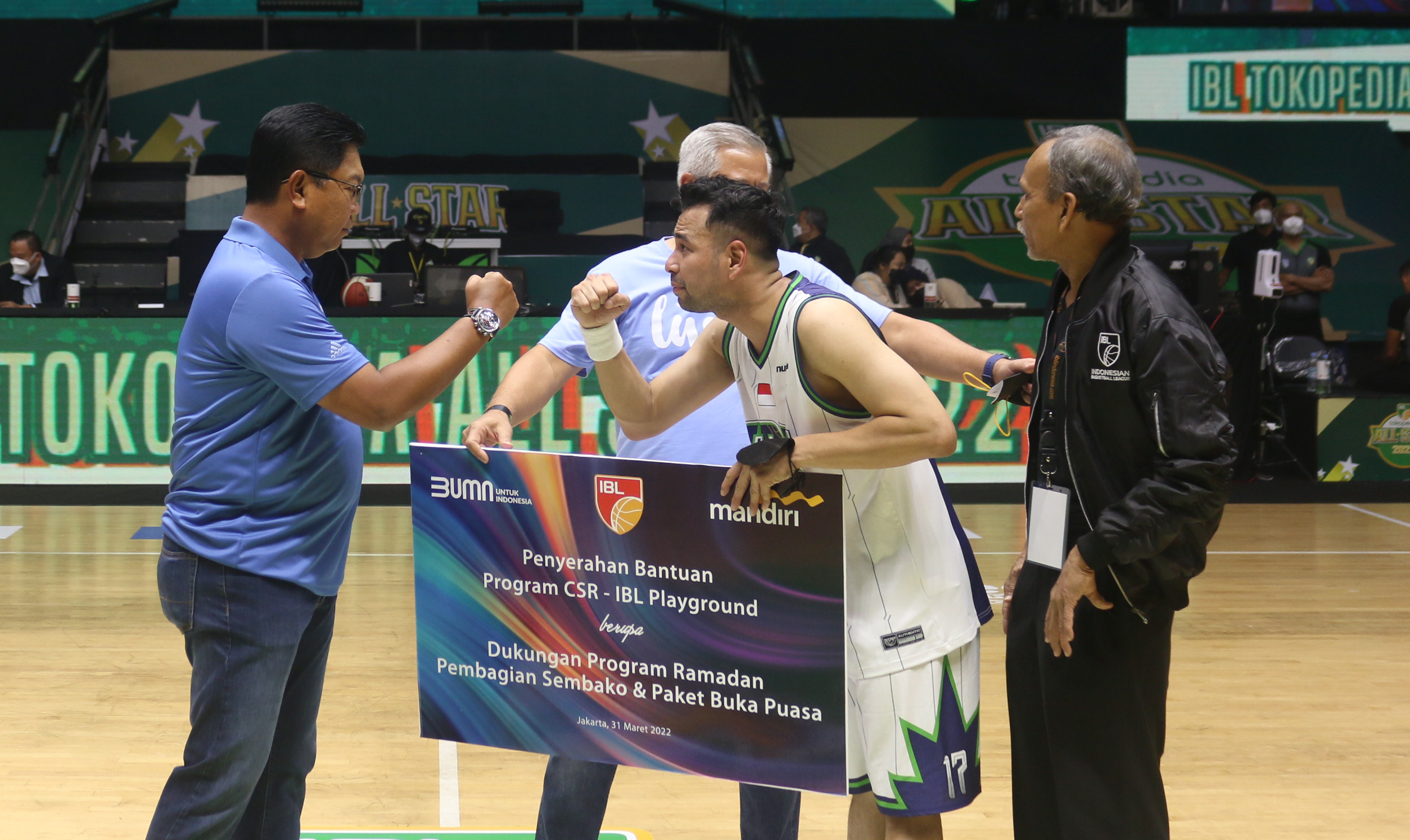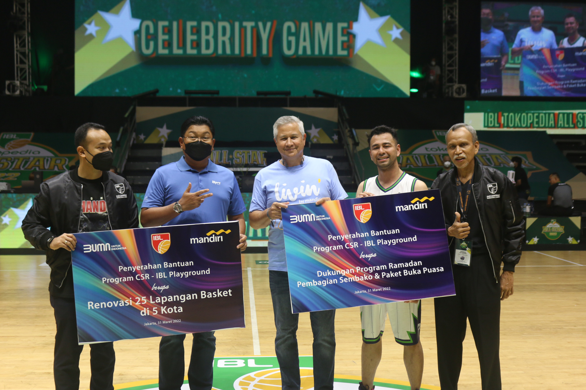 (Kika) Dirut Indonesia Basketball League (IBL) 2022 Junas Miradiarsyah, Dirut Bank Mandiri Darmawan Junaidi, Direktur Hubungan Kelembagaan Bank Mandiri Rohan Hafas, Pemilik Klub RANS PIK Basketball Raffi Ahmad dan Pelatih basket Bambang Hermansyah saat penyerahan bantuan sosial Bank Mandiri di sela-sela penyelenggaraan IBL All Star 2022 di Hall Basket Senayan, Jakarta, Kamis (31/3). Melalui bantuan sosial tersebut, Bank Mandiri membantu renovasi 25 Lapangan Basket umum di 5 kota besar serta mengajak para IBL Players utk berpartisipasi dalam Program Ramadhan Pemberian Sembako kepada masyarakat membutuhkan di berbagai wilayah di Indonesia dan makanan buka puasa bagi masyarakat di wilayah Jabodetabek. Pada perhelatan IBL 2022, Bank Mandiri menjadi salah satu pendukung utama dan terlibat dalam rangkaian kegiatan pengembangan olah raga basket di tanah air, termasuk dukungan kepada timnas bola basket yang akan berlaga di ajang FIBA Asia Cup 2022