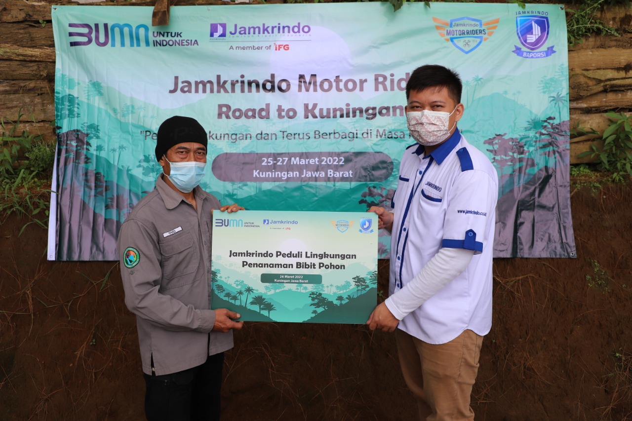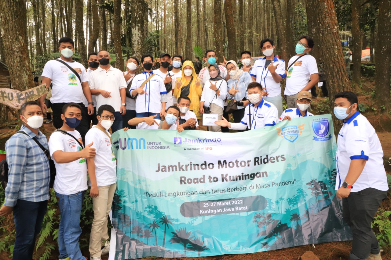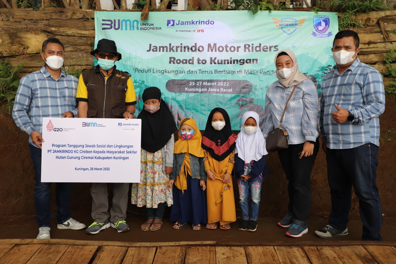 Tim komunitas Jamkrindo Motor Riders (JMR) di bawah pengelolaan Badan Penyelenggara Olahraga dan Seni (Baporsi) PT Jamkrindo melakukan kegiatan sosial melalui kegiatan Tanggung Jawab Sosial dan Lingkungan (TJSL). di Kuningan, Jawa Barat pada Sabtu 26 Maret 2022.