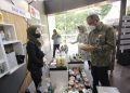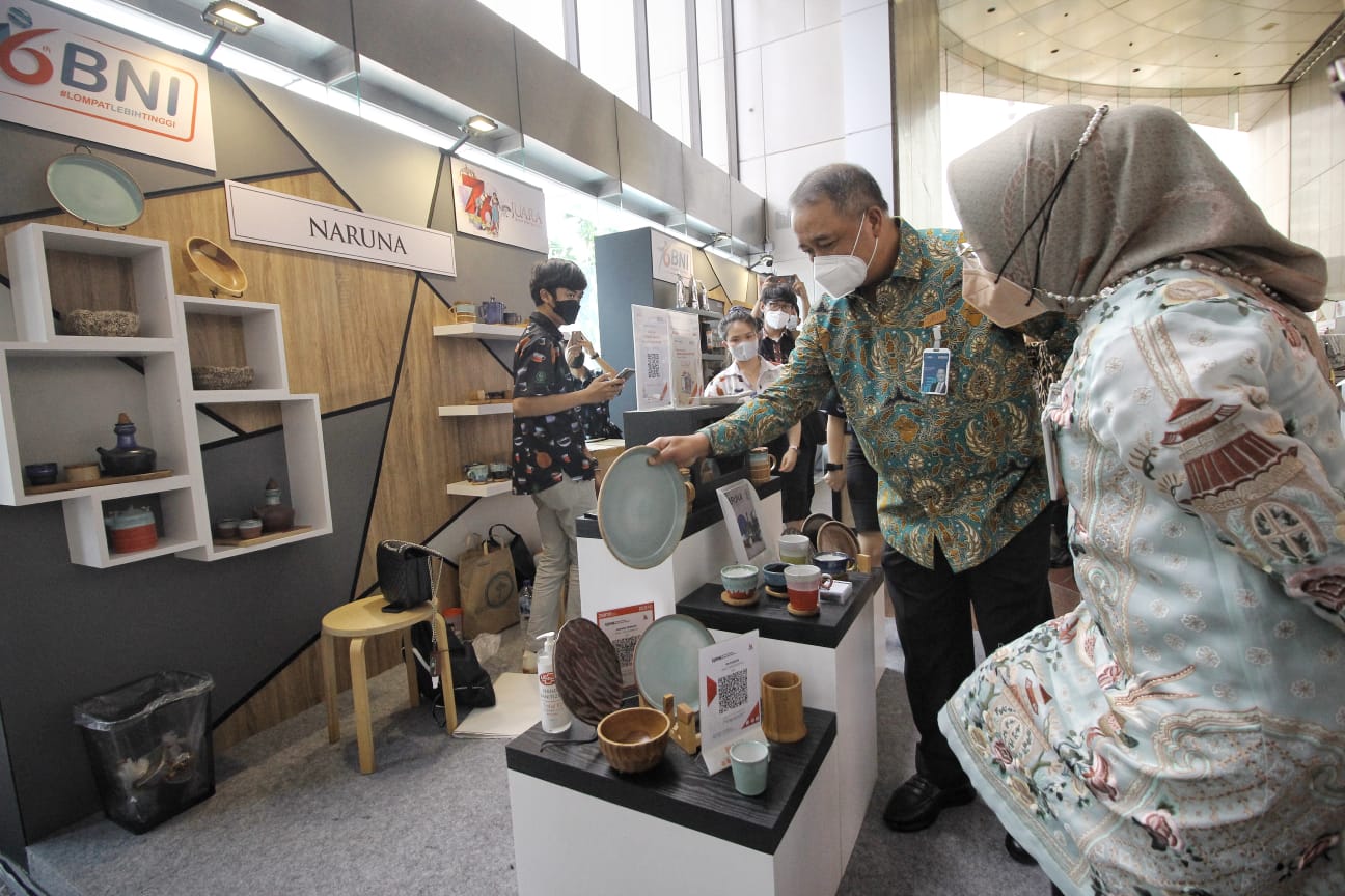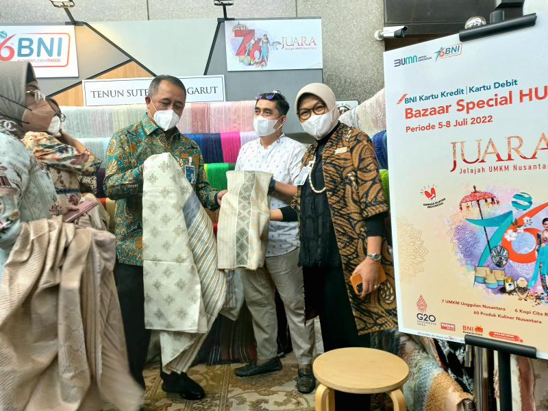 Direktur Utama BNI Royke Tumilaar (tengah) dan Wakil Direktur Utama BNI Adi Sulistyowati bersama direksi lainnya dalam meninjau UMKM Binaan pada Bazaar Spesial HUT BNI dengan Tema “Jelajah UMKM Nusantara atau JUARA”,di Jakarta, Selasa (5/7/2022). BNI memanfaatkan momentum keceriaan HUT Ke-76 BNI untuk menekankan kembali semangat Go Produktif, Go Global, dan Go Digital dalam upaya bersama untuk mendorong UMKM naik kelas dengan memanfaatkan solusi digital serta kesempatan ekspor ke luar negeri.