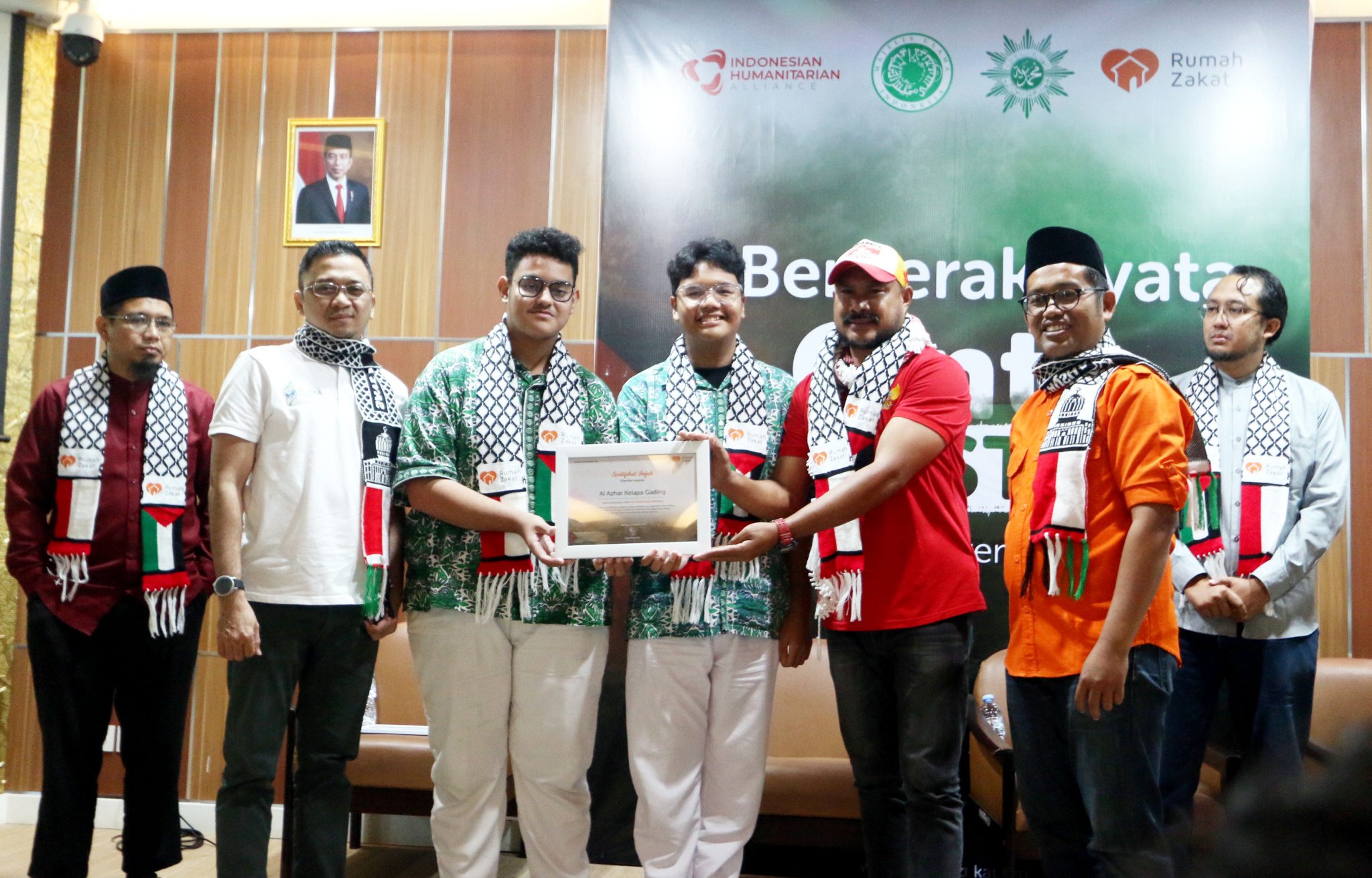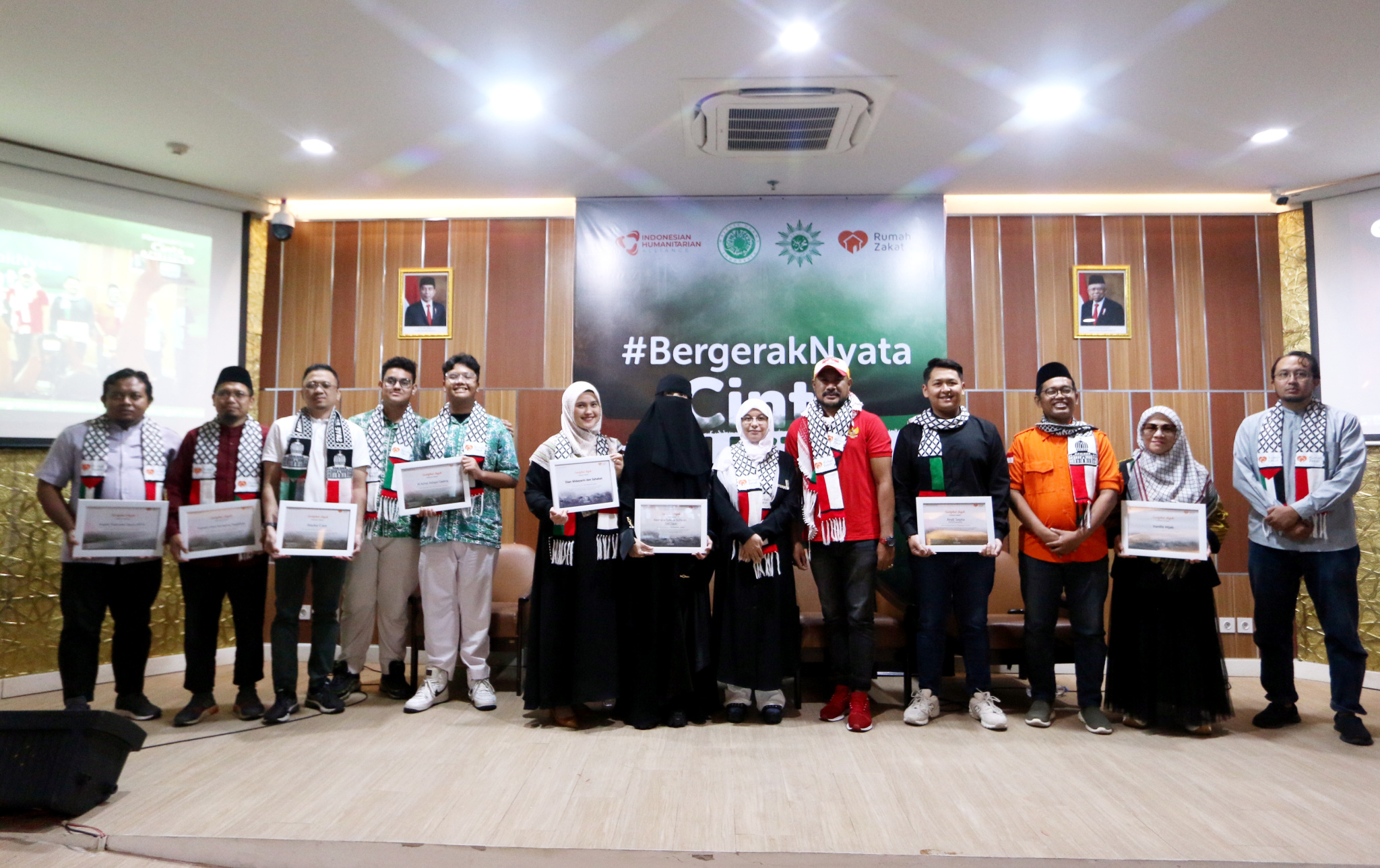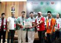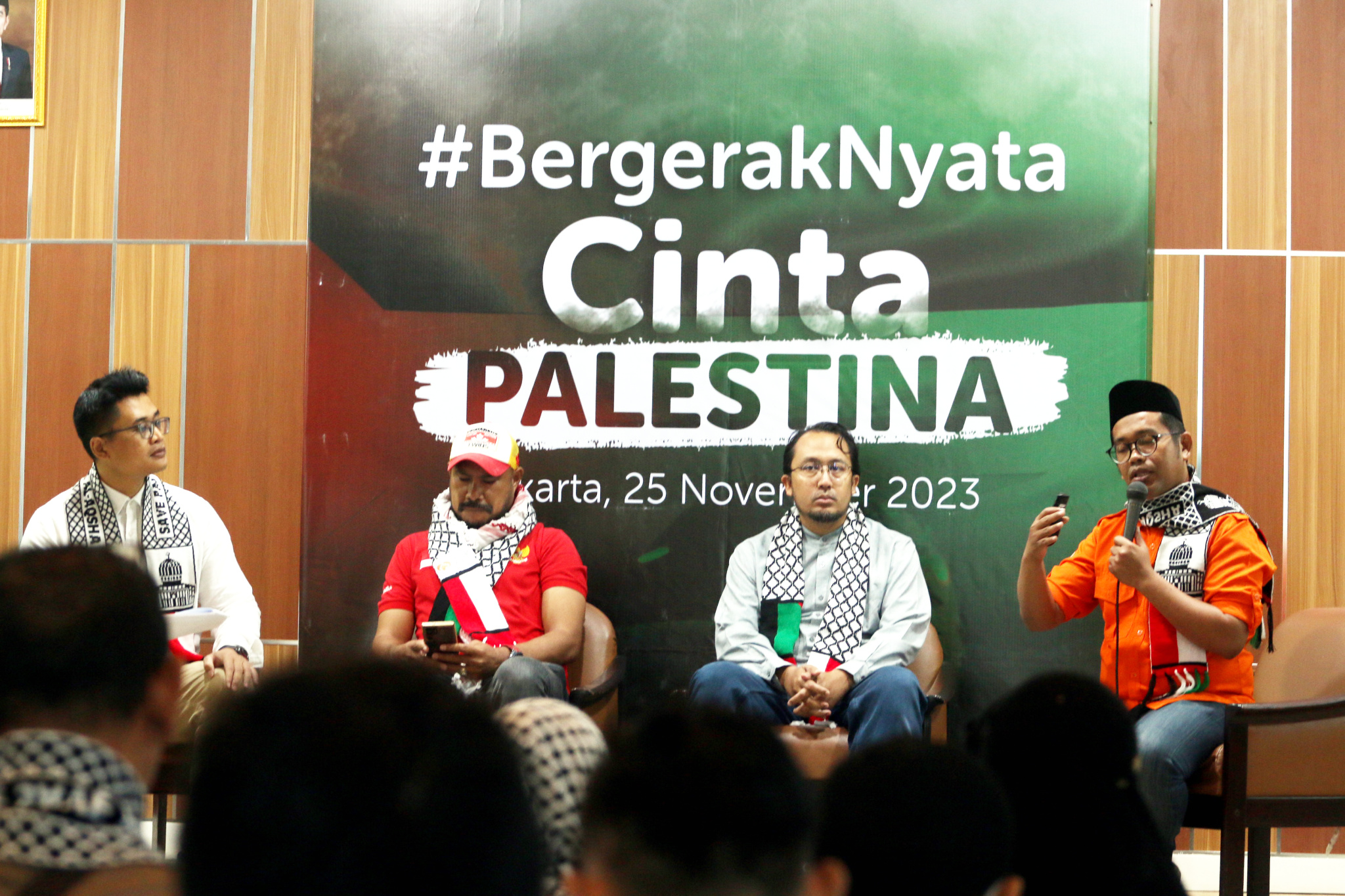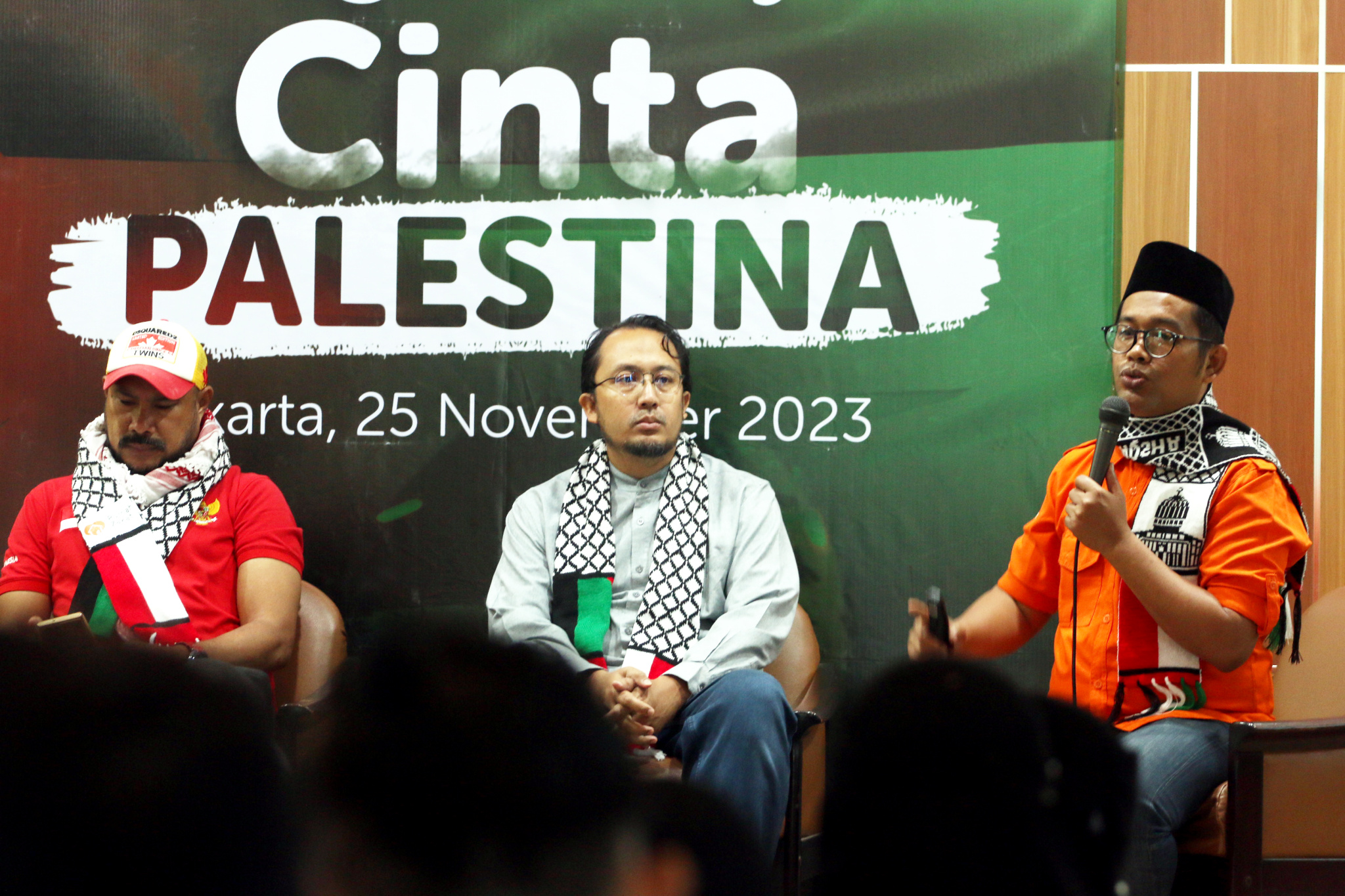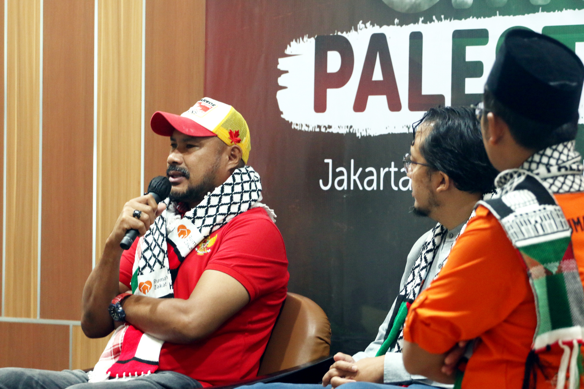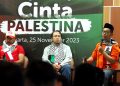Chief Marketing Officer Rumah Zakat Didi Sabir (kanan), Humanitarian Dept Head Rumah Zakat Andri Murdianto (tengah), dan relawan kemanusiaan Indonesia Abdullah Onim (kiri) menghadiri konferensi pers yang bertajuk “#BergerakNyata Cinta Palestina” di Jakarta, Sabtu (25/11/2023). Masa gencatan senjata yang berlangsung empat hari hingga 26 November dimaksimalkan Rumah Zakat untuk mendistribusikan bantuan berupa pakaian hangat untuk 180 jiwa, 4.000 paket makanan hangat, 600 paket keranjang makanan, juga ratusan 200 paket obat obatan untuk masyarakat Gaza.