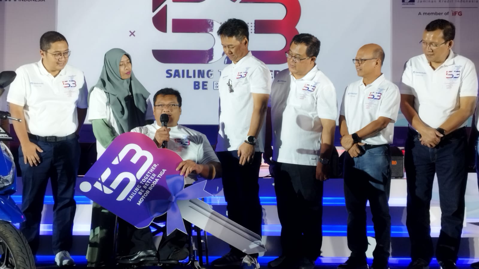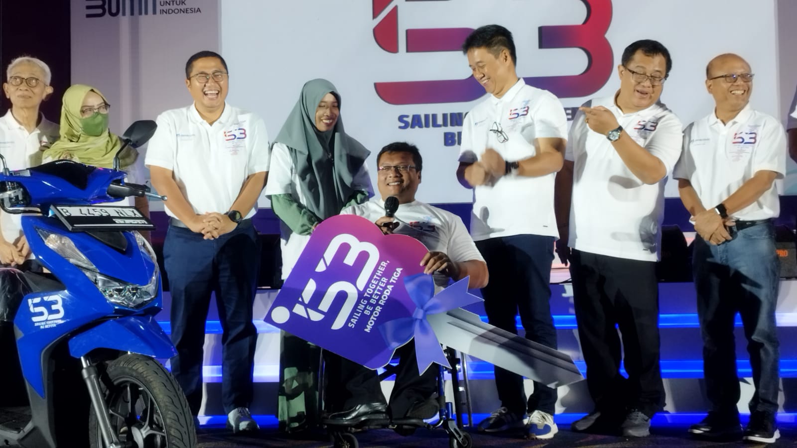 Perayaan HUT KE 53 PT Jamkrindo memberikan bantuan 3 unit motor roda 3 untuk disabilitas kepada 3 orang yang diwakili secara simbolis kepada Adi Mulyanto penyandang diaabilitas akibat penyakit Polio
