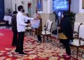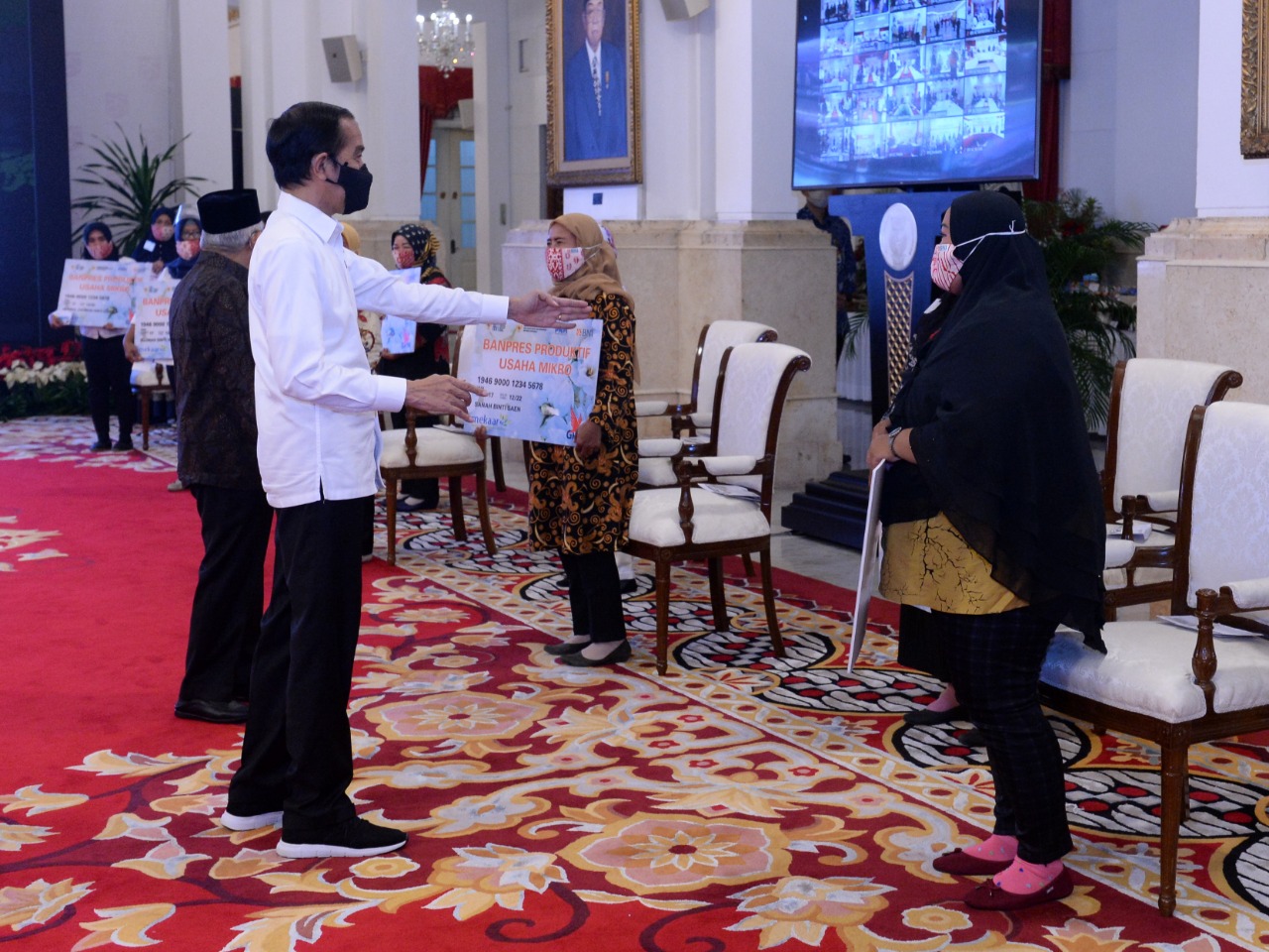Presiden RI Joko Widodo (kedua kanan) dan Wakil Presiden RI Ma’ruf Amin (kanan) berbincang-bincang dengan para penerima Bantuan Presiden (Banpres) Produktif bagi pelaku usaha mikro di Jakarta, Senin (24 Agustus 2020). BNI *dan BRI* dipercaya oleh Kementerian Koperasi dan UKM untuk menyalurkan Banpres Produktif bagi pelaku usaha mikro yang merupakan nasabah PNM Mekaar dengan jumlah sebesar Rp 2.400.000 per orang.