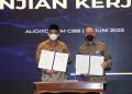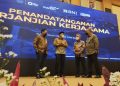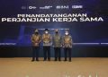 (Ki-ka) Dirut Mandiri Darmawan, Dirjen Pajak Suryo Utomo, Dirut BRI Sunarso, dan Dirut BNI Royke Tumilaar usai penandatanganan Kerjasama Peningkatan Pelayanan Nasabah Antara DJP dengan Mandiri, BNI, dan BRI, Selasa (28/6/2022). BNI selaku agen pembangunan berupaya proaktif dalam mendukung program-program yang diamanatkan pemerintah yang salah satunya meningkatkan pelayanan perpajakan demi mendukung penerimaan negara.