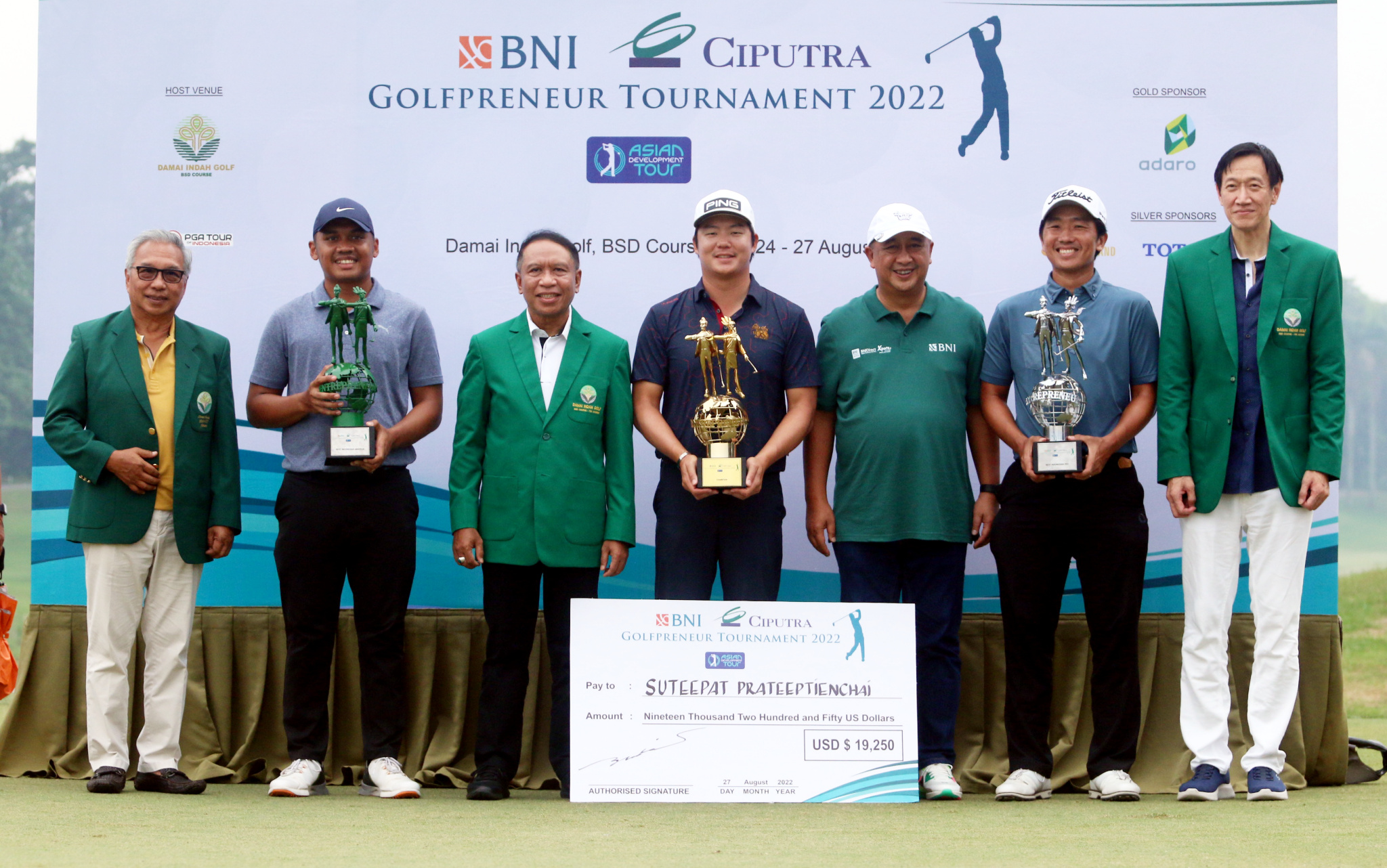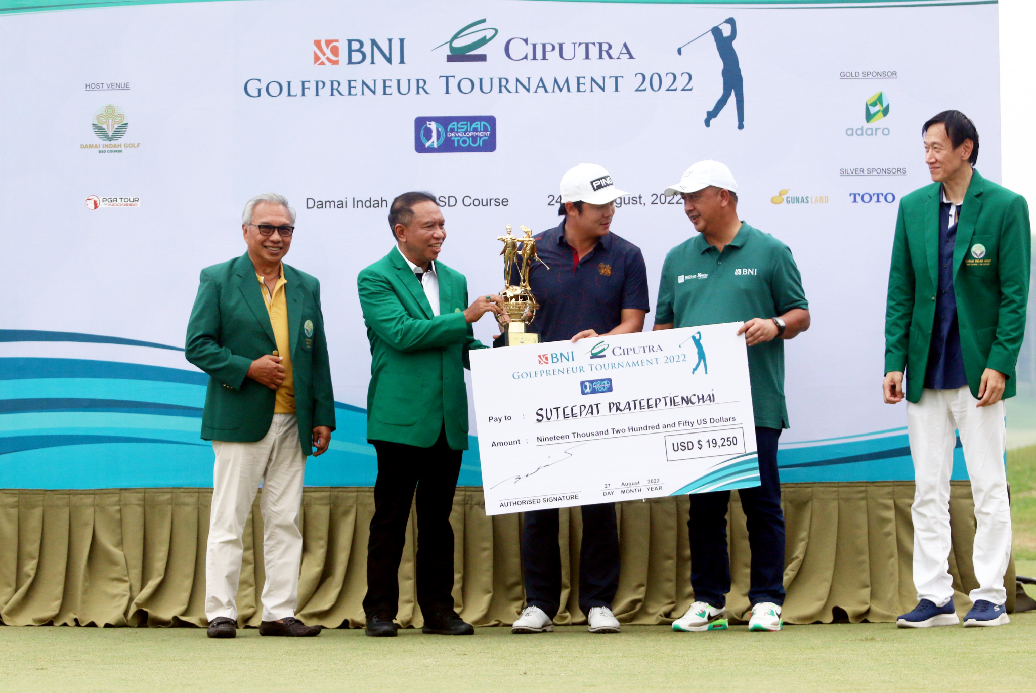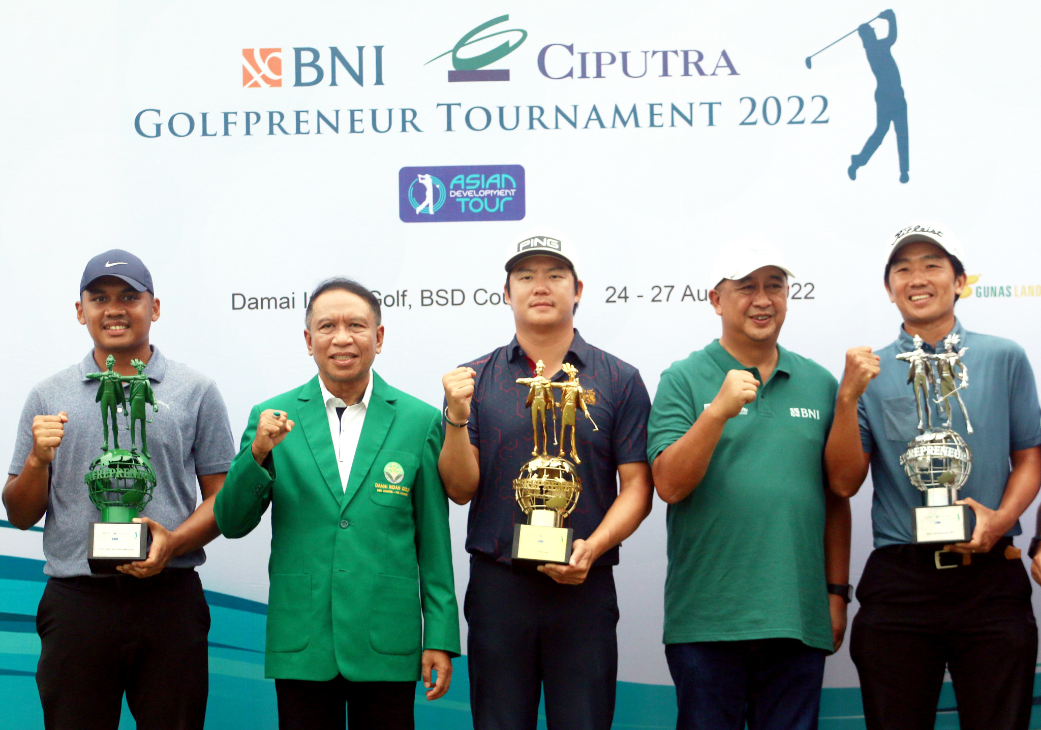 (ki-ka) Managing Director of Ciputra Group Budiarsa Sastarawinata, Mathew Lumbantoruan, Menteri Pemuda dan Olahraga Zainudin Amali, Suteepat Praateeptienchai, Direktur Utama BNI Royke Tumilaar, Goerge Gandranata, Managing Director Ciputra Group Candra Ciputra dalam penutupan kompetisi BNI-Ciputra Golfpreneur Tournament 2022 Asian Development Tour di Damai Indah Golf, BSD Course, Tangerang Selatan, Sabtu (27/8/2022).