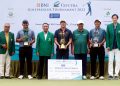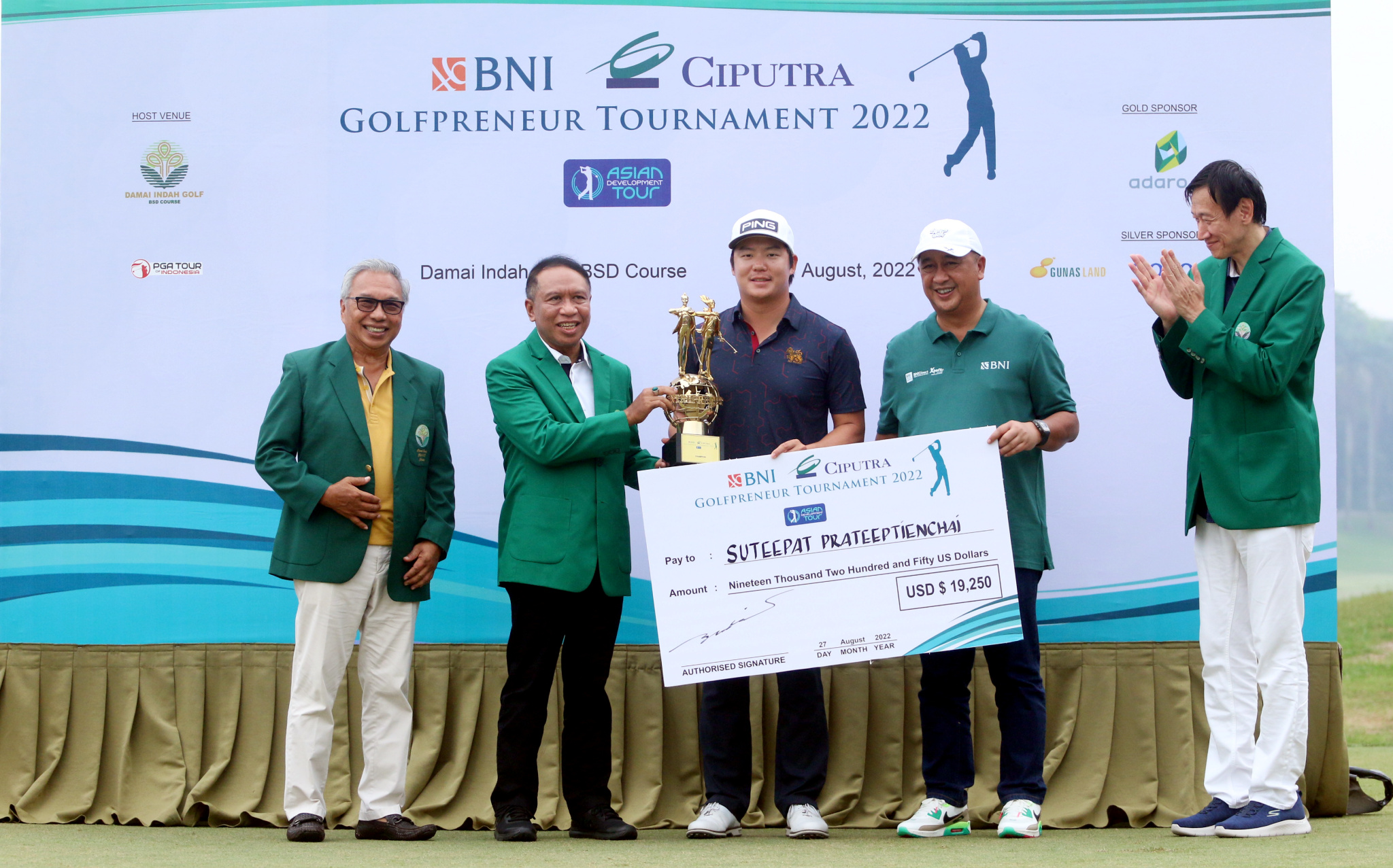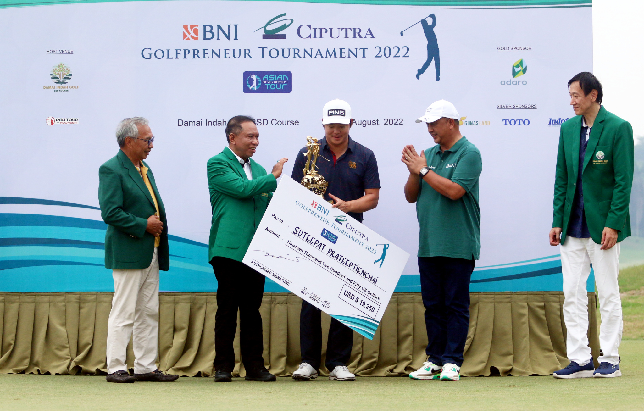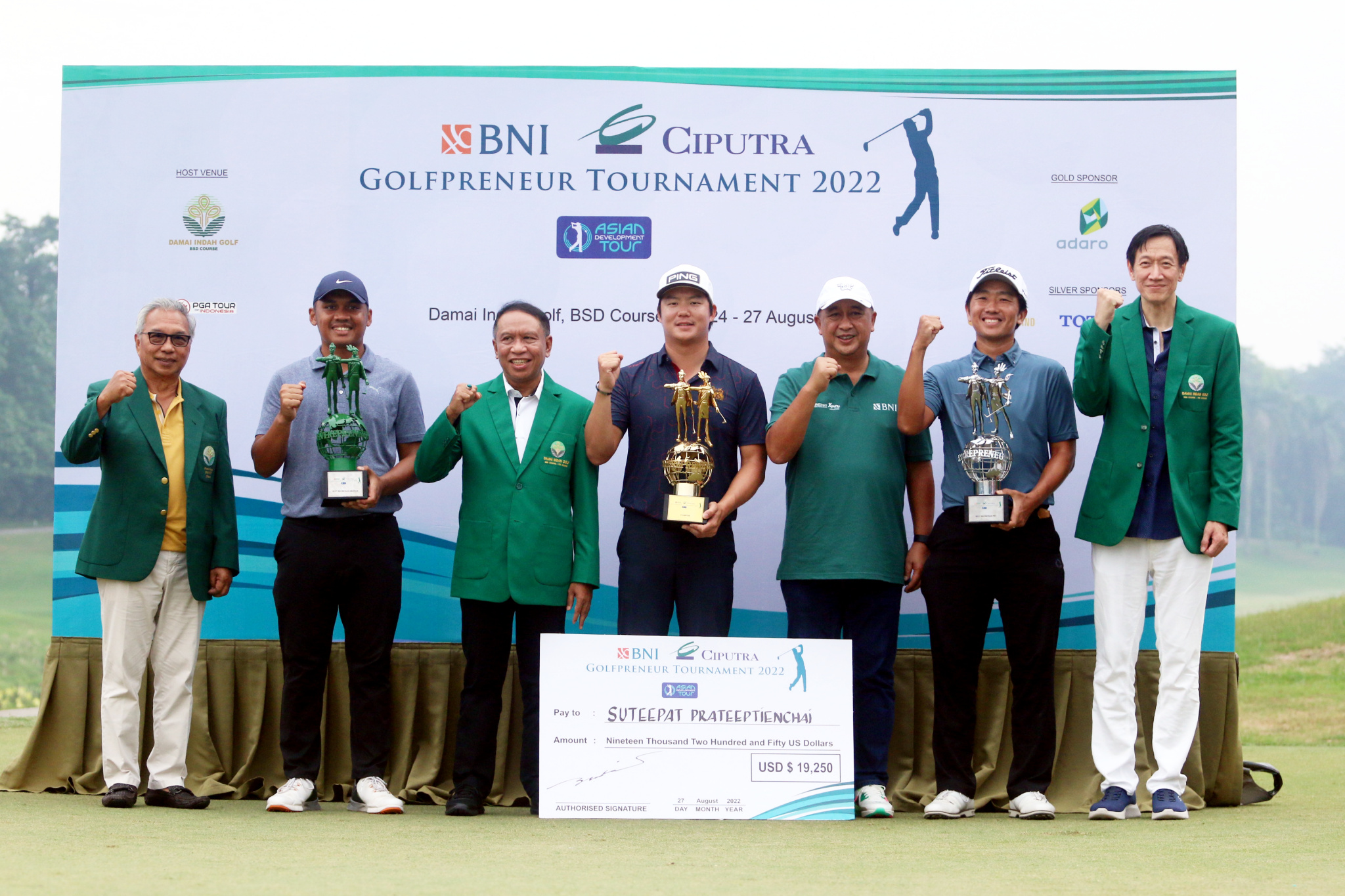 (ki-ka) Managing Director of Ciputra Group Budiarsa Sastarawinata, Mathew Lumbantoruan, Menteri Pemuda dan Olahraga Zainudin Amali, Suteepat Praateeptienchai, Direktur Utama BNI Royke Tumilaar, Goerge Gandranata, Managing Director Ciputra Group Candra Ciputra dalam penutupan kompetisi BNI-Ciputra Golfpreneur Tournament 2022 Asian Development Tour di Damai Indah Golf, BSD Course, Tangerang Selatan, Sabtu (27/8/2022).