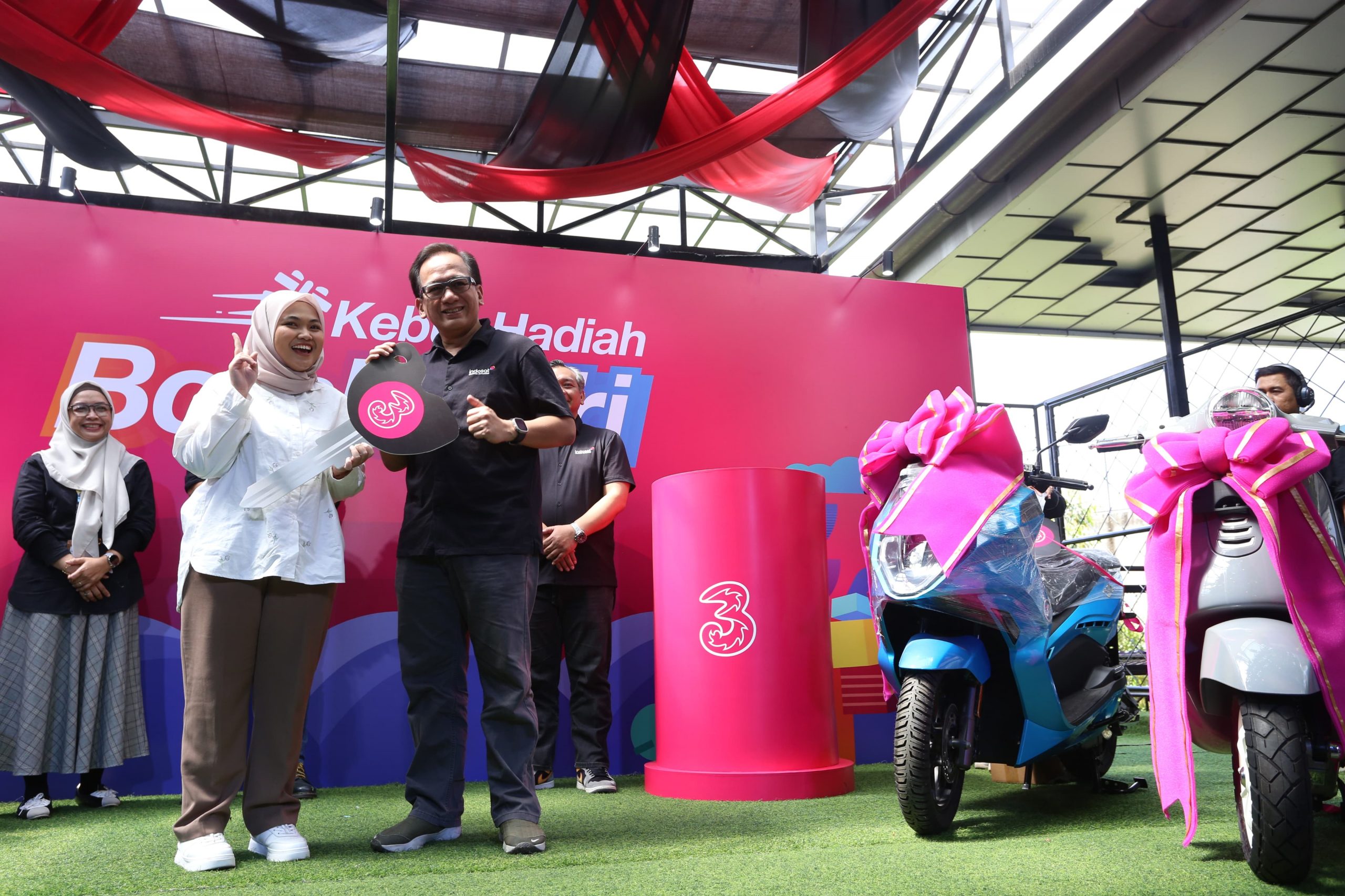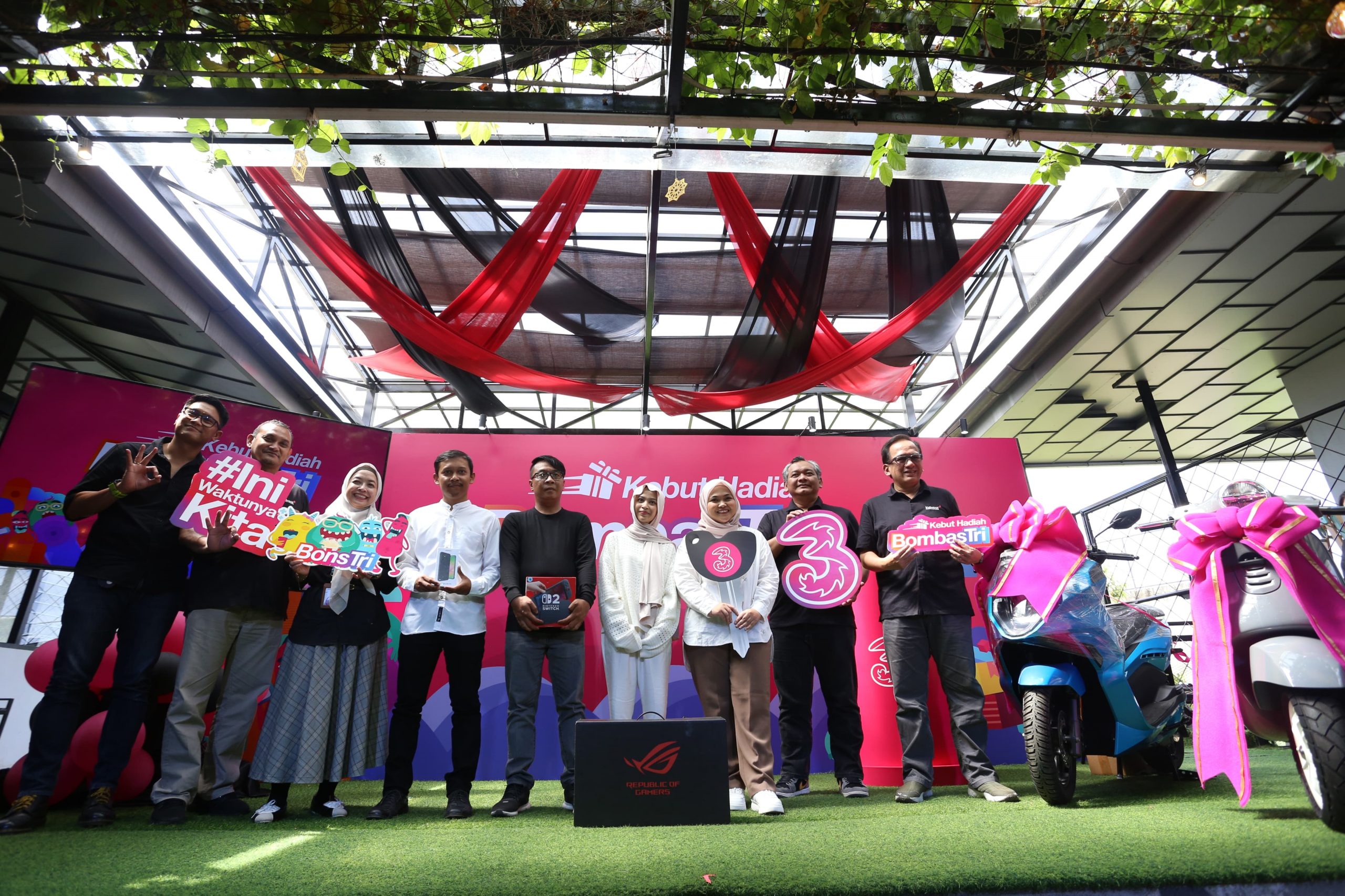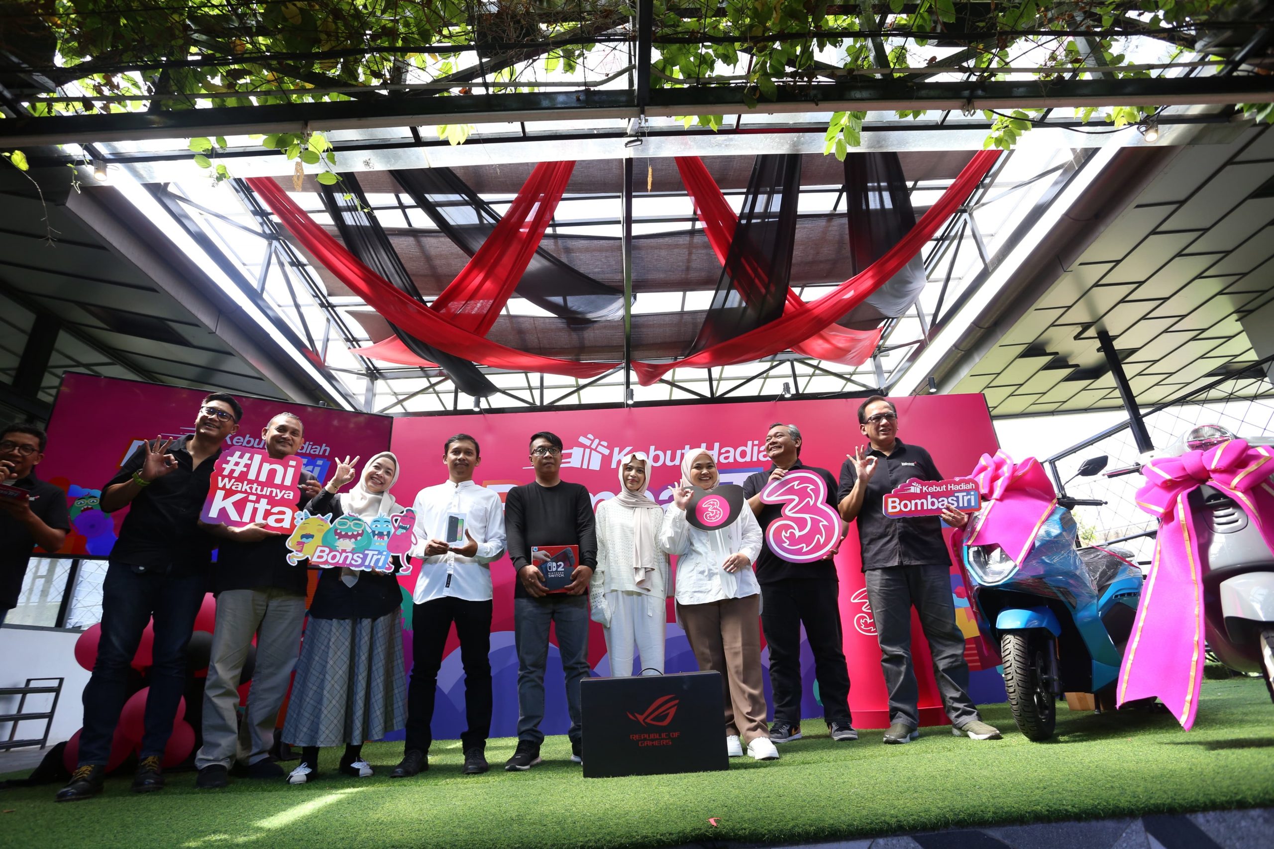Shatya Framudia SVP Head of Region Inner Jakarta (paling kiri), Budi Priyambodo VP Head of Sales Inner Jakarta West Tri (kedua dari kiri), WIda Utari VP Head of Retail Jakarta Raya (ketiga dari kiri), Roy Wibowo VP Head of Marketing Jakarta Raya (kedua dari kanan) dan Eric Danari SVP Head of Region Outer Jakarta (paling kanan) bersama para pemenang BombasTri. Tri menghadirkan program BombasTri dengan konsep “Serbu Hadiahnya, Double Kesempatannya” yang berlangsung pada periode 1 September hingga 31 Desember 2025. Program ini menjadi bentuk apresiasi atas kepercayaan pelanggan yang terus memilih Tri untuk tetap terhubung setiap hari.