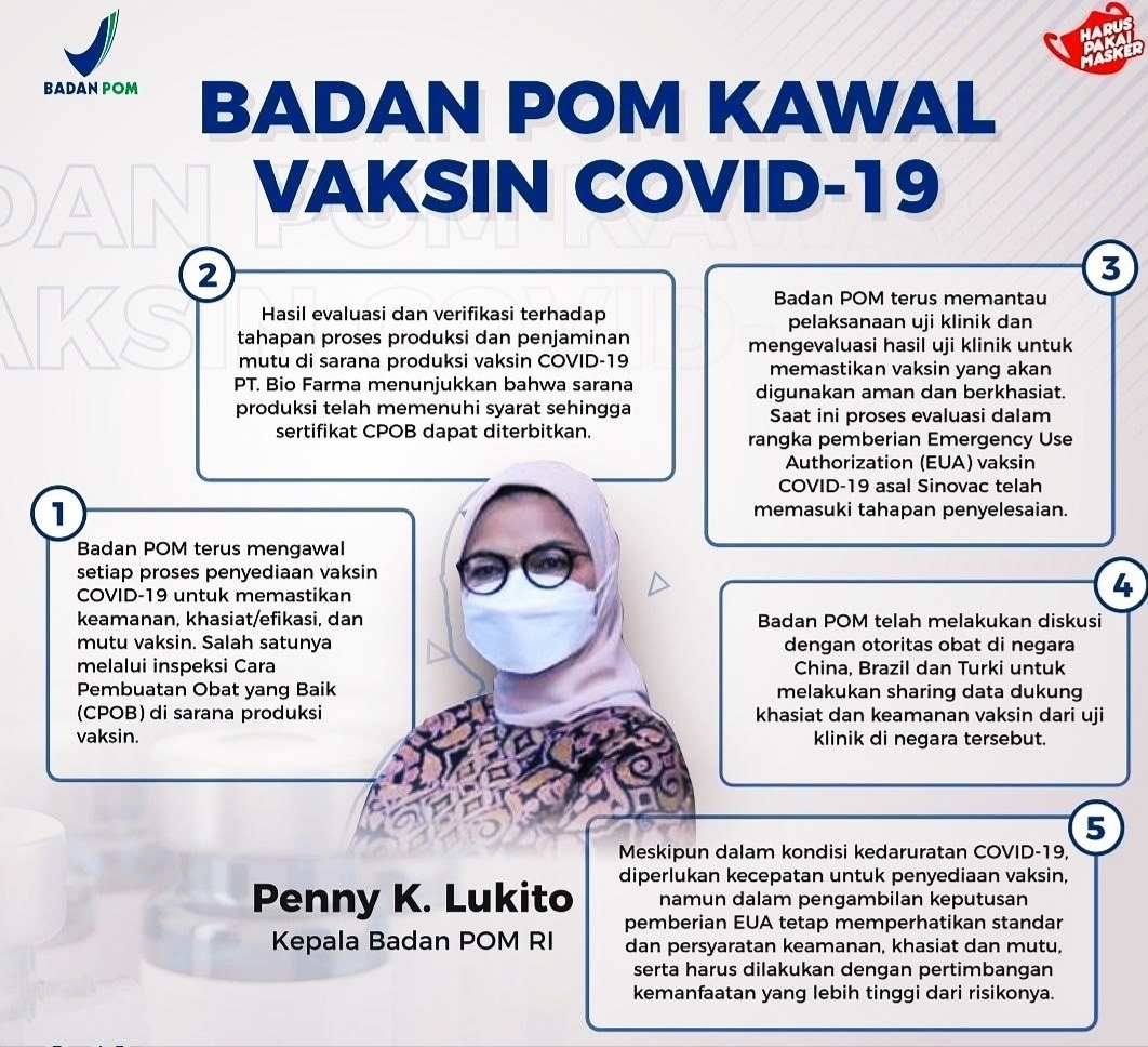 “Untuk evaluasi terhadap khasiat atau efikasi Coronavac, Badan POM menggunakan data dan analisis dari uji klinik yang dilakukan di Indonesia dan juga mempertimbangkan hasil uji klinik di Brazil dan Turki,” ujarnya.