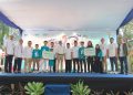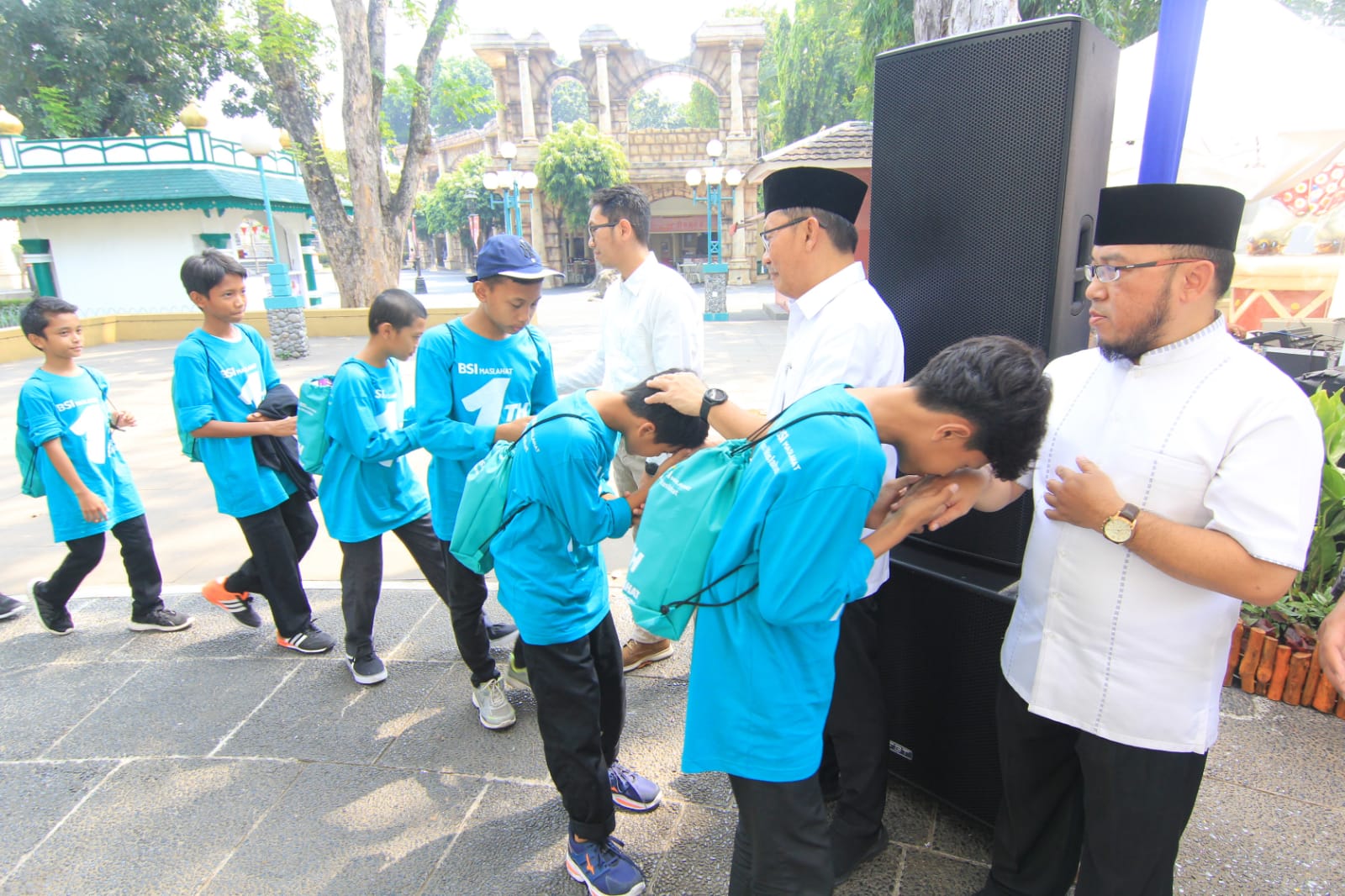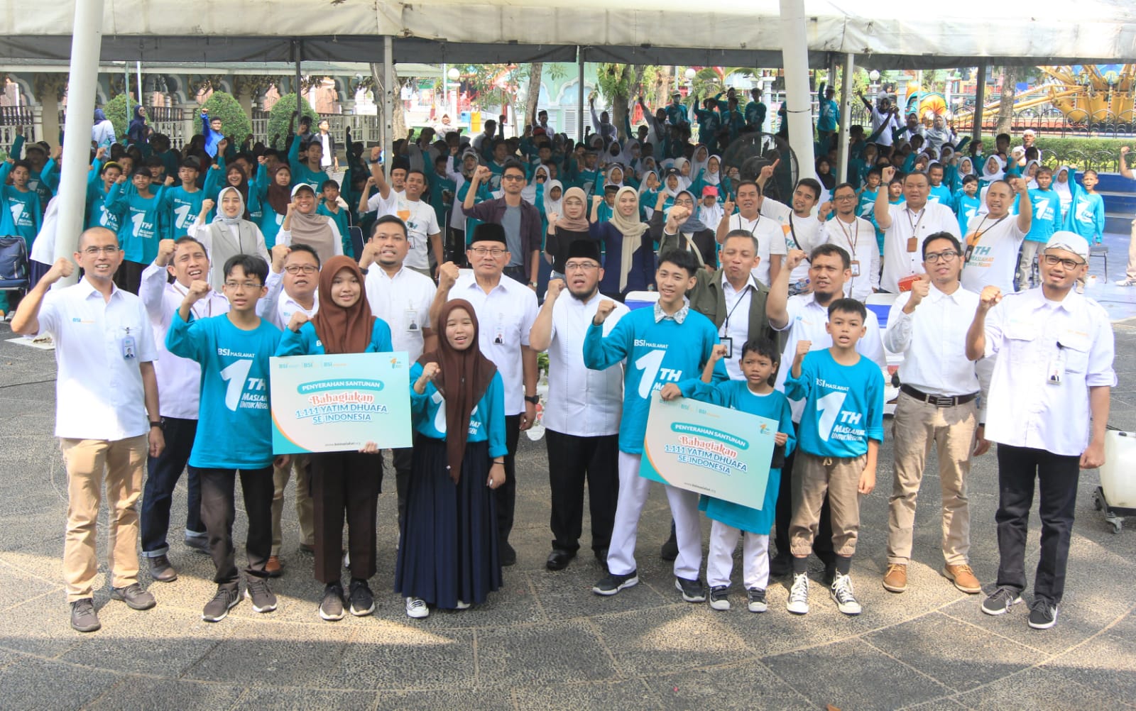 Direktur Eksekutif BSI Maslahat, Sukoriyanto Saputro (keempat kanan); bersana Sekretaris UPZ BSI, Aris Widi Setiawan (keempat kiri) berfoto usai melakukan Penyerahan Santunan Bahagiakan 1.111 Yatim Dhuafa Se-Indonesia, di Dufan, Ancol, Jakarta, (10/8).