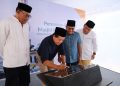 Direktur Utama BSI Hery Gunardi (kiri kedua) saat pendatangan prasasti peresmian renovasi disaksikan Ketua Masjid Agung Nurul Falaq Labuan Bajo Ali Imran (kiri pertama), Bupati Manggarai barat, Nusa Tenggara Timur Edistasius Endi (kanan kedua) dan Wakil Direktur Utama BSI Bob Tyasika Ananta (kanan pertama) di halaman Masjid Agung Nurul Falaq Labuan Bajo, Jumat (15/12).