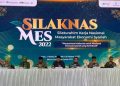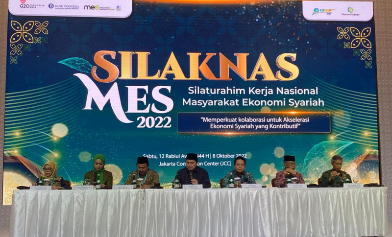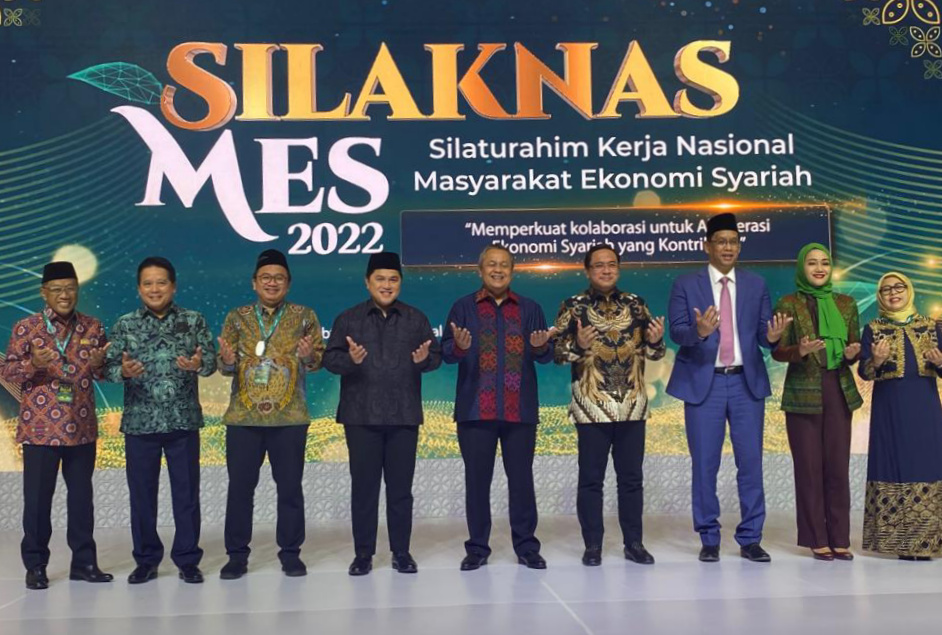 (ki-ka) Ketua III PP, MES Firdaus Djaelani, Direktur Utama PT Bank Syariah Indonesia Tbk Hery Gunardi (Bendahara Umum PP MES), Sekretaris Jenderal PP MES Iggi Achsien, (Ketua Umum PP MES) Menteri BUMN Erick Thohir, Gubernur Bank Indonesia (Ketua Dewan Pakar PP MES) Perry Warjiyo, Wakil Ketua Dewan Pembina PP MES Agung Firman Sampurna, Ketua Dewan Komisioner LSP (Wakil Ketua Dewan Pakar PP MES) Purbaya Yudhi Sadewa, Anggota Dewan Komisioner OJK (Ketua IV PP MES) Friderica Widyasari Dewi, Bendahara III PP MES Siti Ma’rifah. Berfoto bersama di sela sela acara Silaturahmi Kerja Nasional Masyarakat Ekonomi Syariah (MES) 2022 di Jakarta, Senin (10/10). BSI mendukung inisiatif program Global Halal Hub dan berkomitmen memperkuat sinergi dengan Bank Indonesia serta berbagai Lembaga/institusi lain untuk mendukung percepatan dan penguatan ekosistem Global Halal Hub sehingga dapat mendorong pertumbuhan ekonomi Indonesia secara berkelanjutan.