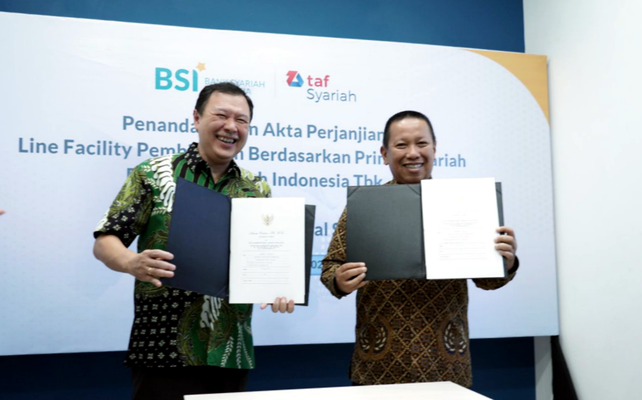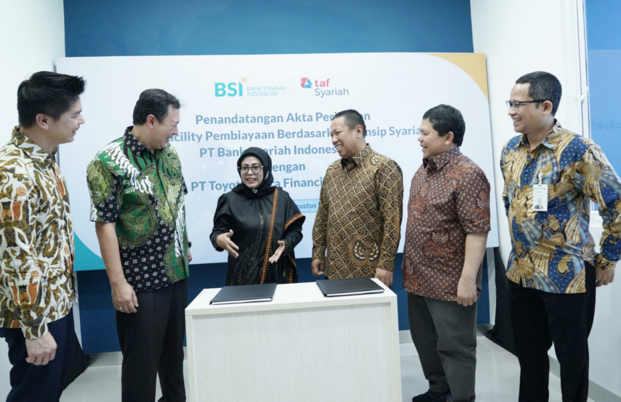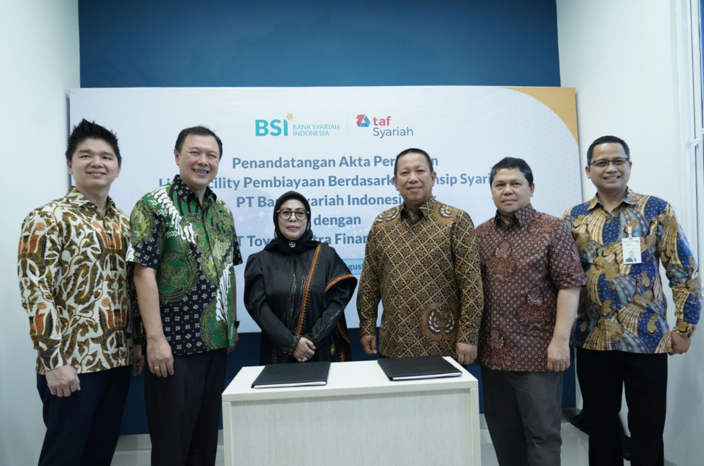 (ki-ka) PKS dihadiri oleh Direktur Sales & Marketing PT Toyota Astra Finance Syariah (TAFS) Budi Setiawan, Presiden Direktur TAFS Agus Prayitno, Dewan Pengawas Syariah TAFS Siti Ma’rifah, Direktur Wholesale & Transaction Banking BSI Zaidan Novari, SVP Corporate Business BSI Buyung I Lukman dan RCEO BSI Aceh Wisnu Sunandar. Banda Aceh (2/8). PT Bank Syariah Indonesia Tbk (BSI) siap mendorong akselerasi pembiayaan di segmen korporasi di berbagai sektor industri guna meningkatkan perekonomian syariah di wilayah Aceh. Kali ini, BSI menggandeng Toyota Astra Finance Syariah melalui kerjasama pembiayaan modal kerja berdasarkan prinsip syariah senilai Rp1,5 triliun.