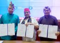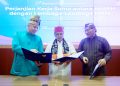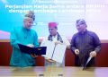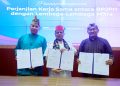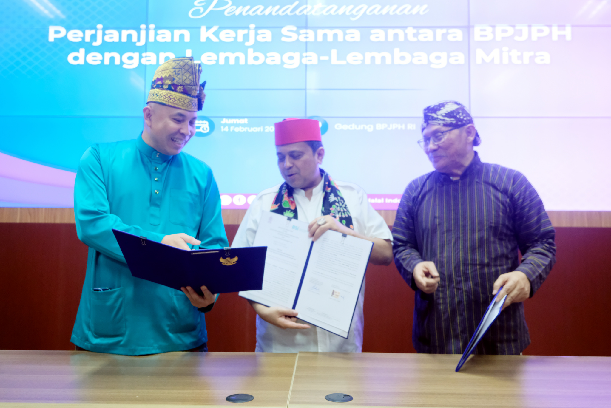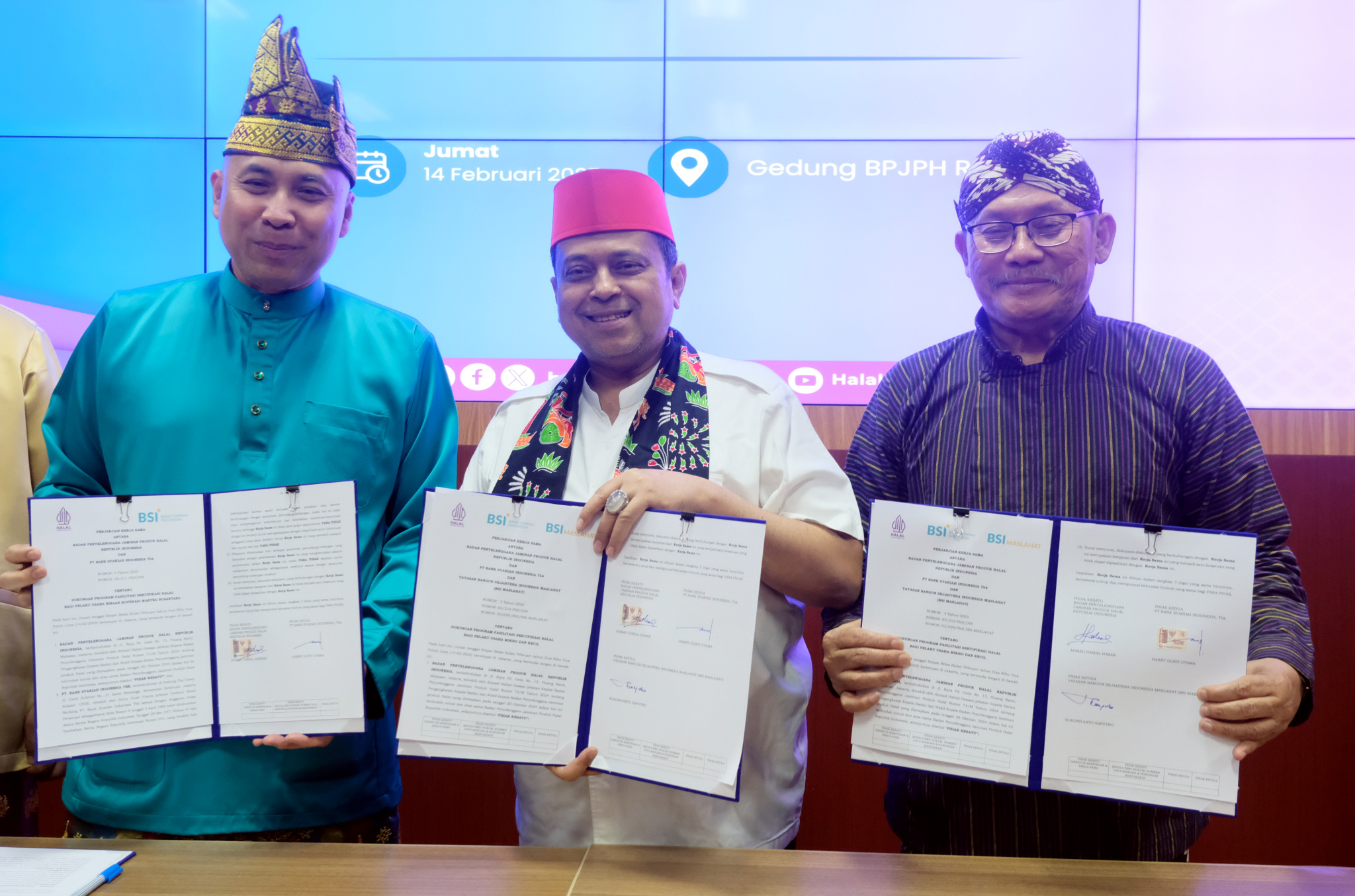 Direktur Retail Banking BSI Harry Gusti Utama (kiri), Kepala BPJPH Ahmad Haikal Hasan (tengah) dan Direktur Eksekutif BSI Maslahat Sukoriyanto Saputro (kanan) di Kantor BPJPH berbincang usai penandatanganan kerja sama di Jakarta,Jumat (14/2). PT Bank Syariah Indonesia Tbk. (BSI) dan Badan Penyelenggara Jaminan Produk Halal (BPJPH) berkolaborasi mendorong percepatan sertifikasi halal bagi pelaku UMKM dan pengusaha industri makanan minuman. Melalui kerja sama ini juga, perseroan memfasilitasi 10.000 sertifikasi halal self declare bagi para pelaku usaha.