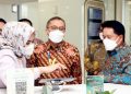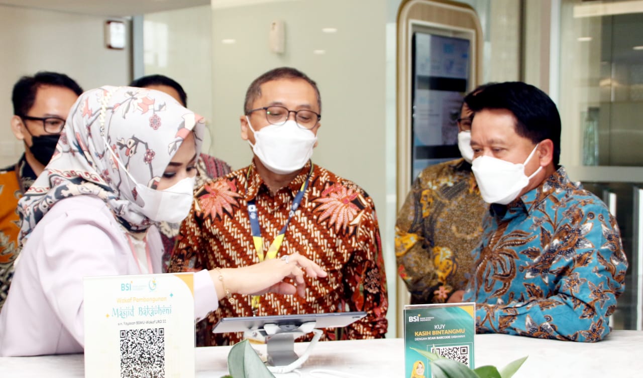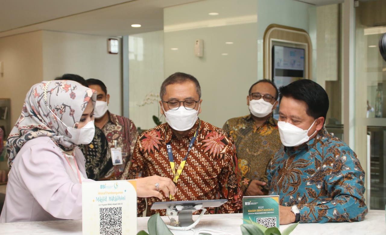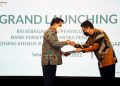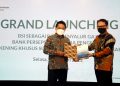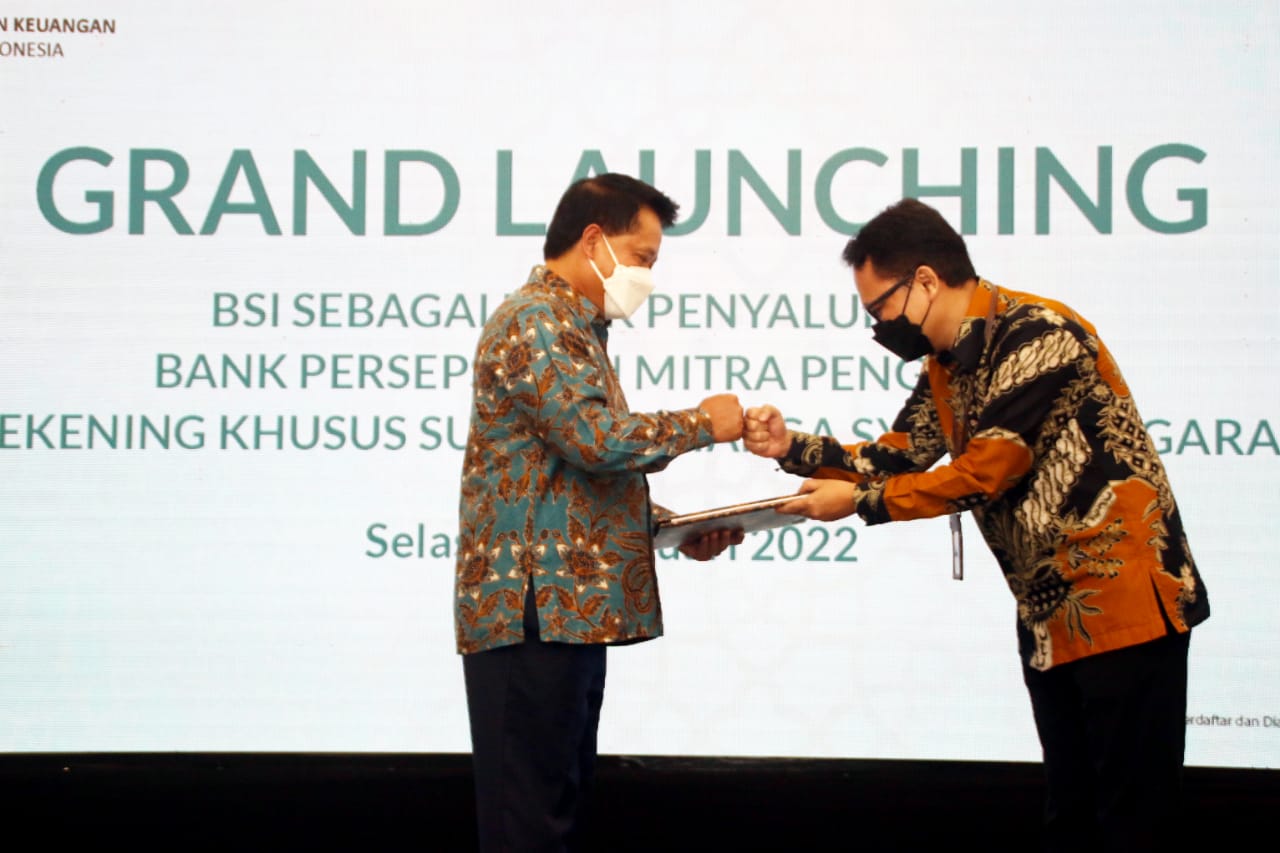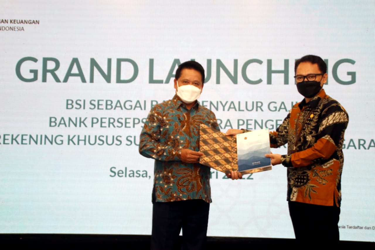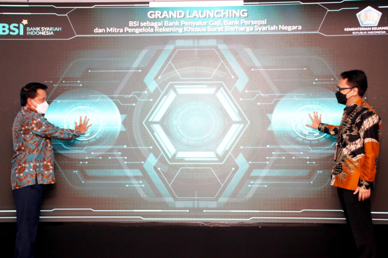 Direktur Utama PT Bank Syariah Indonesia Tbk (BSI) Hery Gunardi (kiri) bersama Direktur Pengelolaan Kas Negara Direktur Pengelolaan Kas Negara Kementerian Keuangan RI Noor Faisal Achmad (kanan) menekan layar secara simbolis saat peluncuran BSI sebagai bank penyalur gaji, bank persepsi dan mitra pengelola rekening khusus surat berharga syariah negara (SBSN) di Jakarta, Selasa (11/1/2022). Tiga layanan transaksi di lingkungan lembaga negara tersebut merupakan bentuk peran aktif BSI dalam mendukung pembangunan ekonomi keuangan syariah.